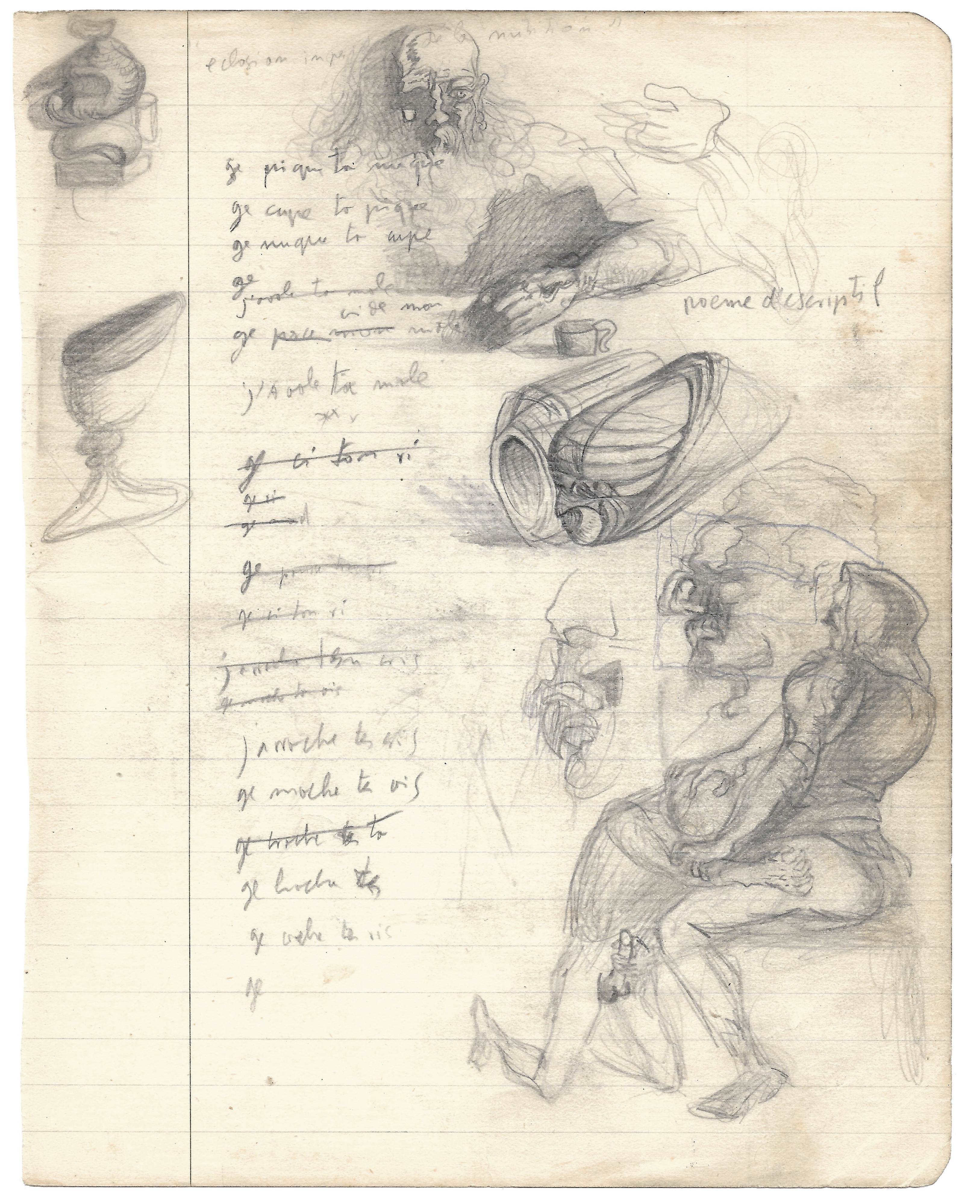 Unpublished poem with superb pencil studies representing surrealist shapes, faces, as well as a masturbation scene