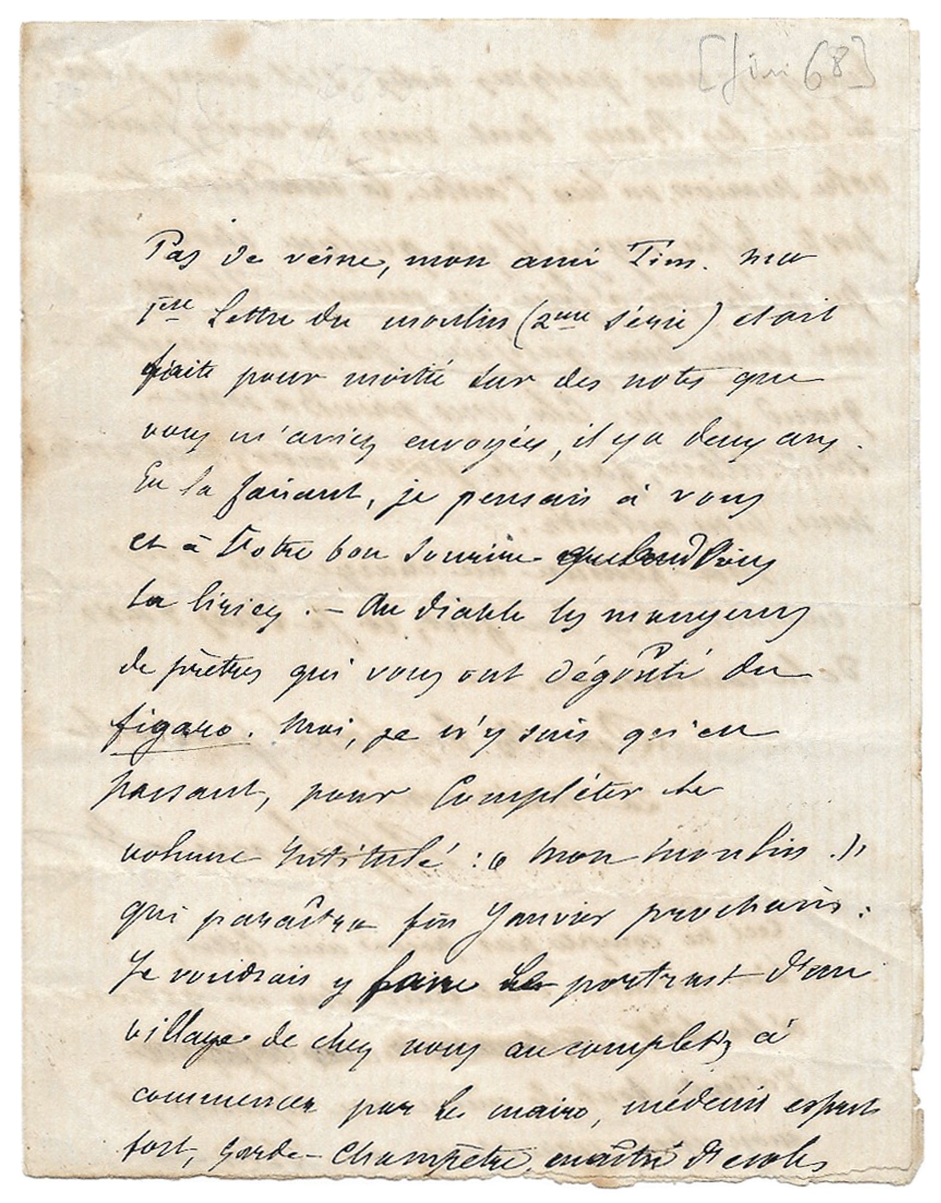 « Pas de veine, mon ami Tim, ma première lettre du Moulin (2ème série) [La Diligence de Baucaire] était faite pour moitié sur des notes que vous m’aviez envoyées, il y a deux ans. En la faisant, je pensais à vous et à votre bon sourire quand vous la liriez. – Au diable les mangeurs de prêtres qui vous ont dégoûté du Figaro. Moi, je n’y suis qu’en passant, pour compléter le volume intitulé : ‘Mon Moulin’ [premier titre envisagé par Daudet] qui paraîtra fin janvier [1869] prochain : Je voudrais y faire le portrait d’un village de chez vous au complet [Le poète Mistral ?], à commencer par le maire, médecin esprit fort, garde champêtre, maître d’école. Envoyez moi quelques notes s’il vous plaît. Le curé des Baux dont vous m’aviez parlé. Votre Marion, ou bien l’autre, la maîtresse de poste… Enfin, voyez. Il y a quelque chose de fin et de gai à faire […] cela vous prendra une soirée. Allons, faites-le pour moi ; tout entre nous, bien entendu.