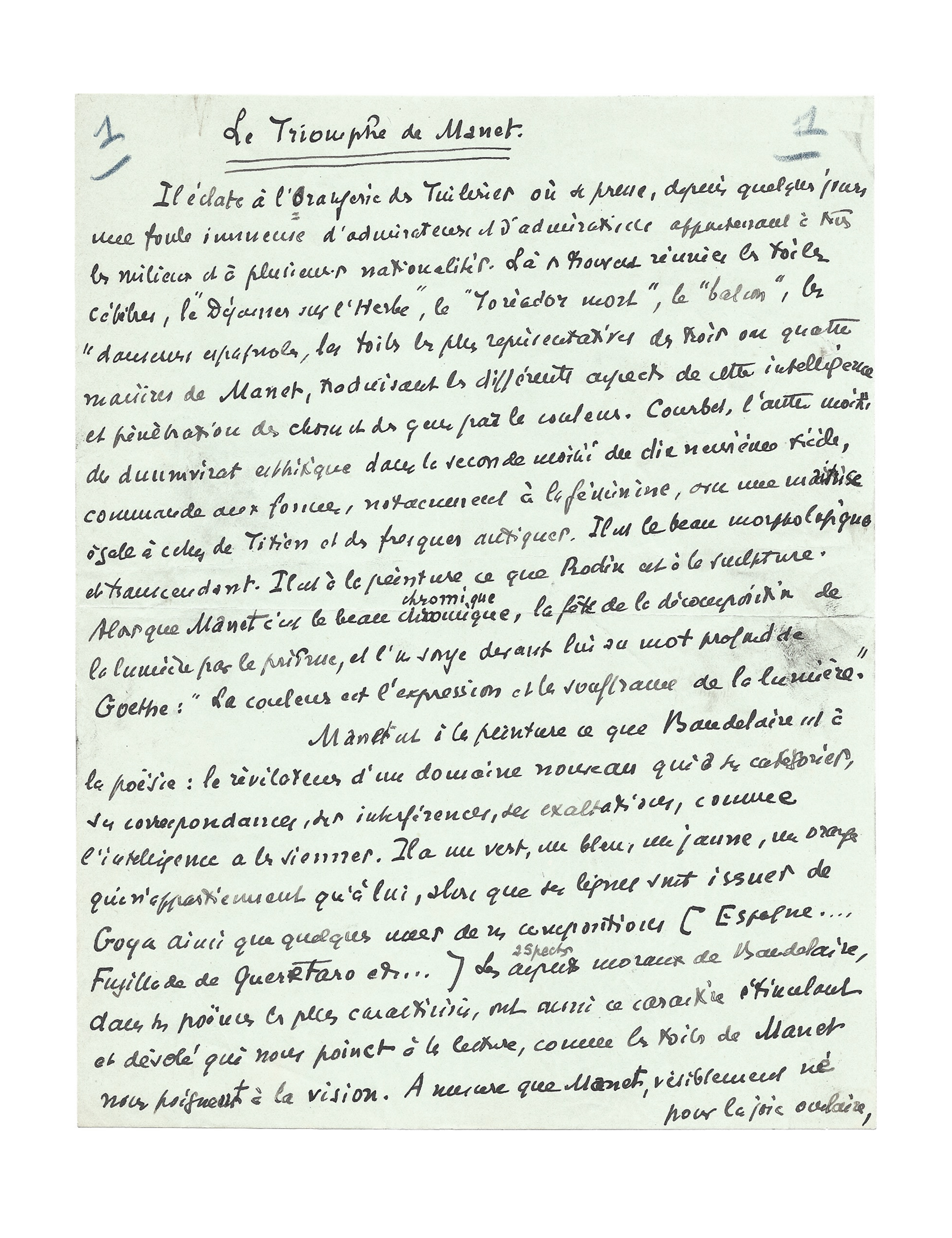 « Il éclate à l’Orangerie des Tuileries ou se presse, depuis quelques jours une foule immense d’admirateurs et d’admiratrices appartenant à tous les milieux et à plusieurs nationalités. Là se trouvent réunies les toiles célèbres, le “Déjeuner sur l’herbe”, le “Toréador mort”, le “Balcon”, les “Danseuses espagnoles”, les toiles les plus représentatives […] de Manet, traduisant les différents aspects de cette intelligence et pénétration des choix et des genres par la couleur. Courbet, l’autre moitié du duumvirat esthétique dans la seconde moitié du dix neuvième siècle, commande aux forces, notamment à la féminine, une maîtrise égale à Titien ou des fresques antiques […] Il est à la peinture ce que Rodin est à la sculpture. Alors que Manet c’est le beau chromique, la fête de la décomposition de la lumière par le prisme, et l’usage devant lui du mot profond de Goethe : “La couleur est l’expression et la souffrance de la lumière”.