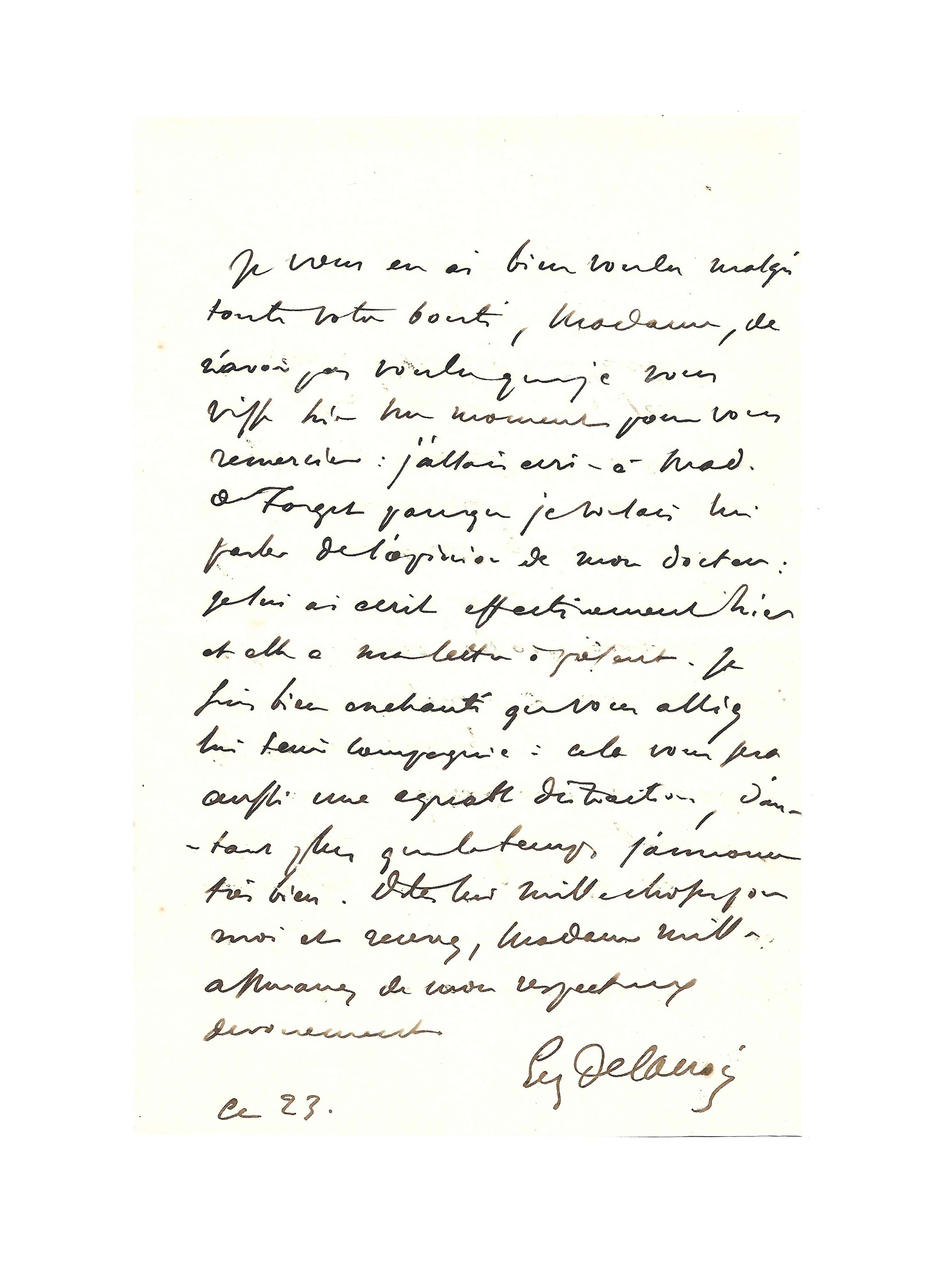 « Je vous en ai bien voulu malgré toute votre bonté, Madame, de n’avoir pas voulu que je vous visse hier un moment pour vous remercier. J’allais écrire à Mad. de Forget parce que je voulais lui parler de l’opinion de mon docteur. Je lui ai écrit effectivement hier et elle a ma lettre à présent. Je suis bien enchanté que vous alliez lui tenir compagnie. Cela vous fera aussi une agréable distraction, d’autant plus que le temps s’annonce très bien. Dites-lui mille choses pour moi et recevez, Madame, mille assurances de mon respectueux dévouement »