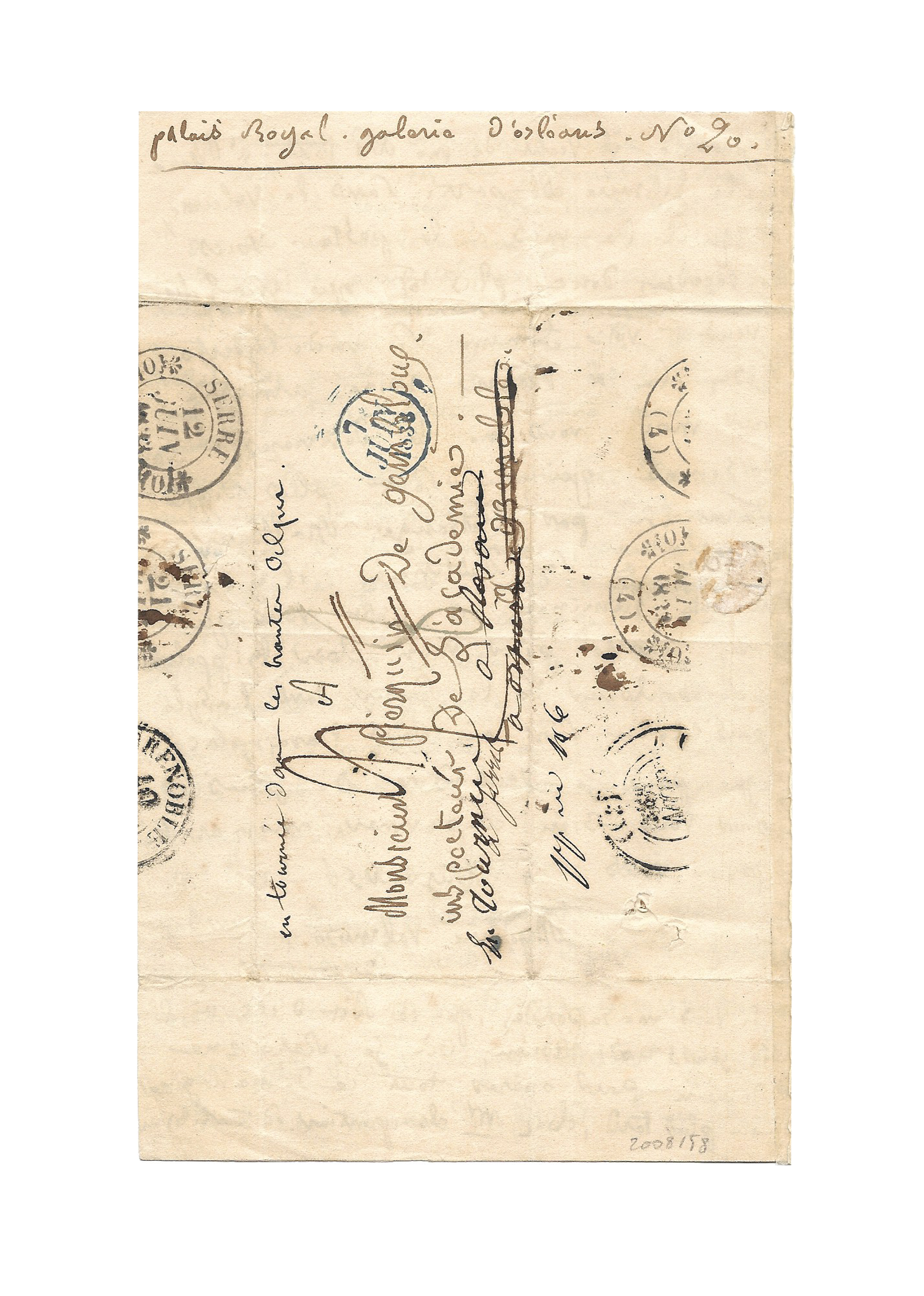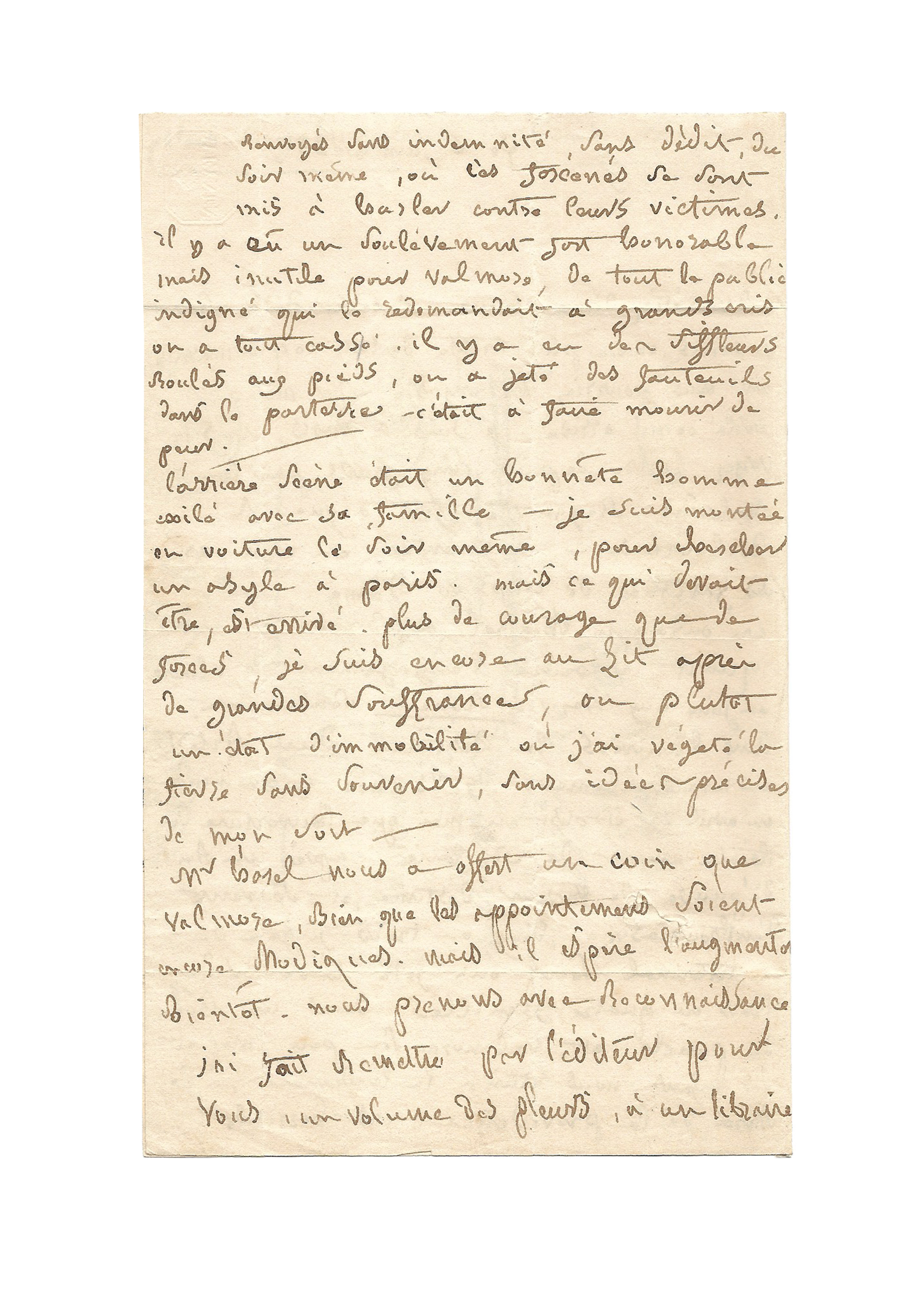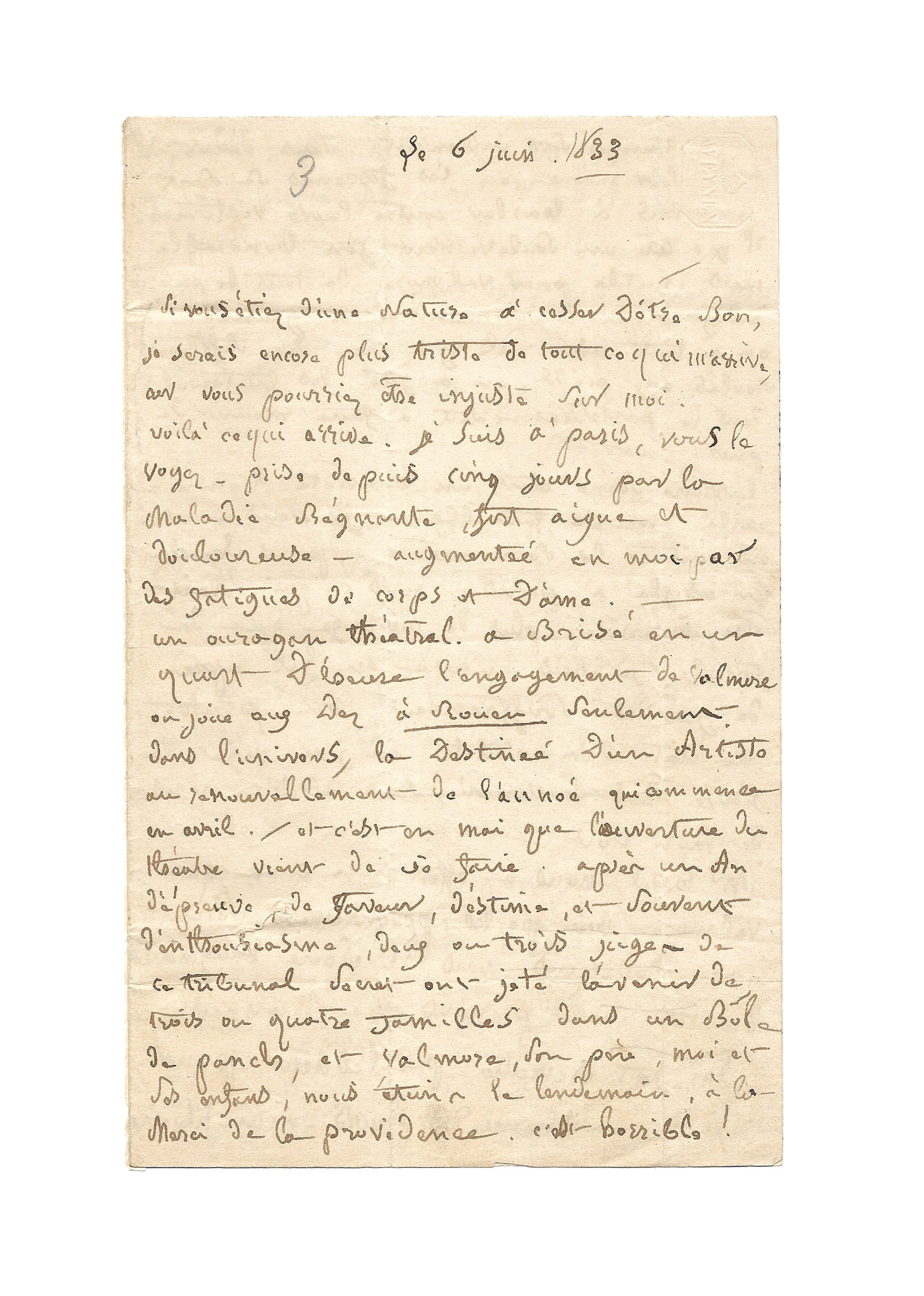 L’arrière-scène était un honnête homme exilé avec sa famille. Je suis montée en voiture le soir même, pour chercher un asile à Paris. Mais ce qui devait être est arrivé. Plus de courage que de forces. Je suis encore au lit après de grandes souffrances, ou plutôt un état d’immobilité où j’ai végété la fièvre sans souvenir, sans idées précises de mon sort. M. Harel [Charles Jean Harel, directeur du Théâtre de la Porte-Saint-Martin depuis 1832] nous a offert un coin que Valmore a accepté bien que les appointements soient encore modiques. Mais il espère L’augmenter bientôt. Nous prenons avec reconnaissance.