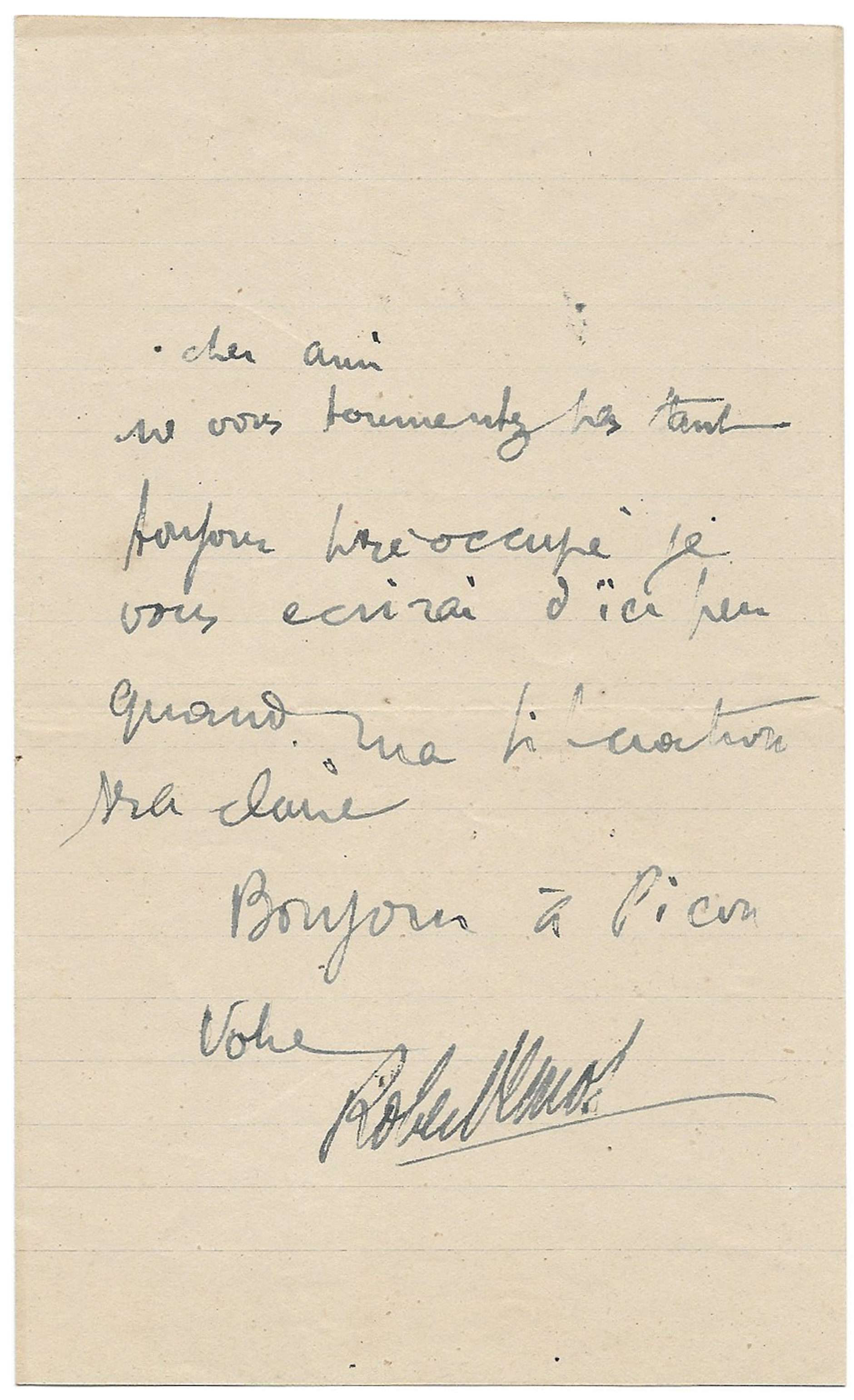 N.p.n.d. [Paris, 10 Sept. 1923], 1 p. in-12° on lined paper, in blue ink
