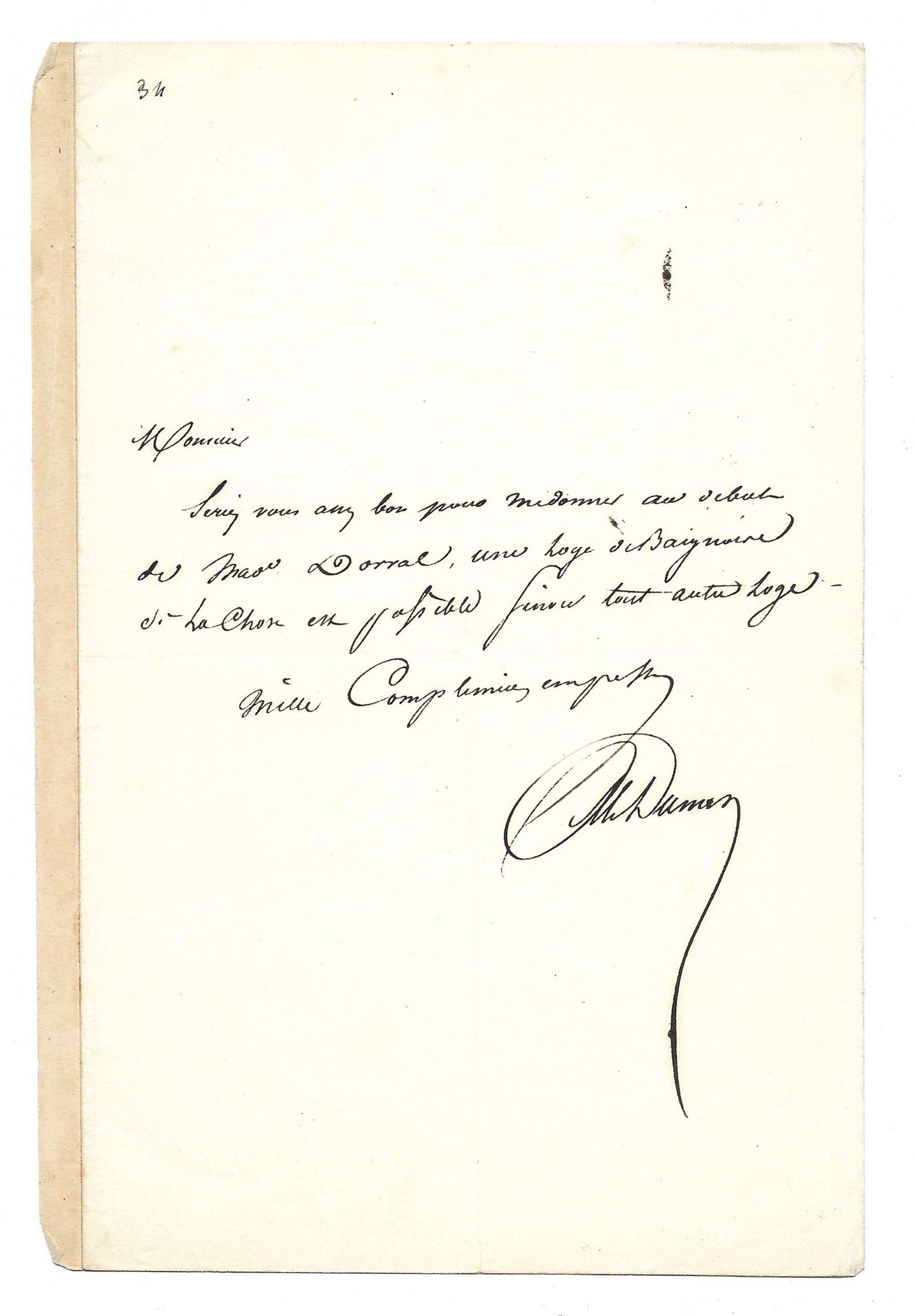 Seriez vous assez bon pour me donner au début de Mad[ame] Dorval, une loge de Baignoire si la chose est possible sinon tout autre loge.