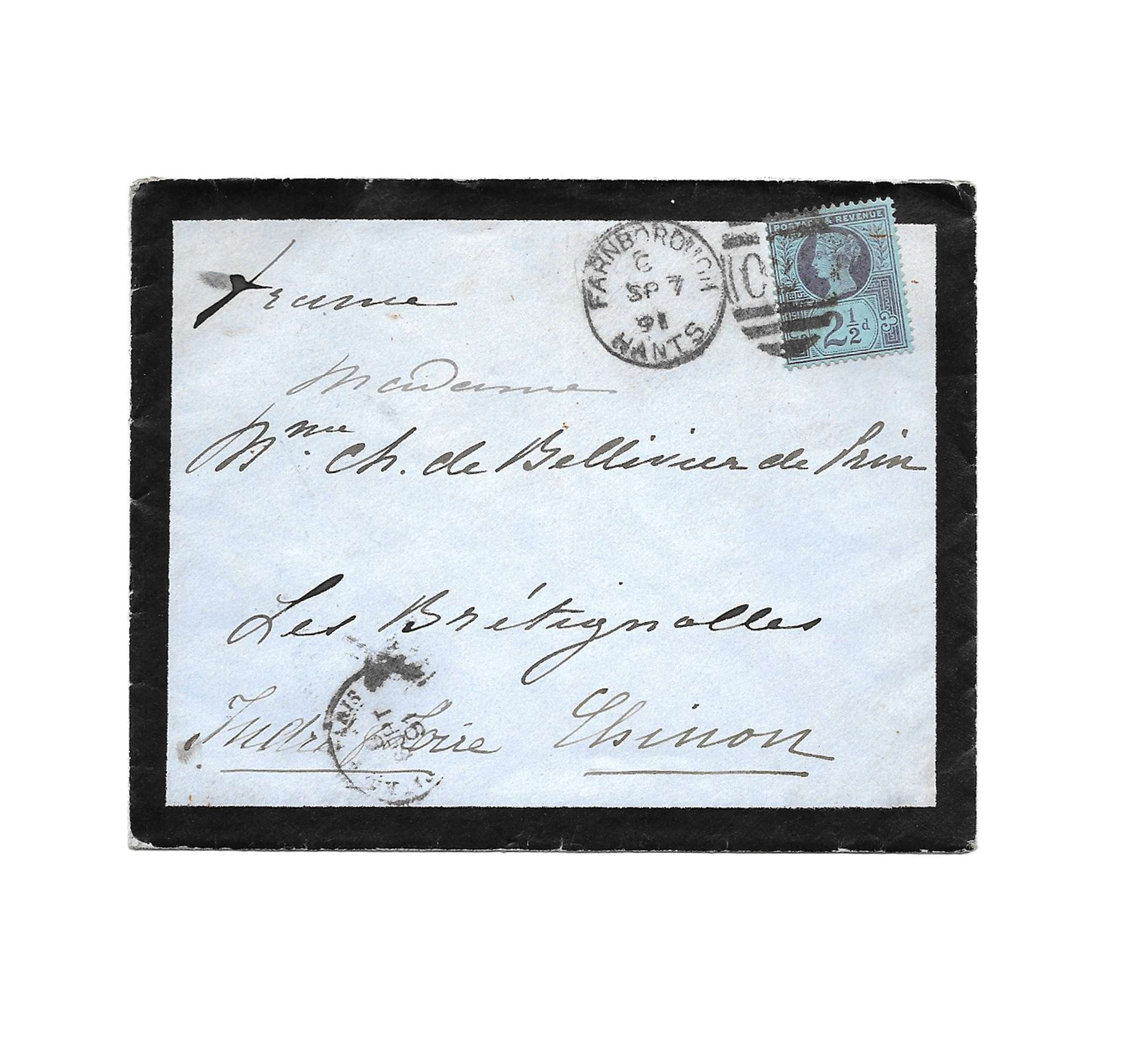 Farnborough Hill, 6th September [18]91, 1 p. 1⁄2 in-8 on mourning paper, envelope attached