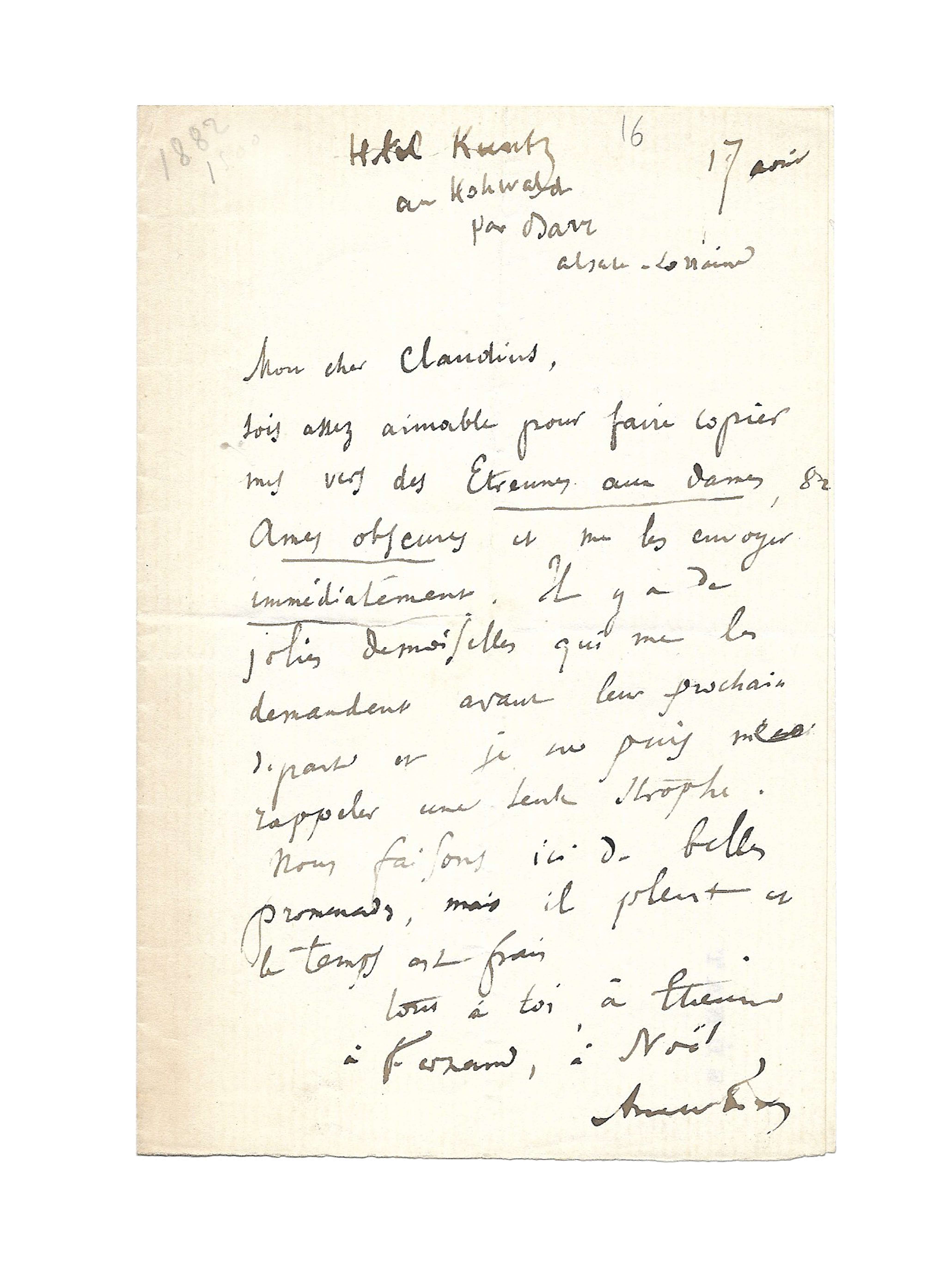 Hotel Kwartz, Hohwald, through Barr, Alsace Lorraine, 17 April [1882, by unknown hand with pencil], 1 p. in-8°
