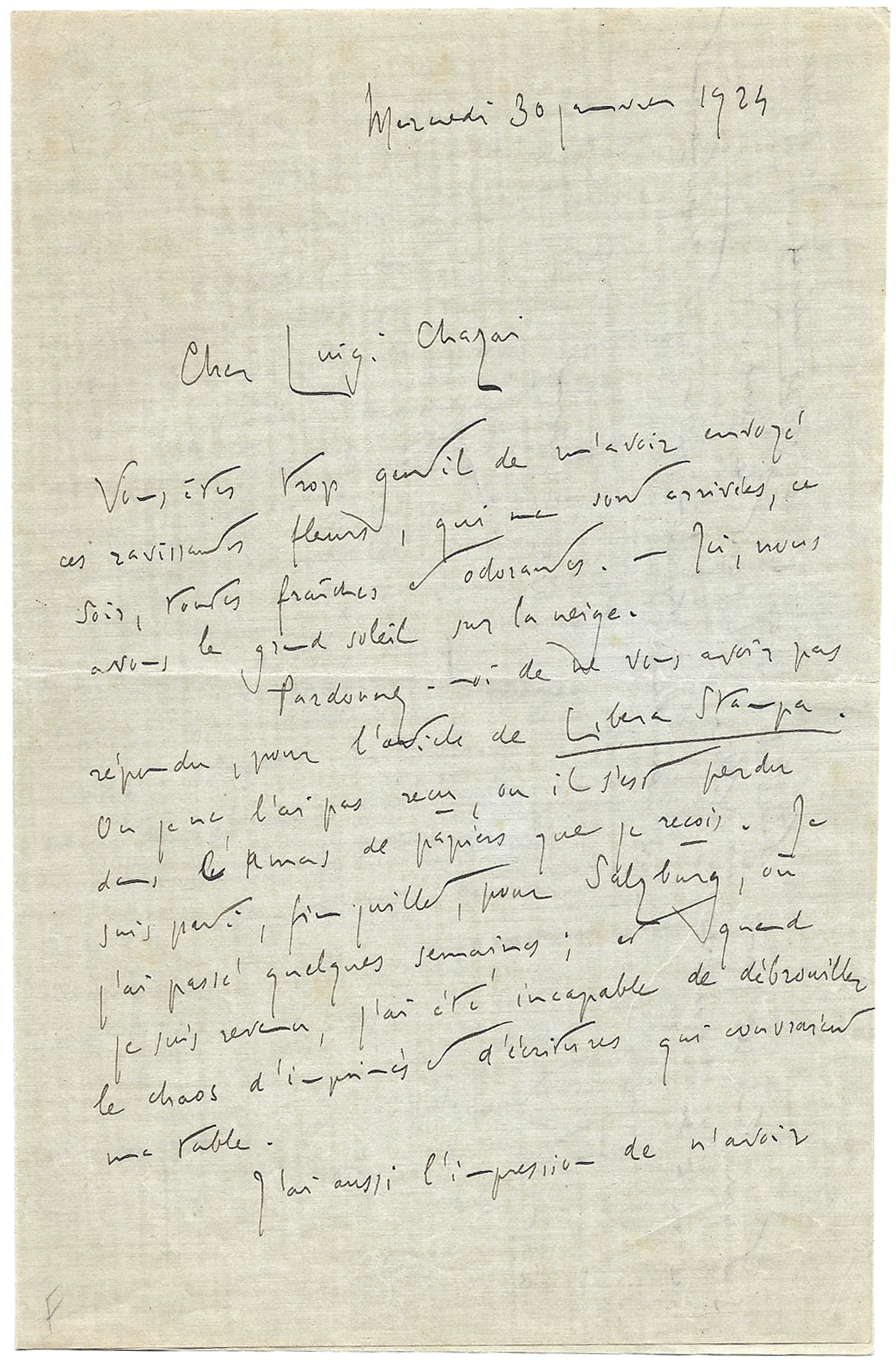 Pardonnez-moi de ne vous avoir pas répondu pour l’article Libera Stampa. Ou je ne l’ai pas reçu, ou il s’est perdu dans l’amas de papiers que je reçois. Je suis parti, fin juillet, pour Salzburg, où j’ai passé quelques semaines ; et quand je suis revenu, j’ai été incapable de débrouiller le chaos d’imprimés et d’écritures qui couvraient ma table.