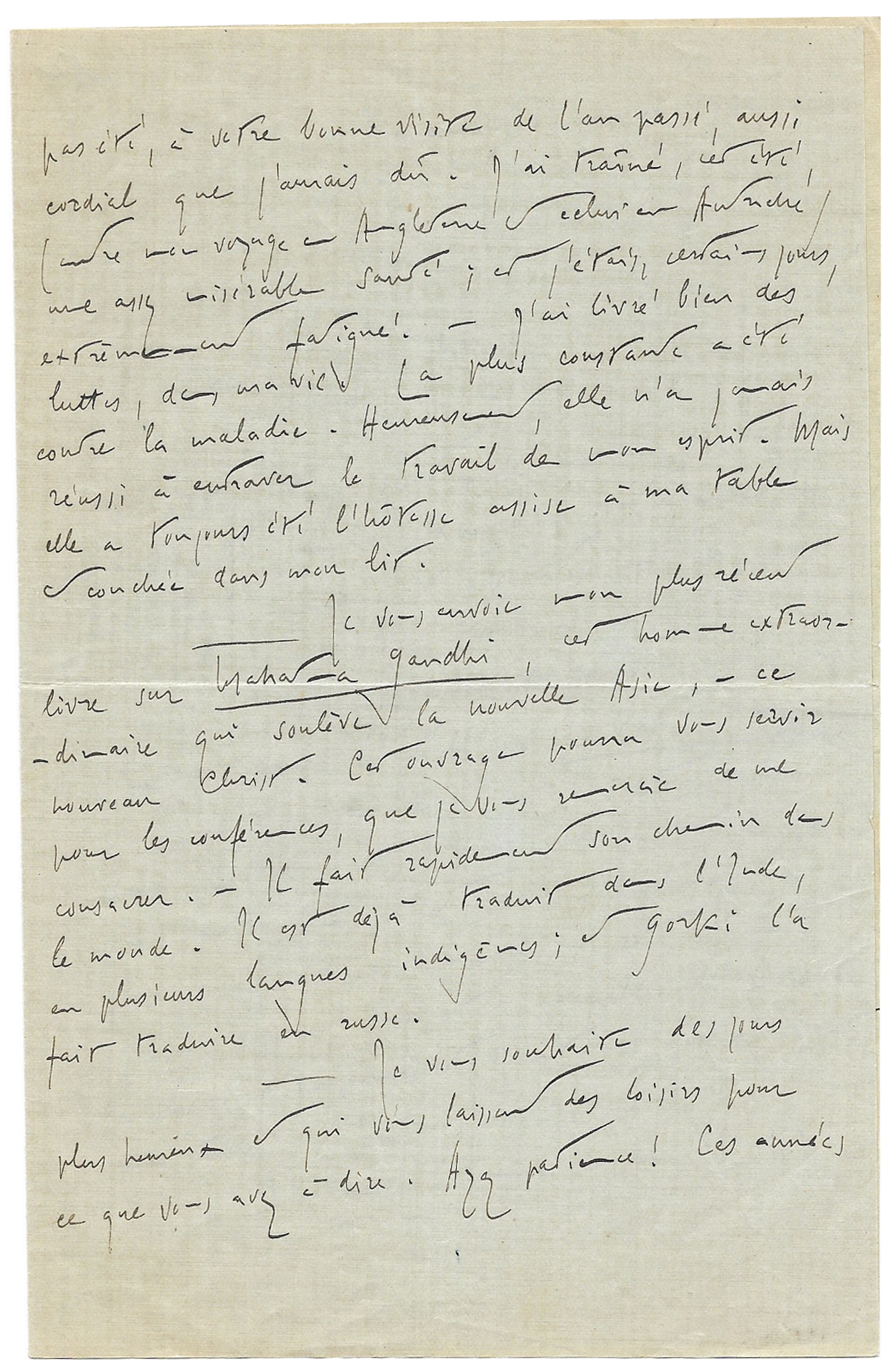Je vous envoie mon plus récent livre sur Mahatma Gandhi, cet homme extraordinaire qui soulève la nouvelle Asie, – ce nouveau Christ. Cet ouvrage pourra vous servir pour les conférences, que je vous remercie de me consacrer. – Il fait rapidement son chemin dans le monde. Il est déjà traduit dans l’Inde, en plusieurs langues indigènes ; et Gorki l’a fait traduire en russe.