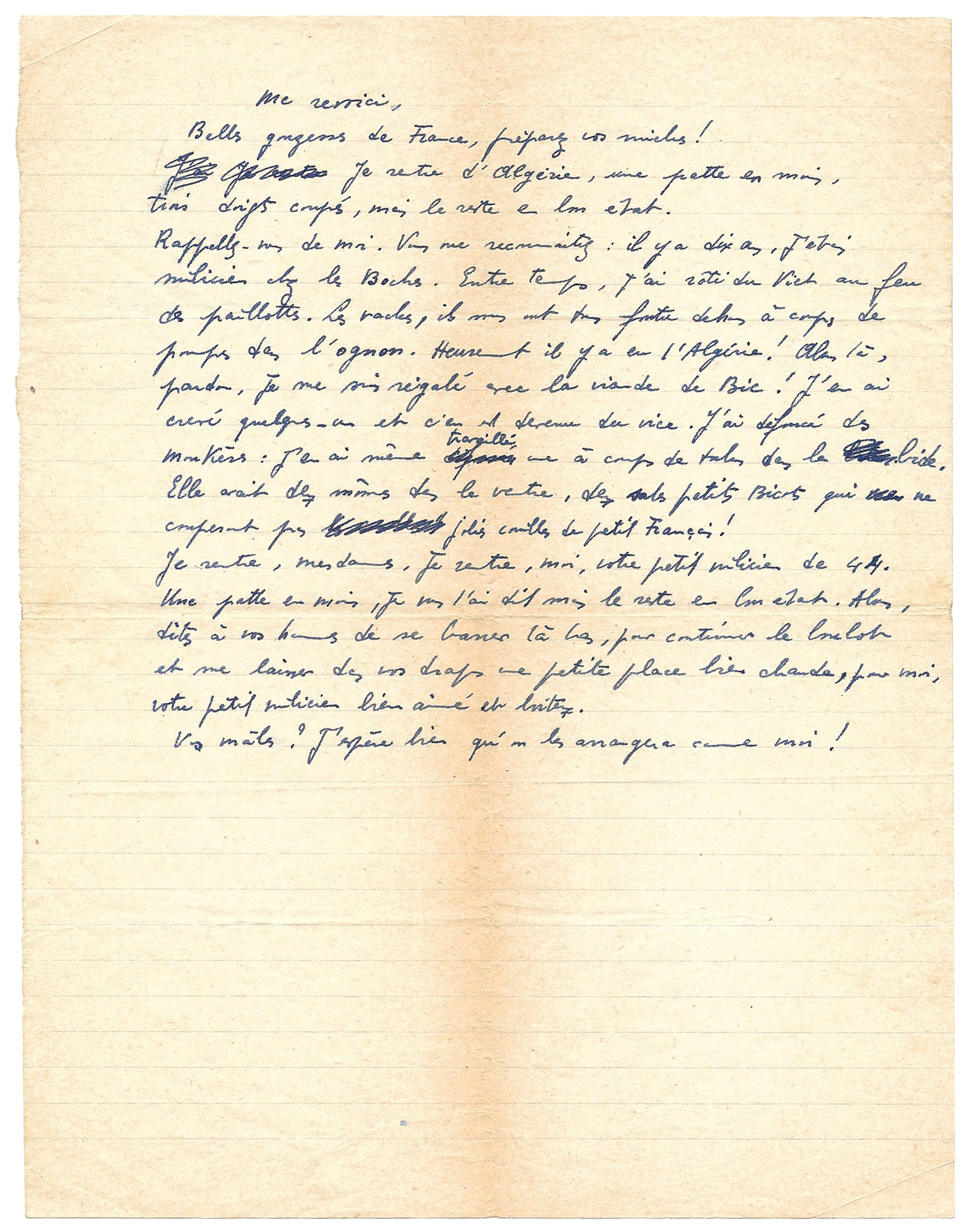 Rappellez-vous [sic] de moi. Vous me reconnaîtrez : il y a dix ans, j’étais milicien chez les Boches. Entre temps, j’ai rôti du Viet au feu des paillottes. Les vaches, ils nous ont tous foutu dehors à coup de pompes dans l’ognon. Heureusement il y a eu l’Algérie ! Alors là, pardon, je me suis régalé avec la viande de Bic ! J’en ai crevé quelques-uns et c’en est devenu du vice. J’ai défoncé des moukères : J’en ai même défoncé travaillé une à coup de talons dans le bide bide. Elle avait deux mômes dans le ventre, deux sales petits Bicots qui ne ne couperont pas les couilles [les] jolies couilles de petit Français !