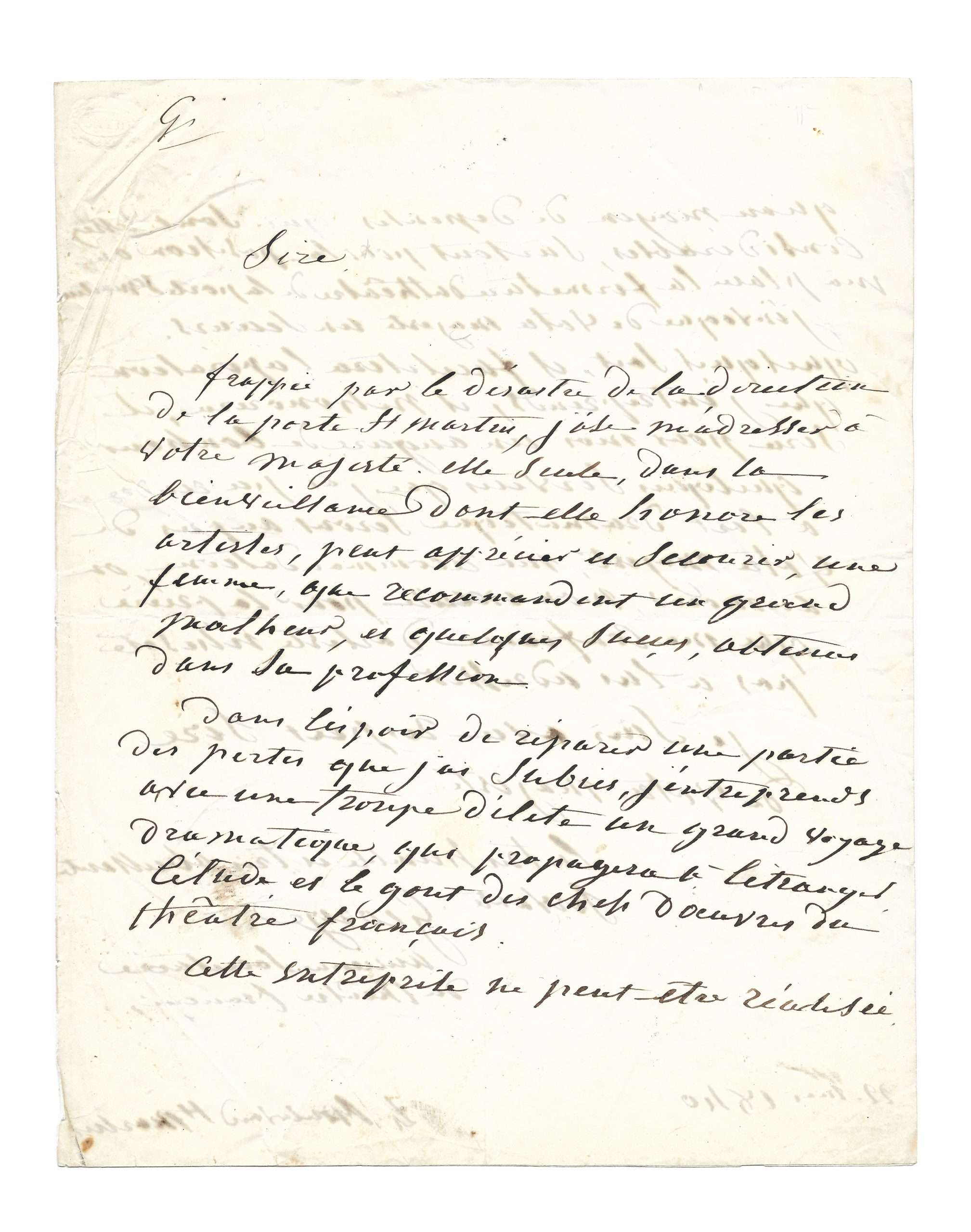 Frappée par le désastre de la direction de la Porte St Martin, j’ose m’adresser à votre majesté. Elle seule, dans la bienveillance dont elle honore les artistes, peut apprécier et secourir une femme, que recommandent un grand malheur, et quelques heures, acteurs dans la profession.