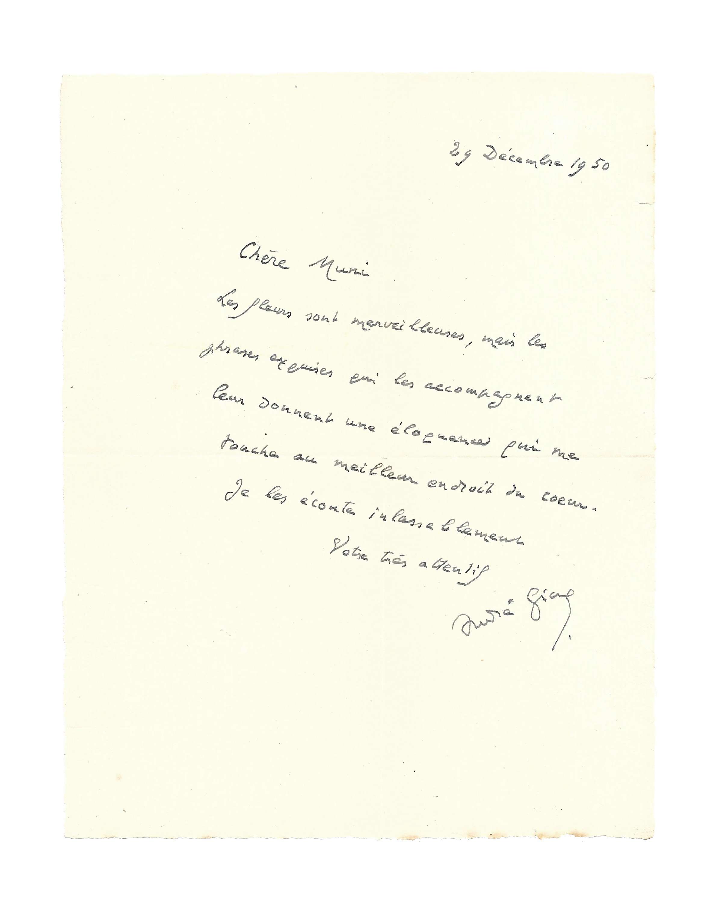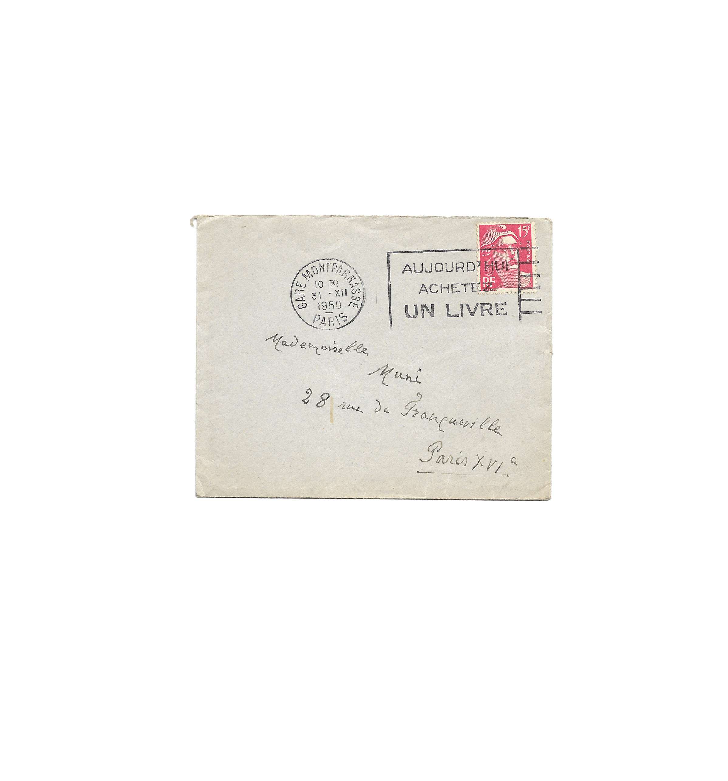 [Paris] 29th December 1950, 1 p. in-8, autograph envelope attached