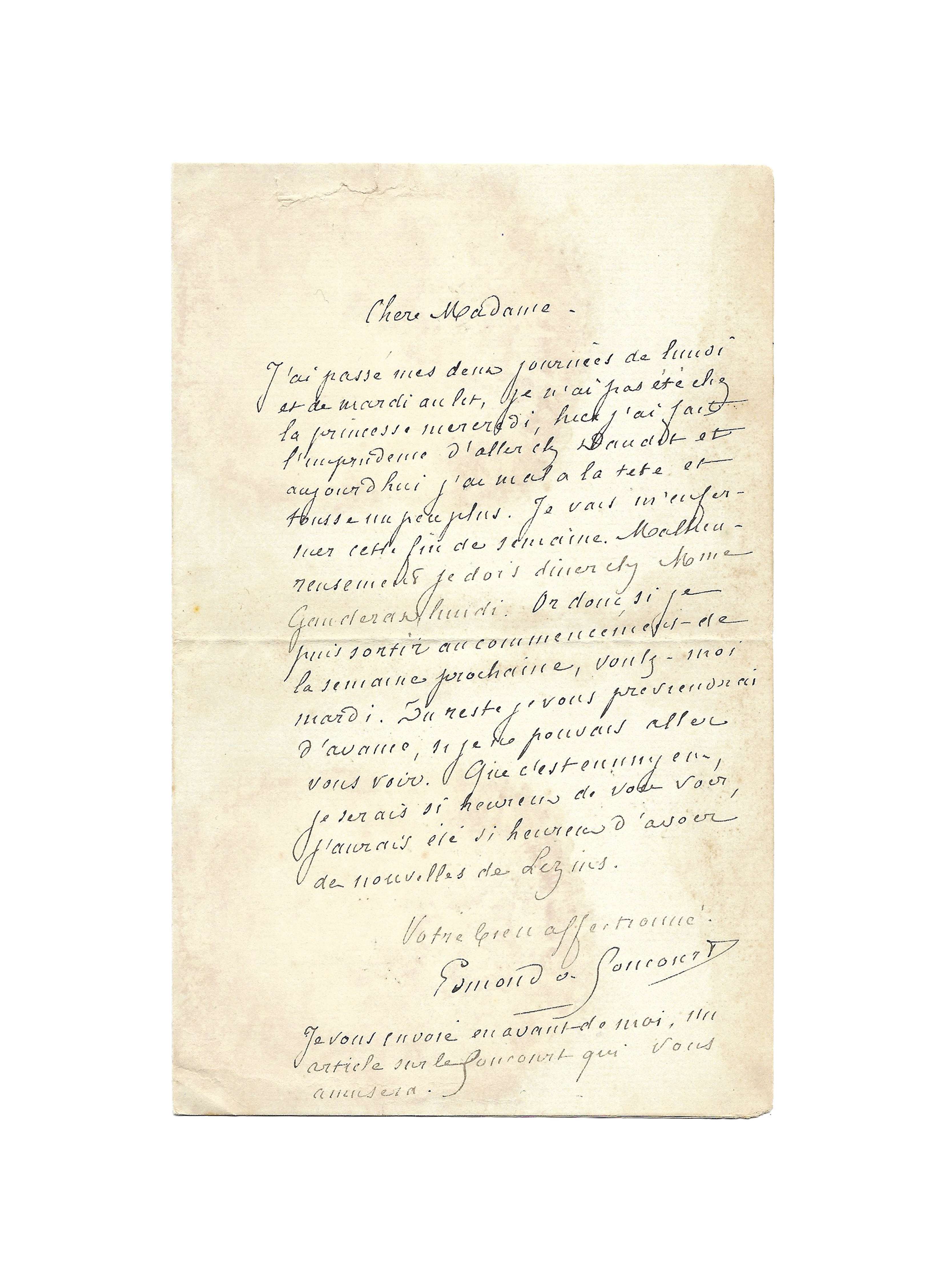 Autograph letter signed “Edmond de Goncourt” to a lady