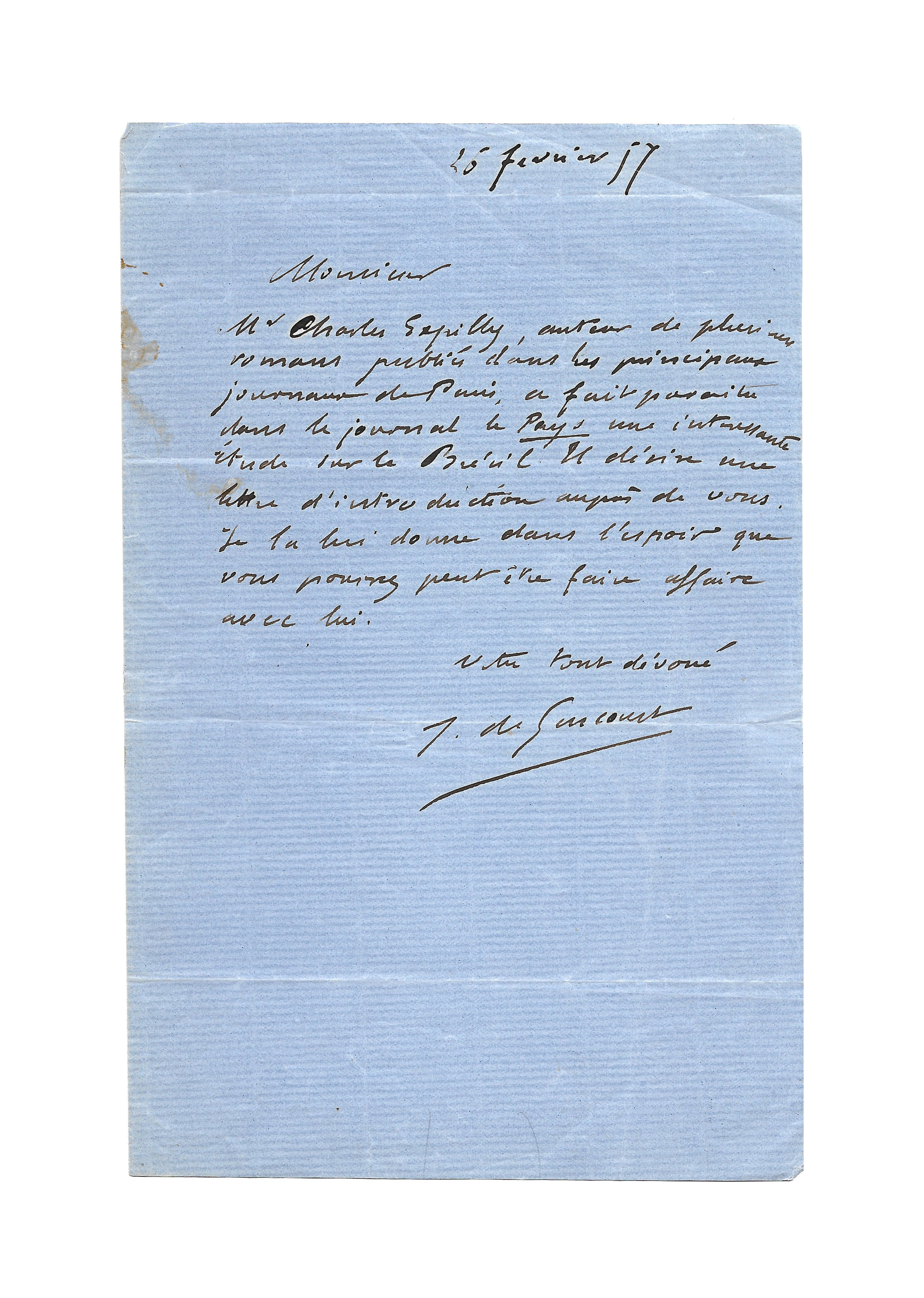 Autograph letter signed “J. de Goncourt” to Édouard Dentu