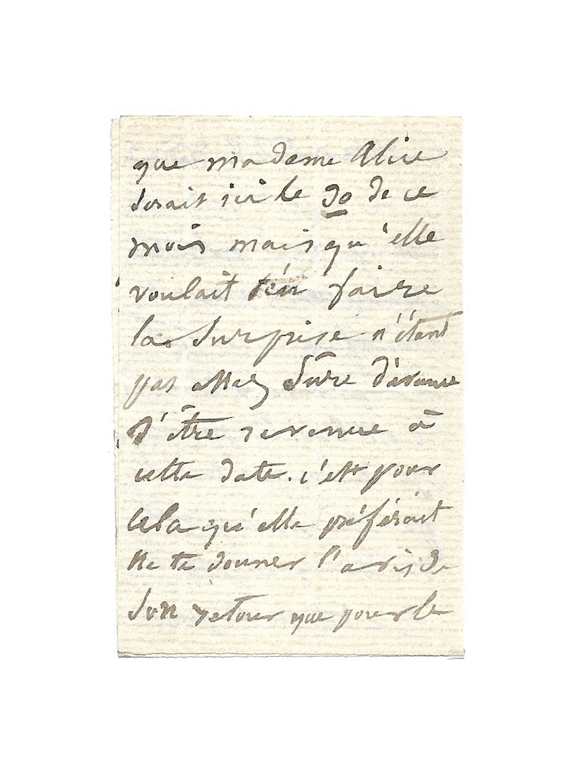 « et je vais contenter mon cœur avant ma faim : à tout seigneur, tout honneur, c’est bien le moins. Je crois que tu n’étais pas là hier quand madame Ménard1 m’a dit qu’elle pensait que madame Alice2 serait ici le 30 de ce mois mais qu’elle voulait t’en faire la surprise n’étant pas assez sûre d’avance d’être revenue à cette date. C’est pour cela qu’elle préférait ne te donner l’avis de son retour que pour le premier mai. Dans les deux cas nous n’avons plus que dix à douze jours de patience à avoir pour revoir nos chers petits voyageurs. Seulement il faudra nous garder d’encombrer notre table pendant les trois ou quatre jours qui précèdent cette arrivée afin d’être tout au bonheur de reprendre possession de nos chers petits. En attendant, épuisons, puisque cela te plaît, toutes les invitations obligatoires. Est-ce ton avis ? Le mien, d’avis, et de te complaire en tout par tout et toujours et de t’adorer à deux genoux. »