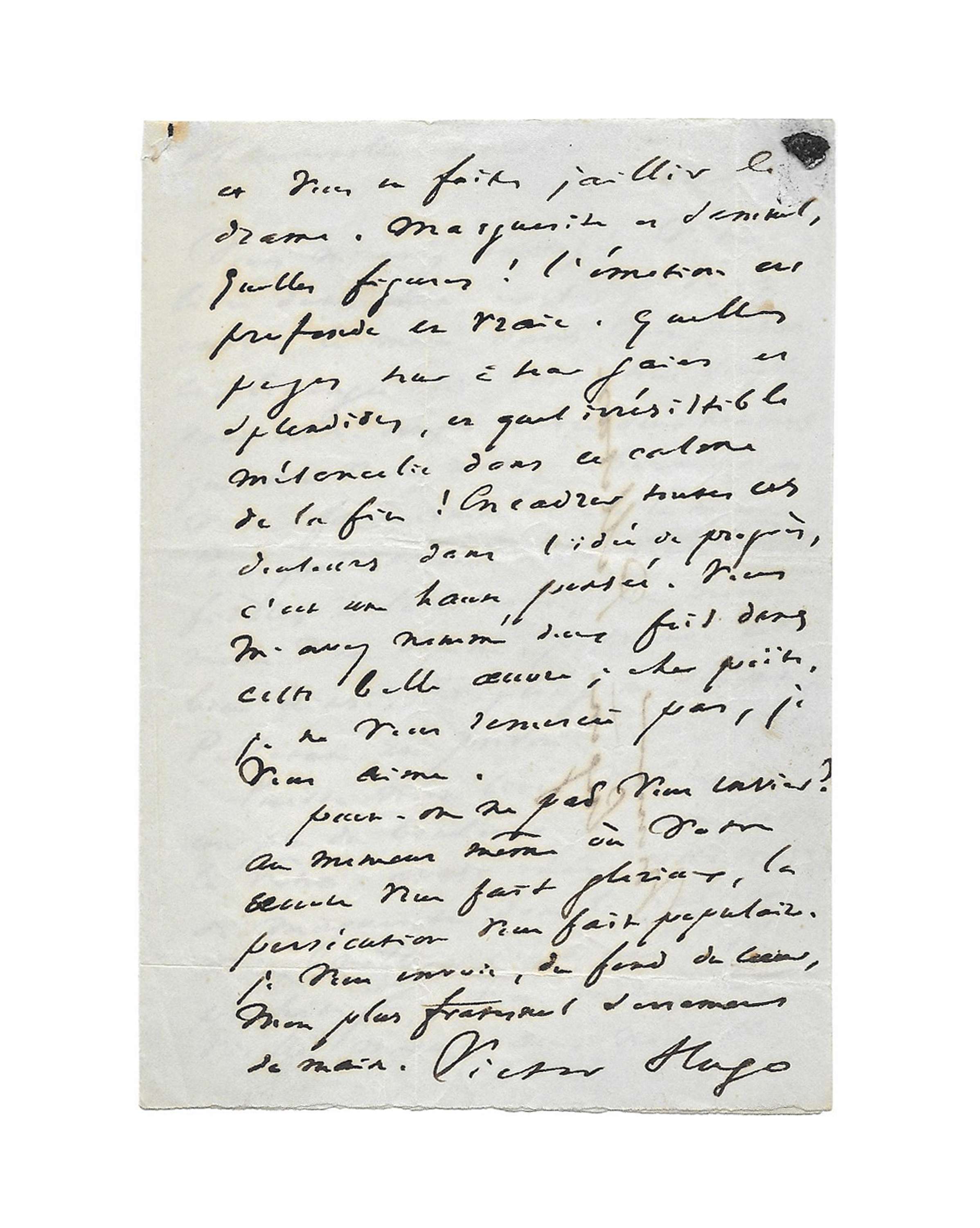 Peut-on ne pas vous envier ? Au moment même où votre œuvre vous fait glorieux, la persécution vous fait populaire. Je vous envoie, du fond du cœur, mon plus fraternel serrement de main. Victor Hugo“