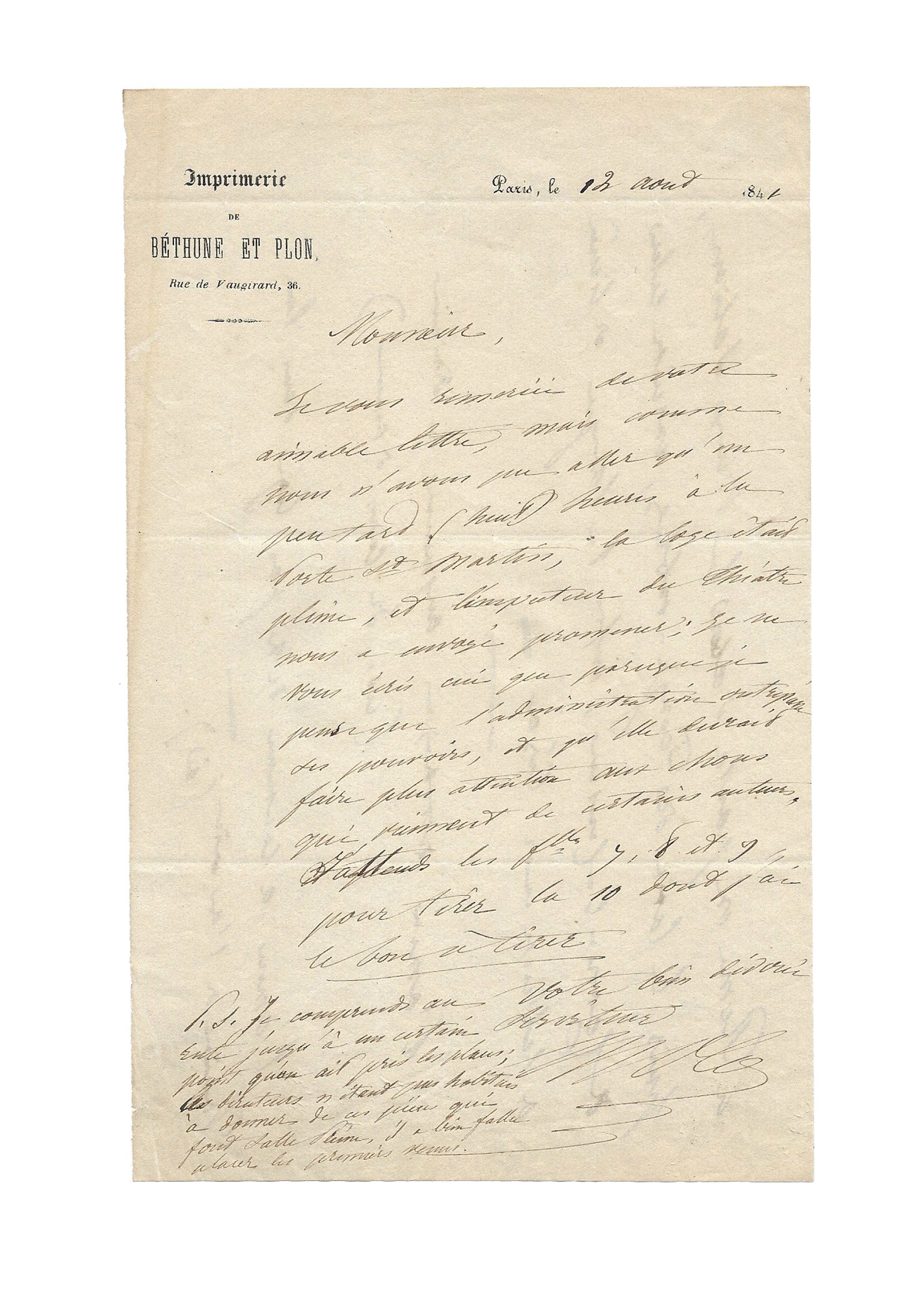 On the back of a letter from the printer of Béthune and Plon, complaining of an incident about a seats reserved for him at the Théâtre de la Porte Saint-Martin.
