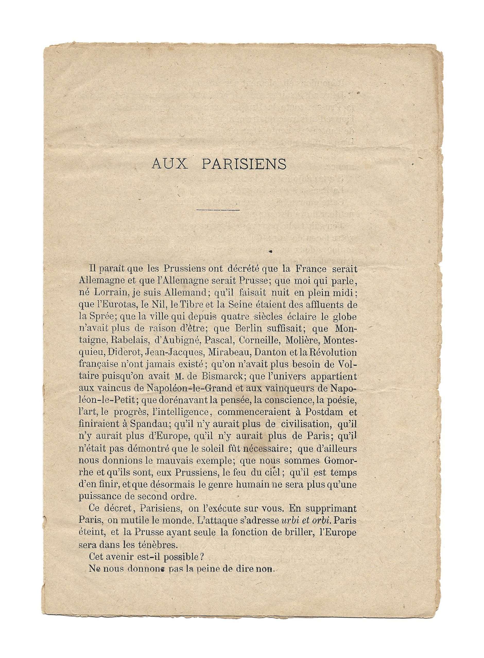 – Aux Parisiens, dated October 2, 1870, appears in Actes et Paroles III in chapter IV, p. 65