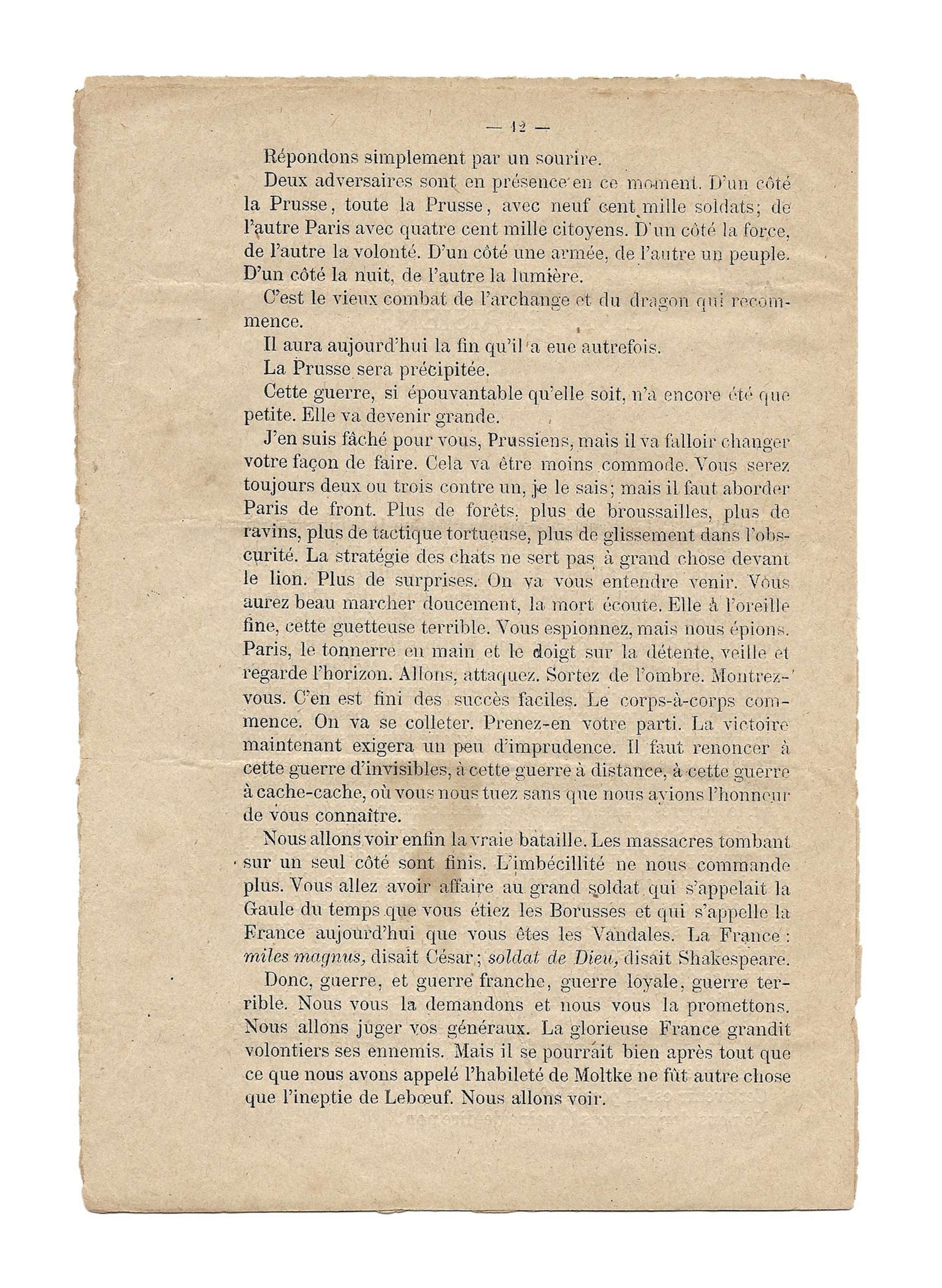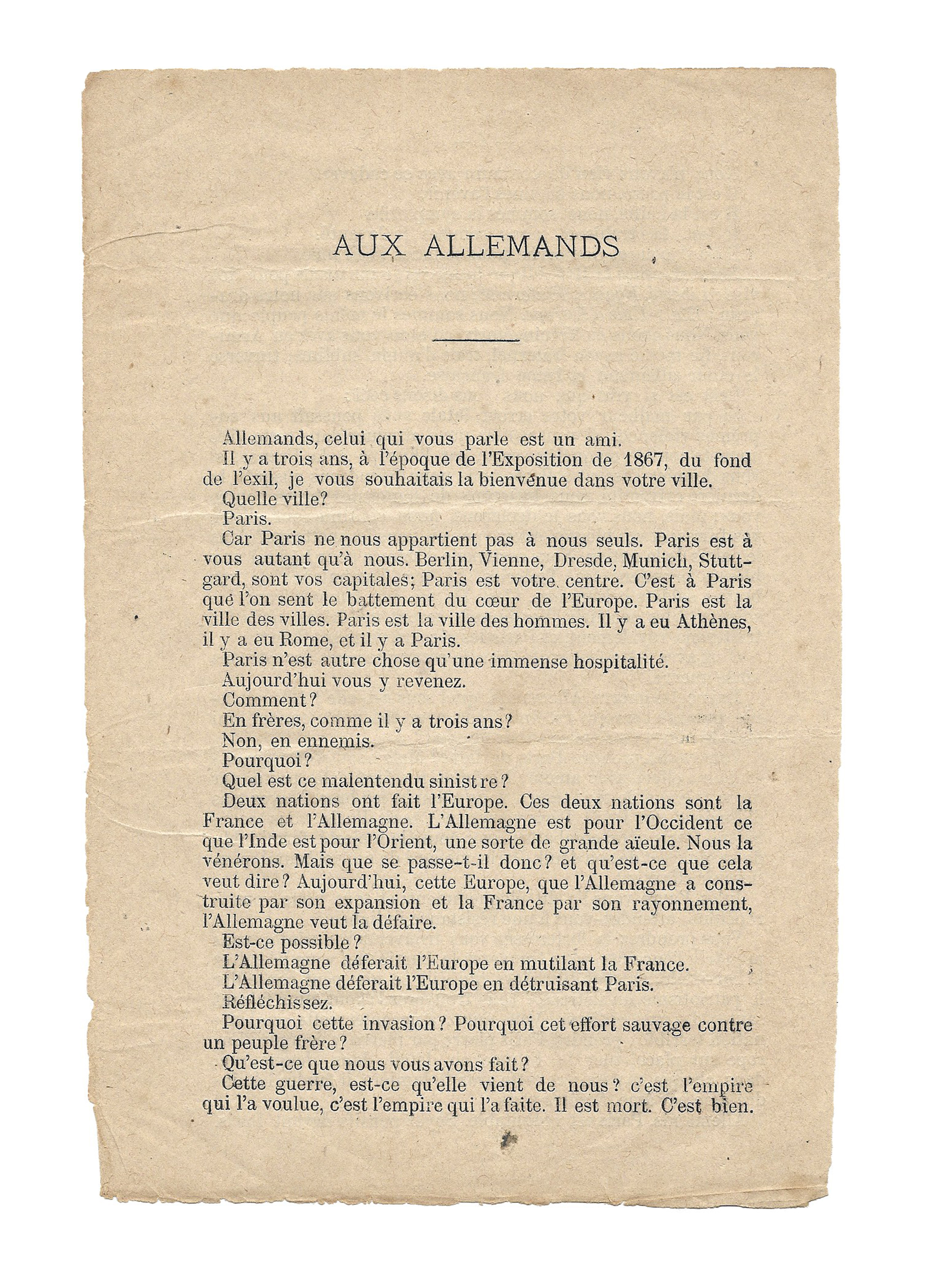 – Aux Allemands, dated September 9, 1870 (four days after Hugo’s return from exile), appears in Actes et Paroles III in chapter II, p. 51