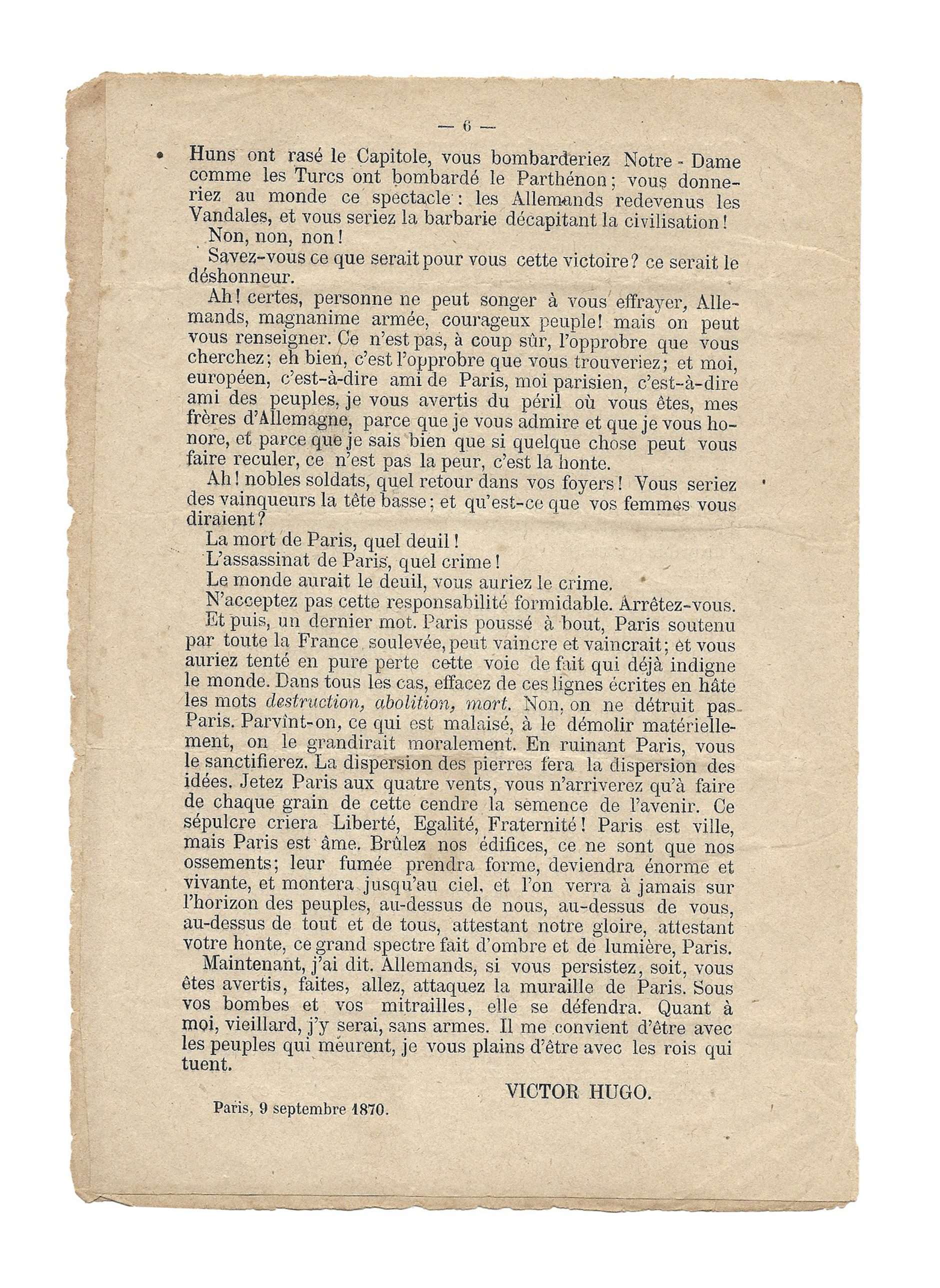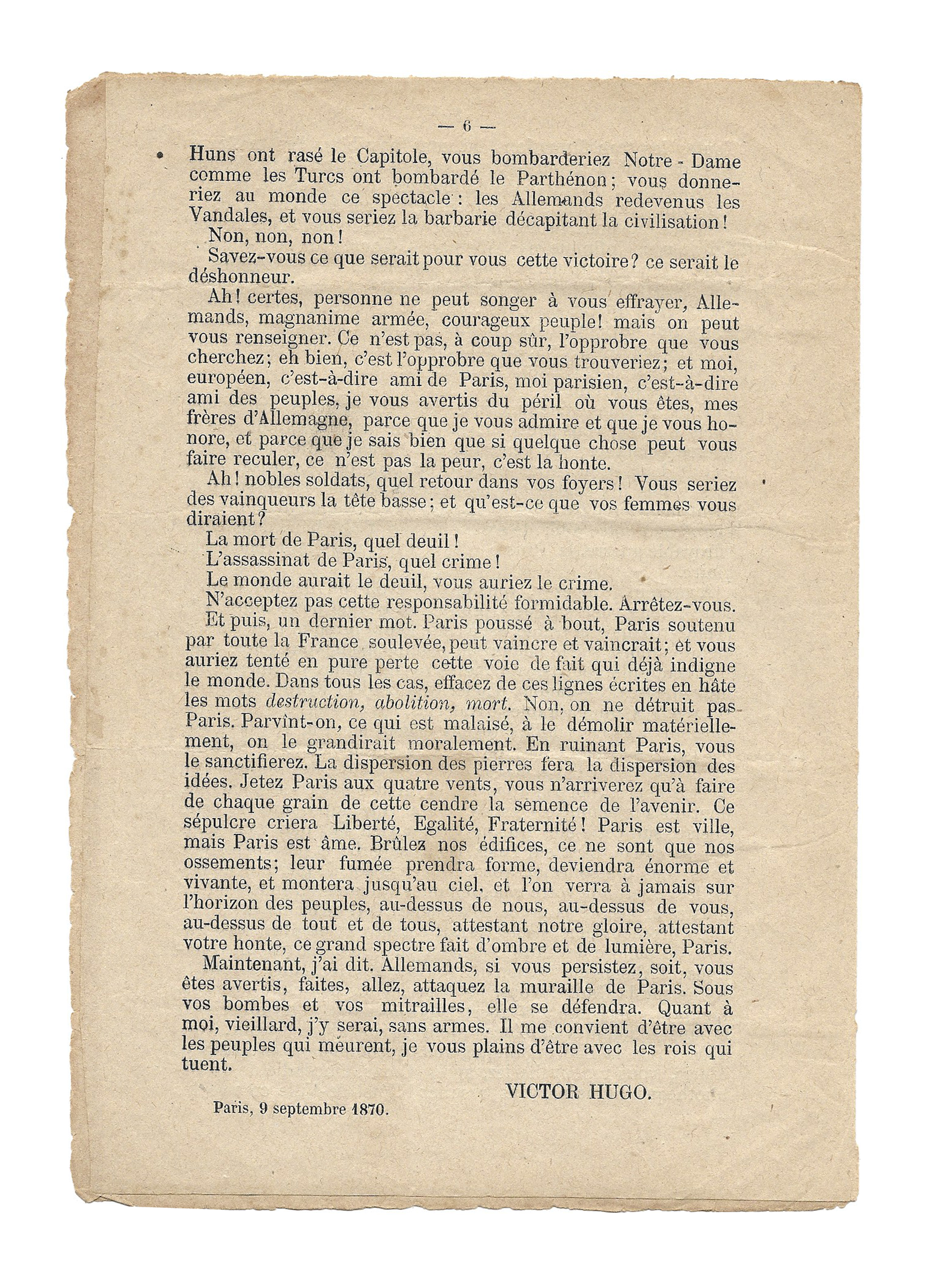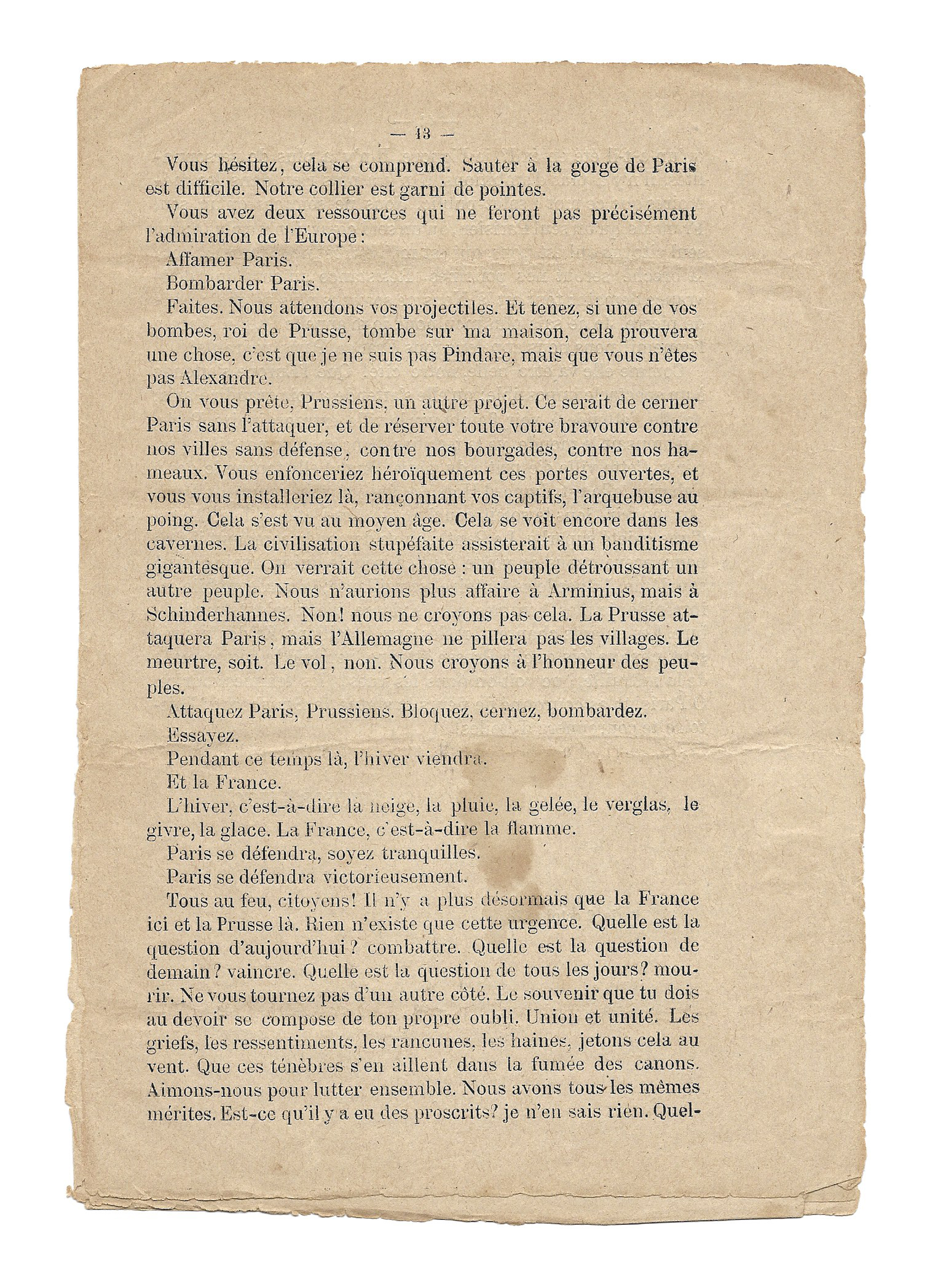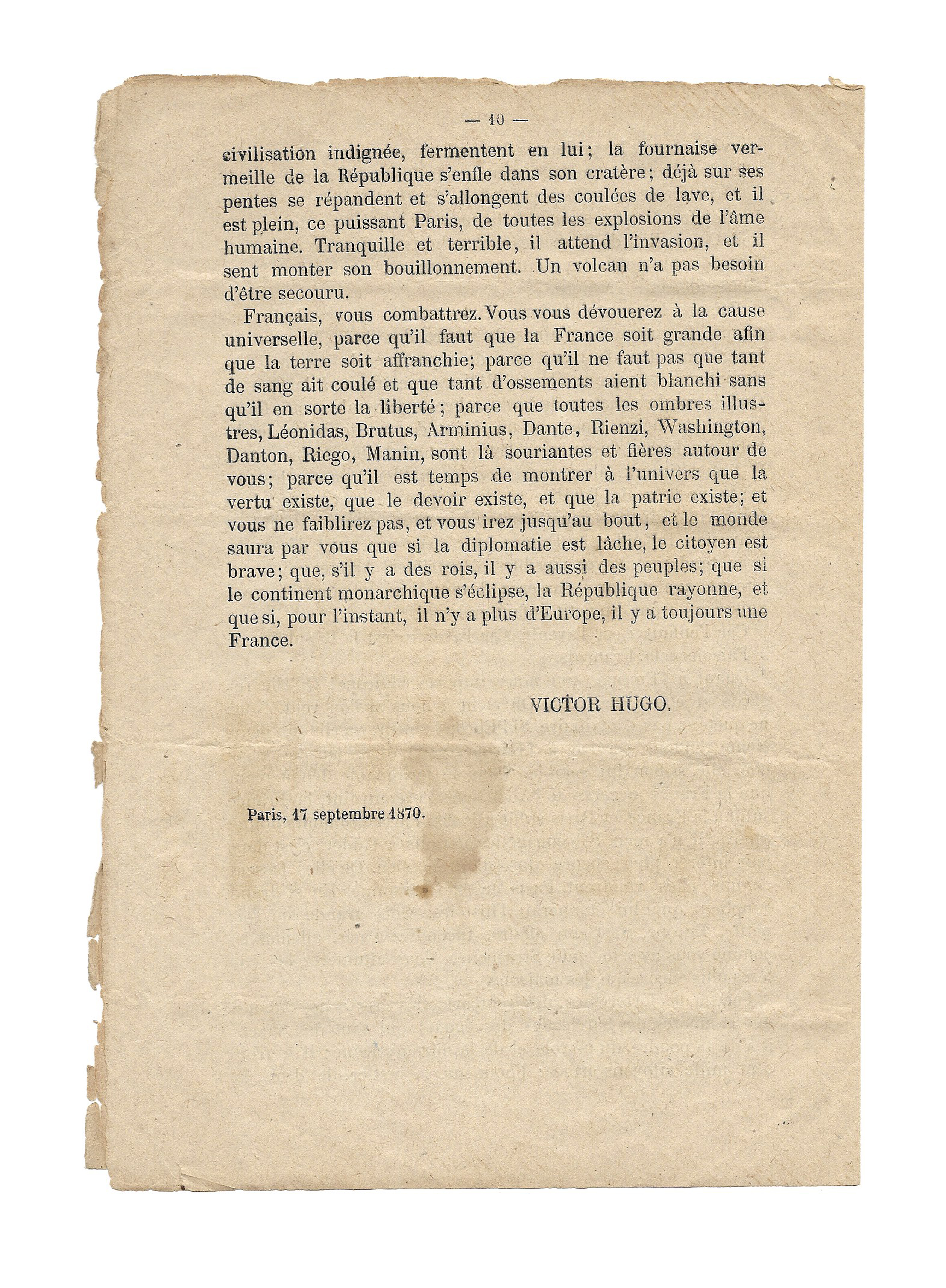 Back in France on September 5, 1870, after a 19-year exile, Parisians gave the writer a triumphant welcome. He actively participated in the defence of the besieged city, as demonstrated by these pamphlets, with their powerful and magnificent texts.