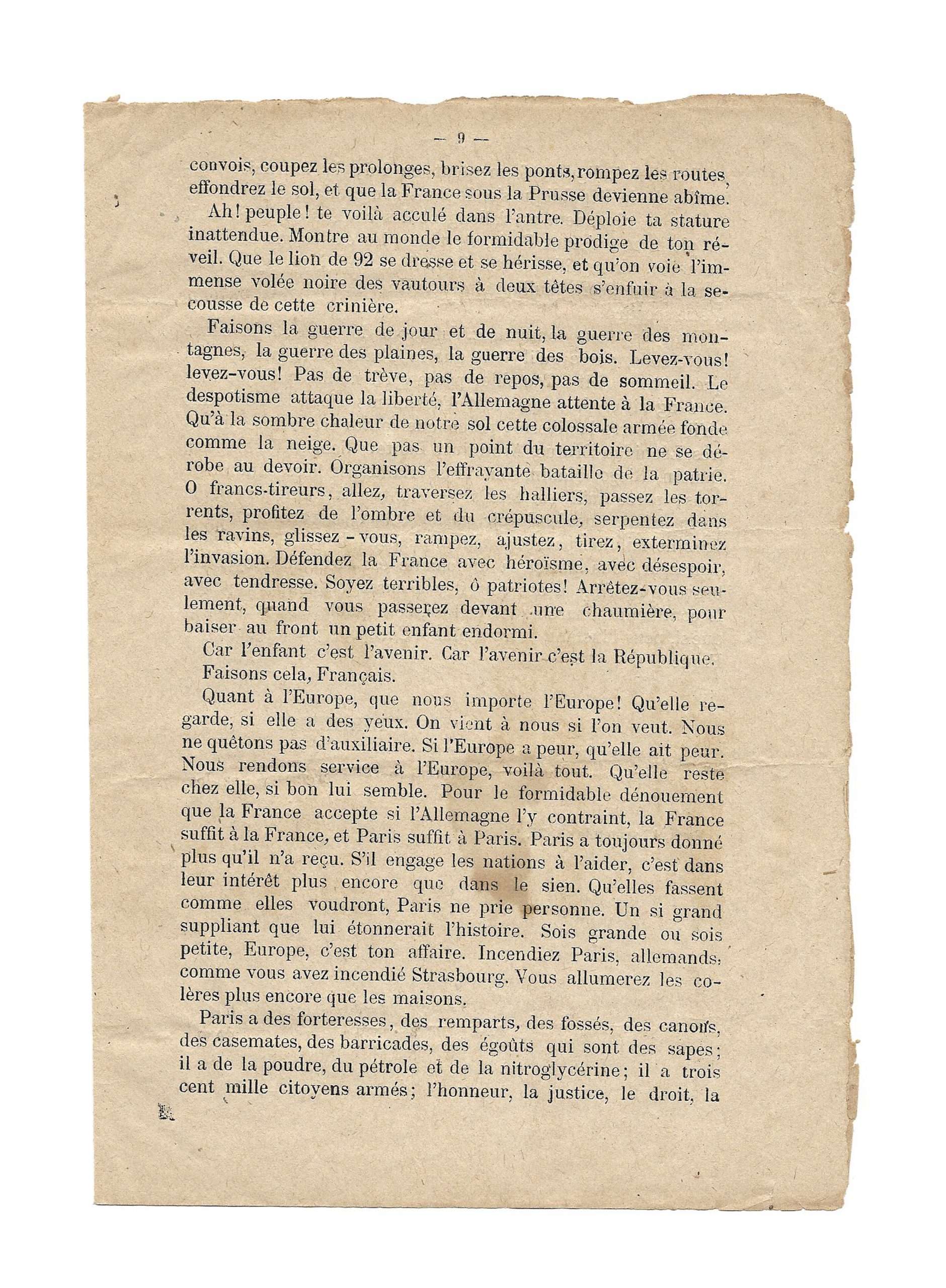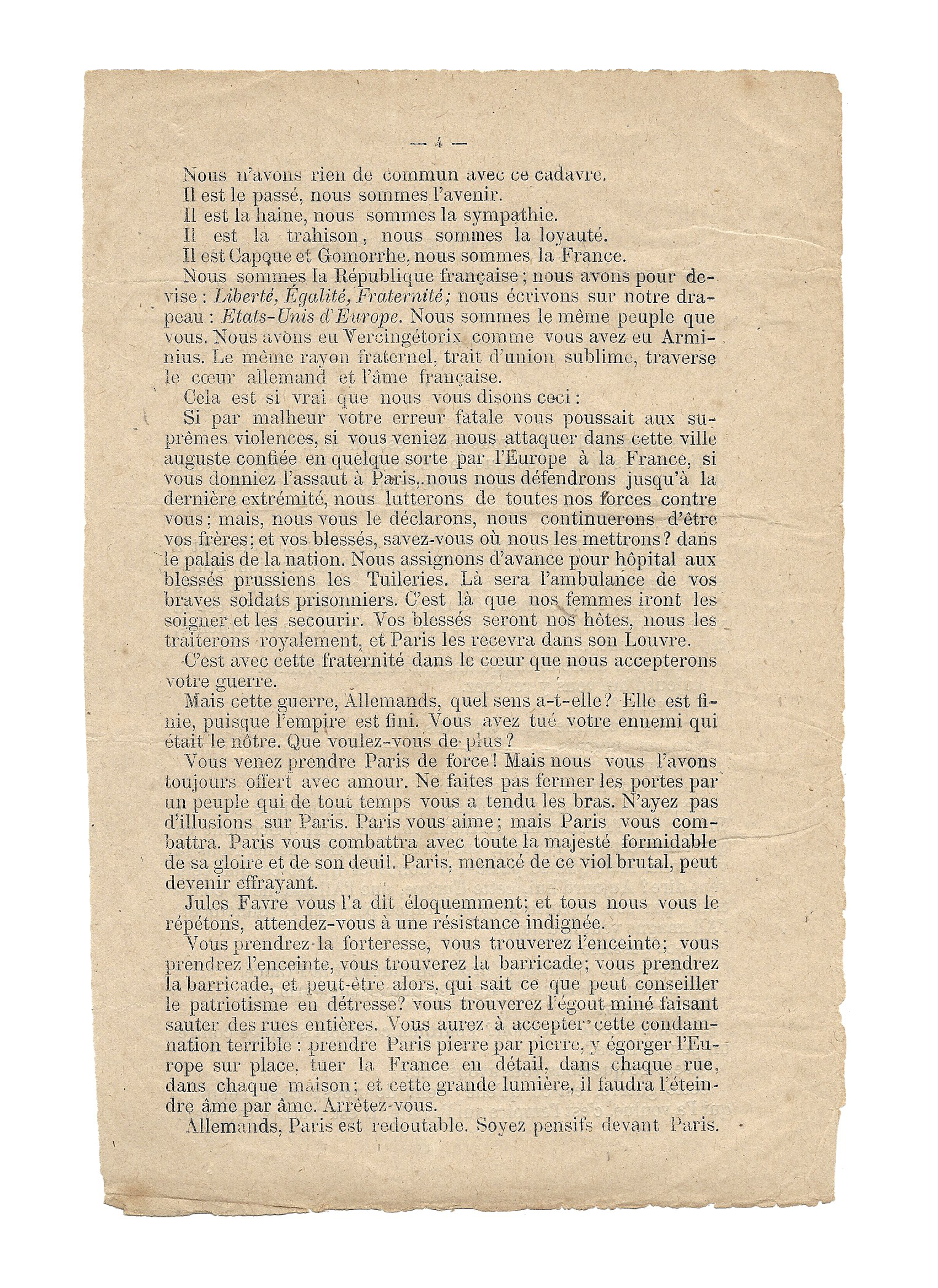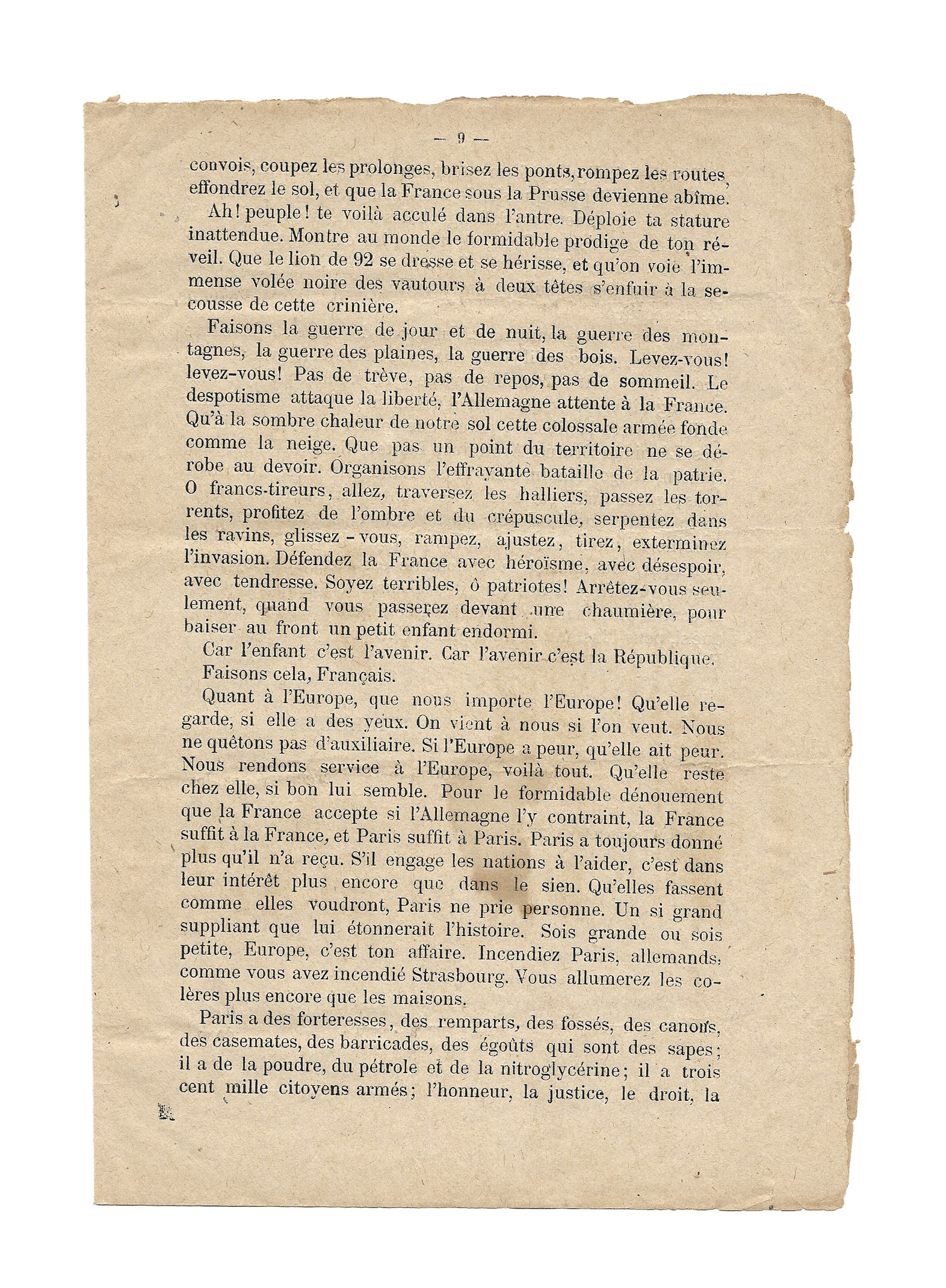 Back in France on September 5, 1870, after a 19-year exile, Parisians gave the writer a triumphant welcome. He actively participated in the defence of the besieged city, as demonstrated by these pamphlets, with their powerful and magnificent texts.