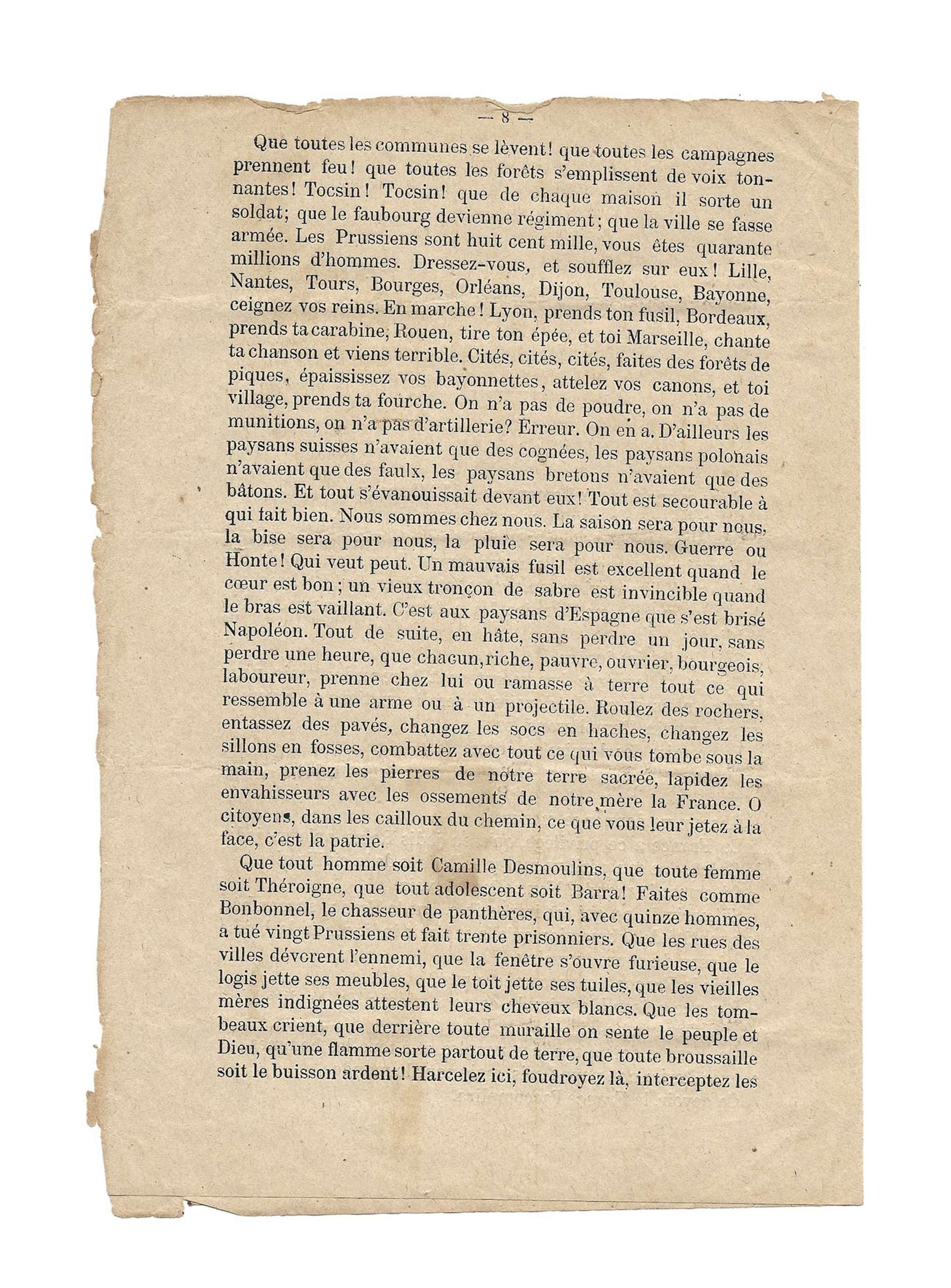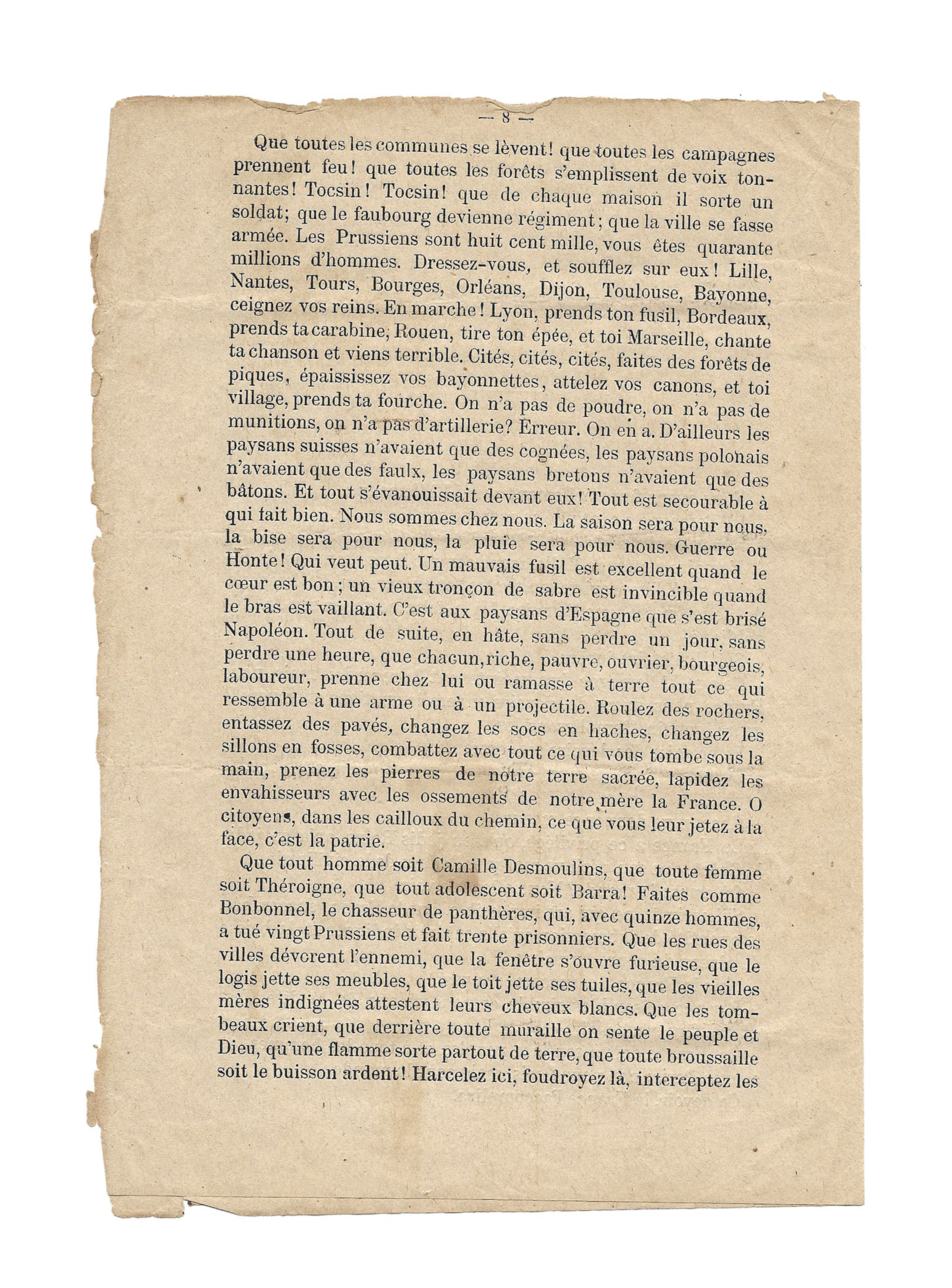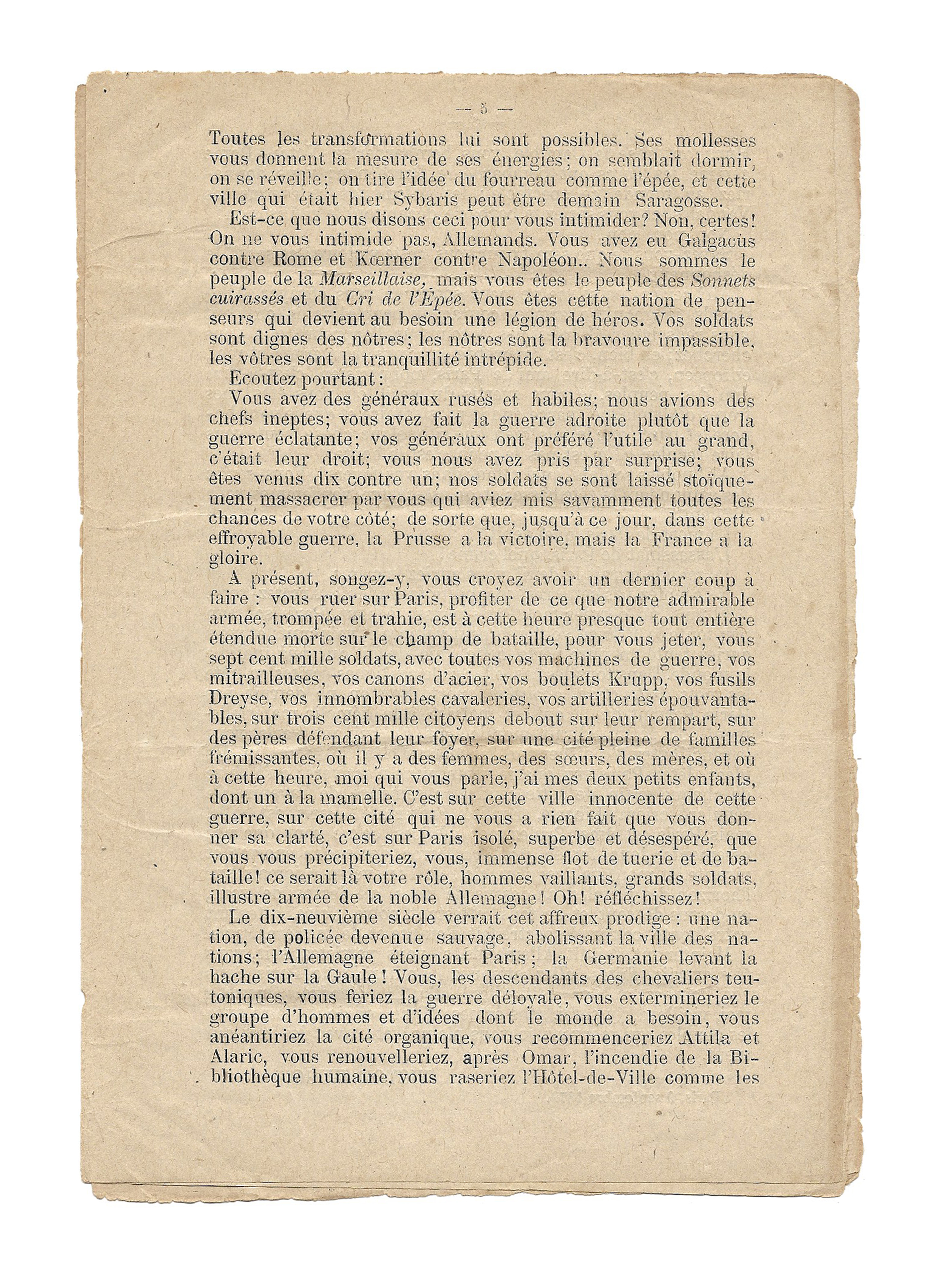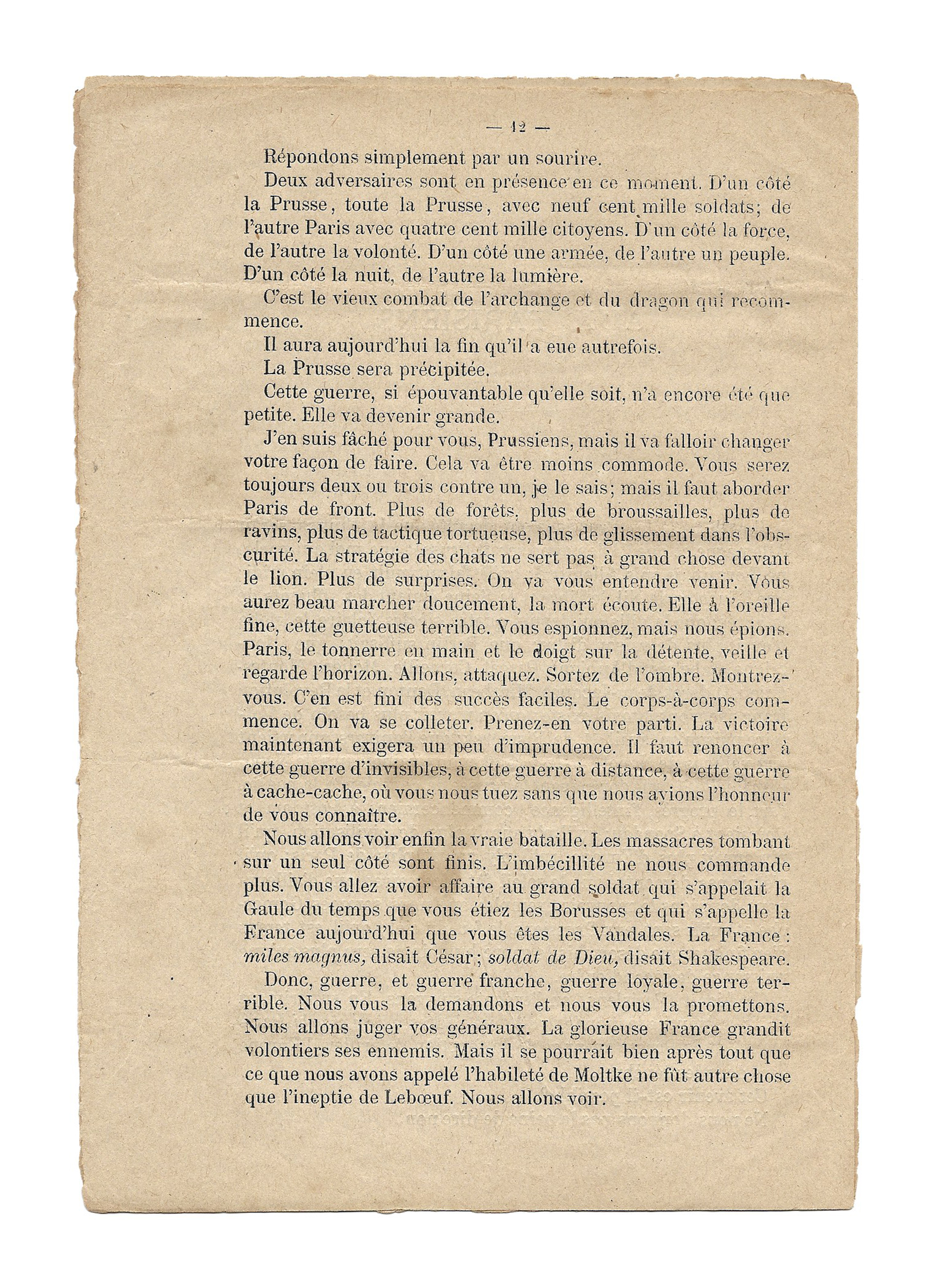 Back in France on September 5, 1870, after a 19-year exile, Parisians gave the writer a triumphant welcome. He actively participated in the defence of the besieged city, as demonstrated by these pamphlets, with their powerful and magnificent texts.