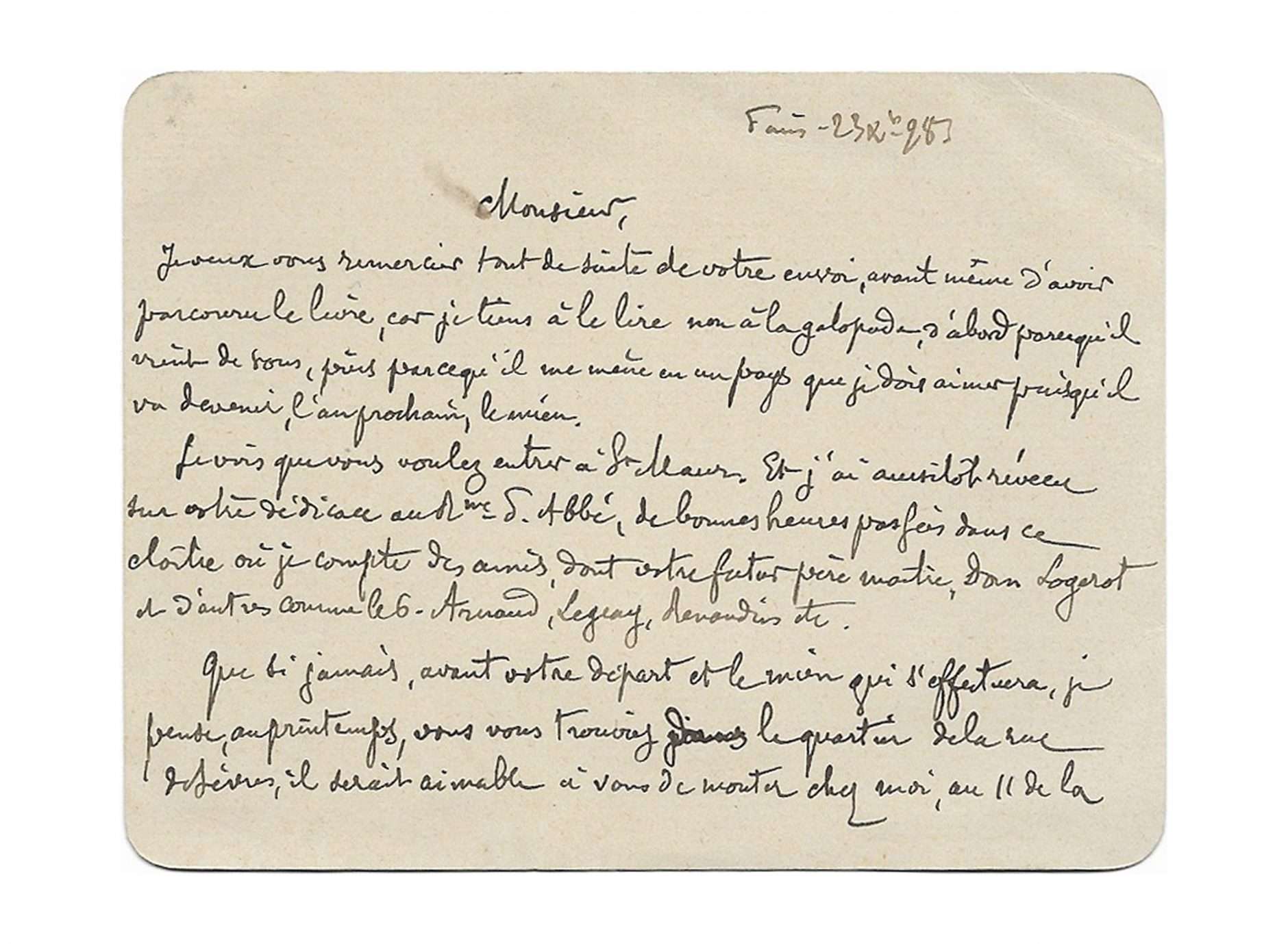 Je vois que vous voulez entrer à St Maur. Et j’ai aussitôt revécu sur votre dédicace au M[onast]ère S. Abbé, de bonnes heures parfois dans ce cloître où je compte des amis, dont votre futur père maître, Don Logerot et d’autres comme le G. Armand, Legray, Devaudin etc.