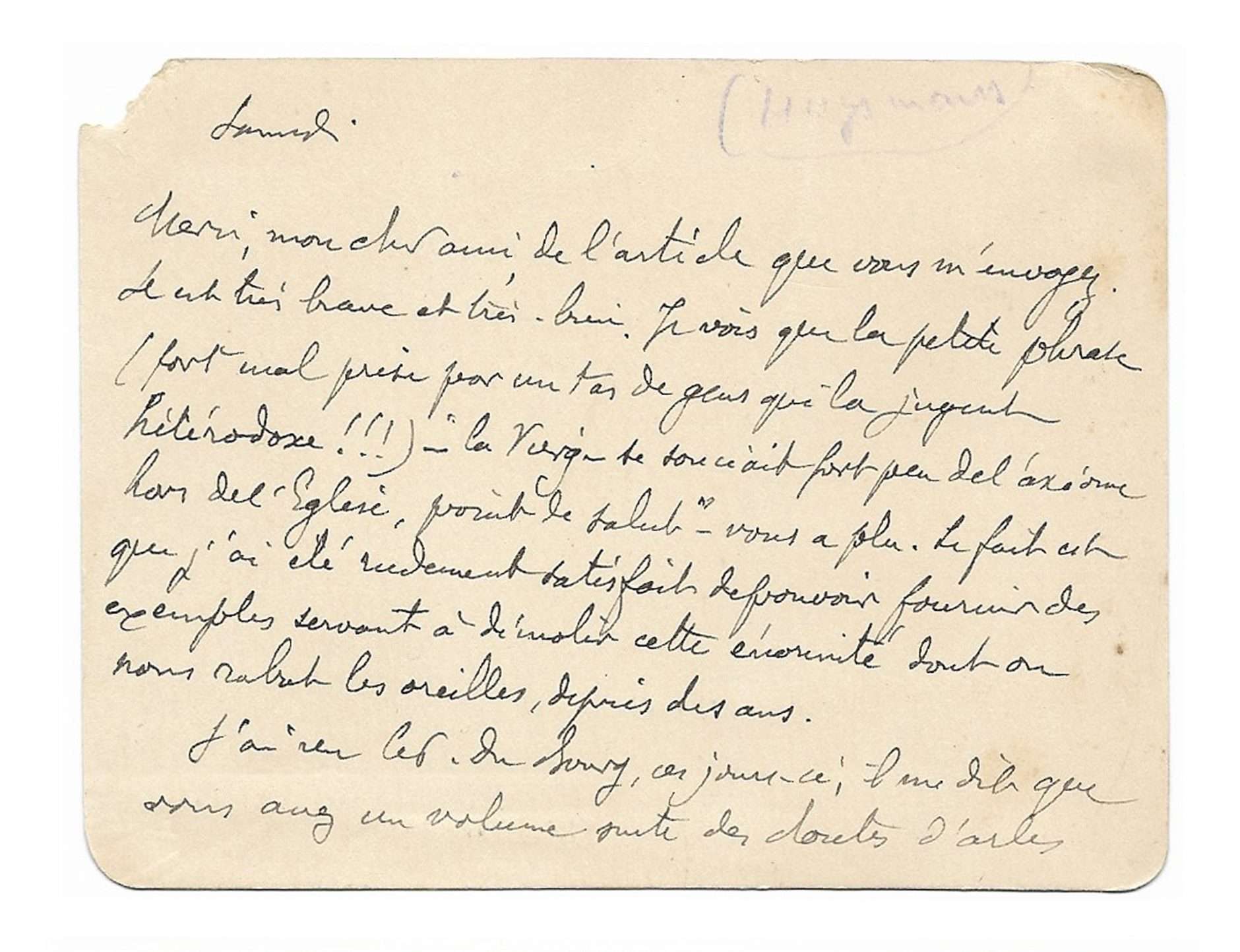 « Merci, mon cher ami, de l’article que vous m’envoyez. Il est très brave et très-bien. Je vois que la petite phrase (fort mal prise par un tas de gens qui la jugent hétérodoxe !!!) – “la Vierge se souciait fort peu de l’axiome hors de l’Église, point de salut”¹ – vous a plu. Le fait est que j’ai été rudement satisfait de pouvoir fournir des exemples servant à démolir cette énormité dont on nous rabat [sic] les oreilles, depuis des ans.