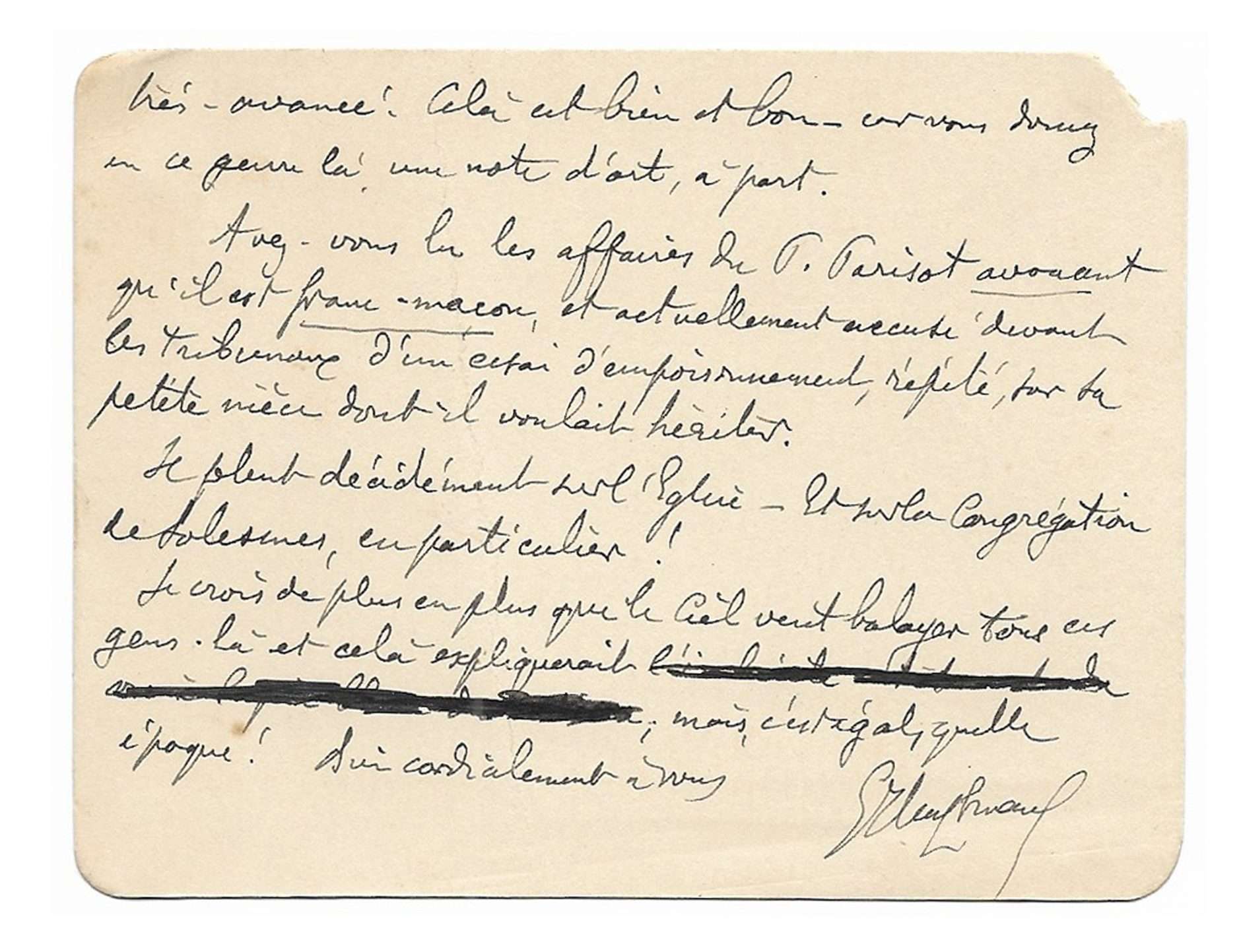 Je crois de plus en plus que le Ciel veut balayer tous ces gens-là et cela expliquerait [several words crossed out], mais c’est égal, quelle époque ! Bien cordialement à vous