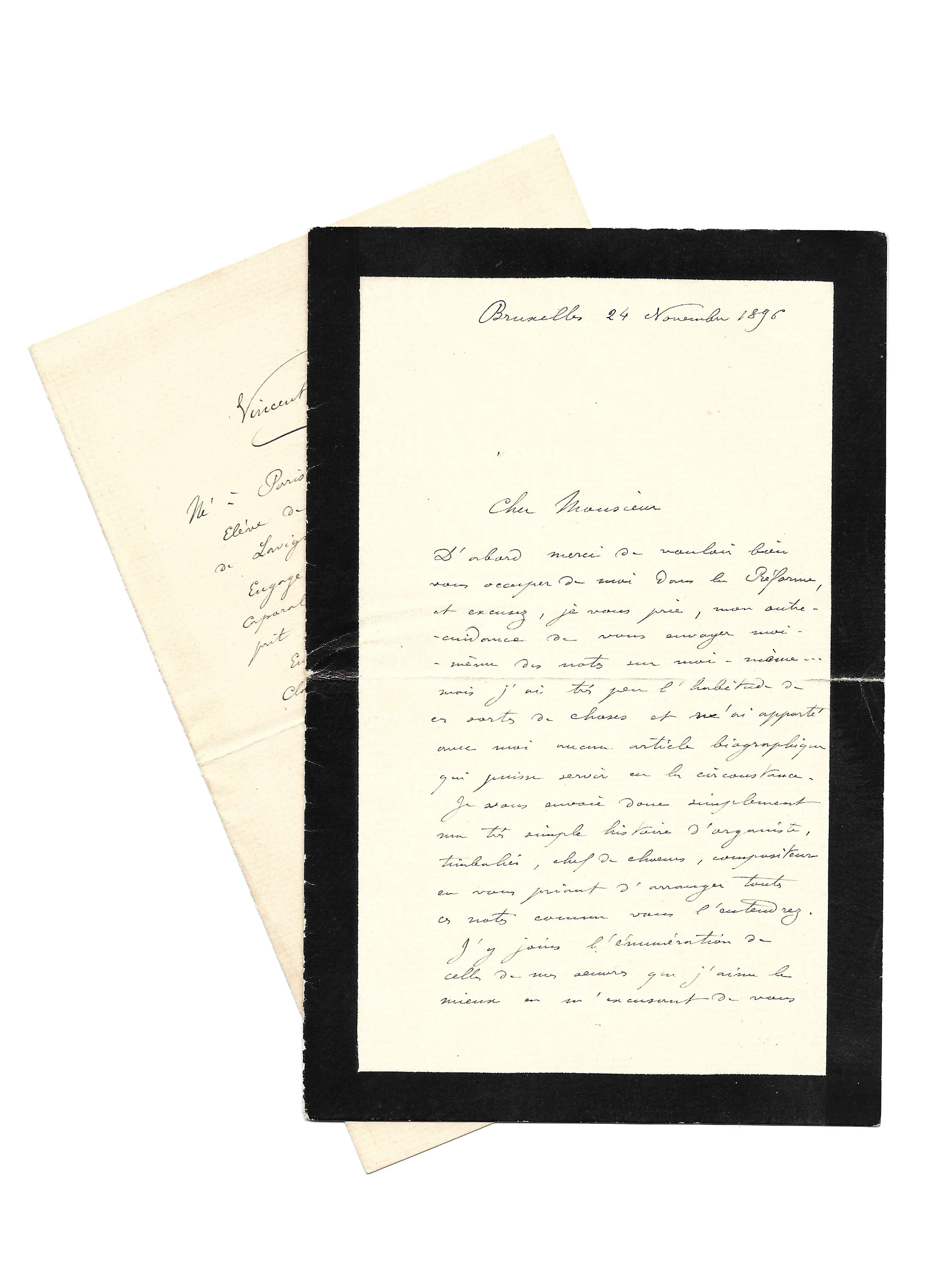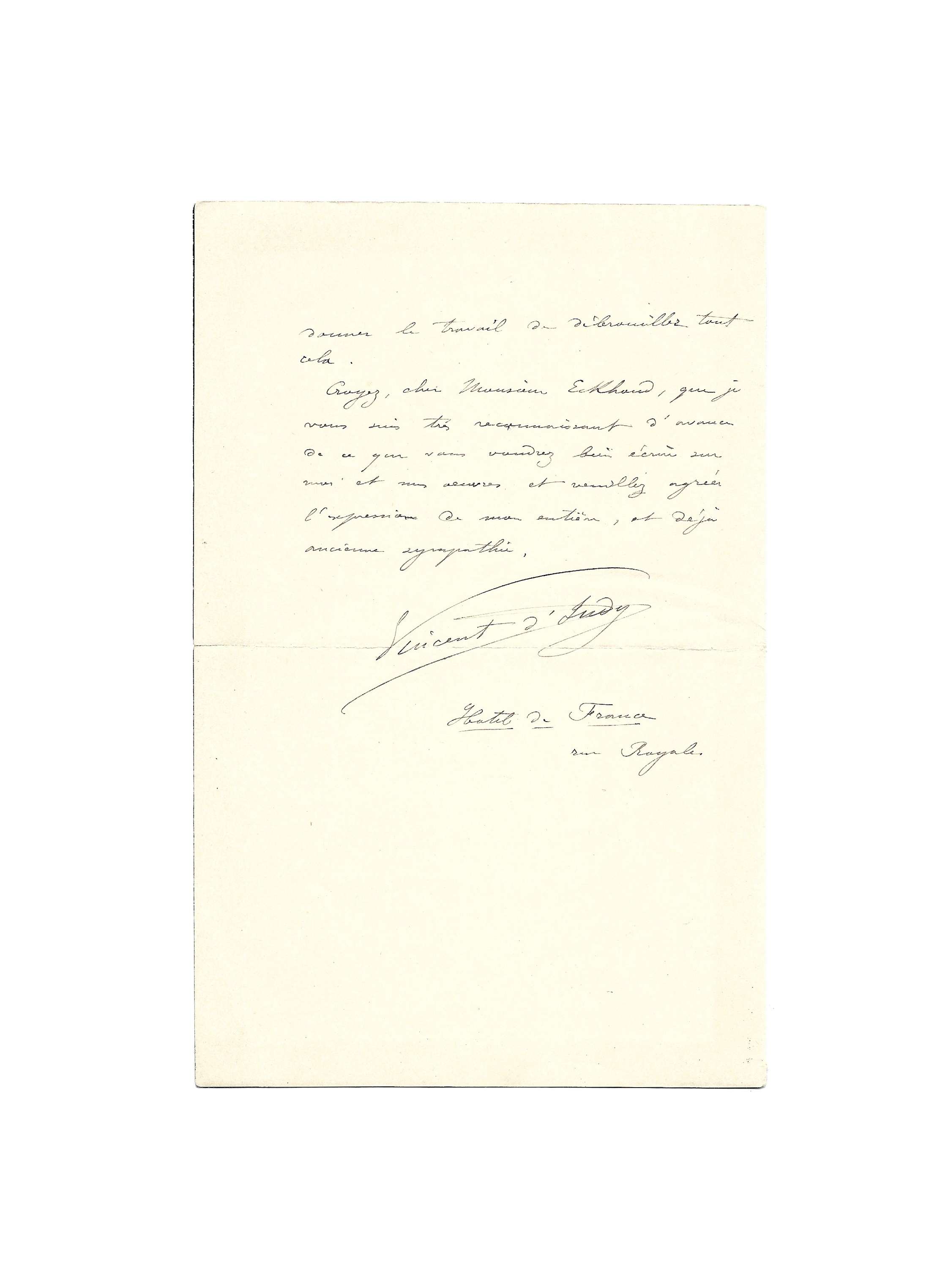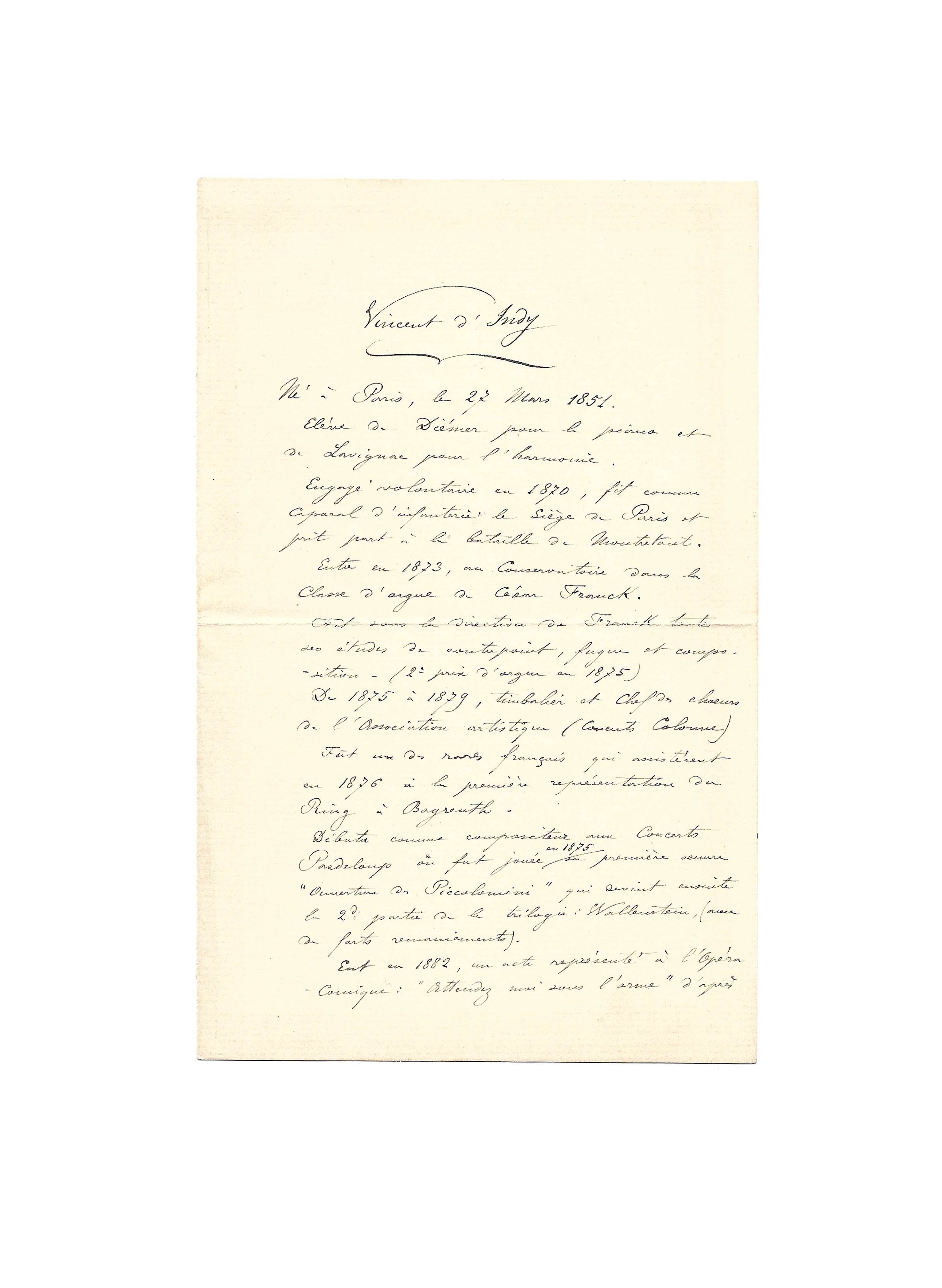 Autograph letter signed “Vincent d’Indy“, enhanced with autograph CV