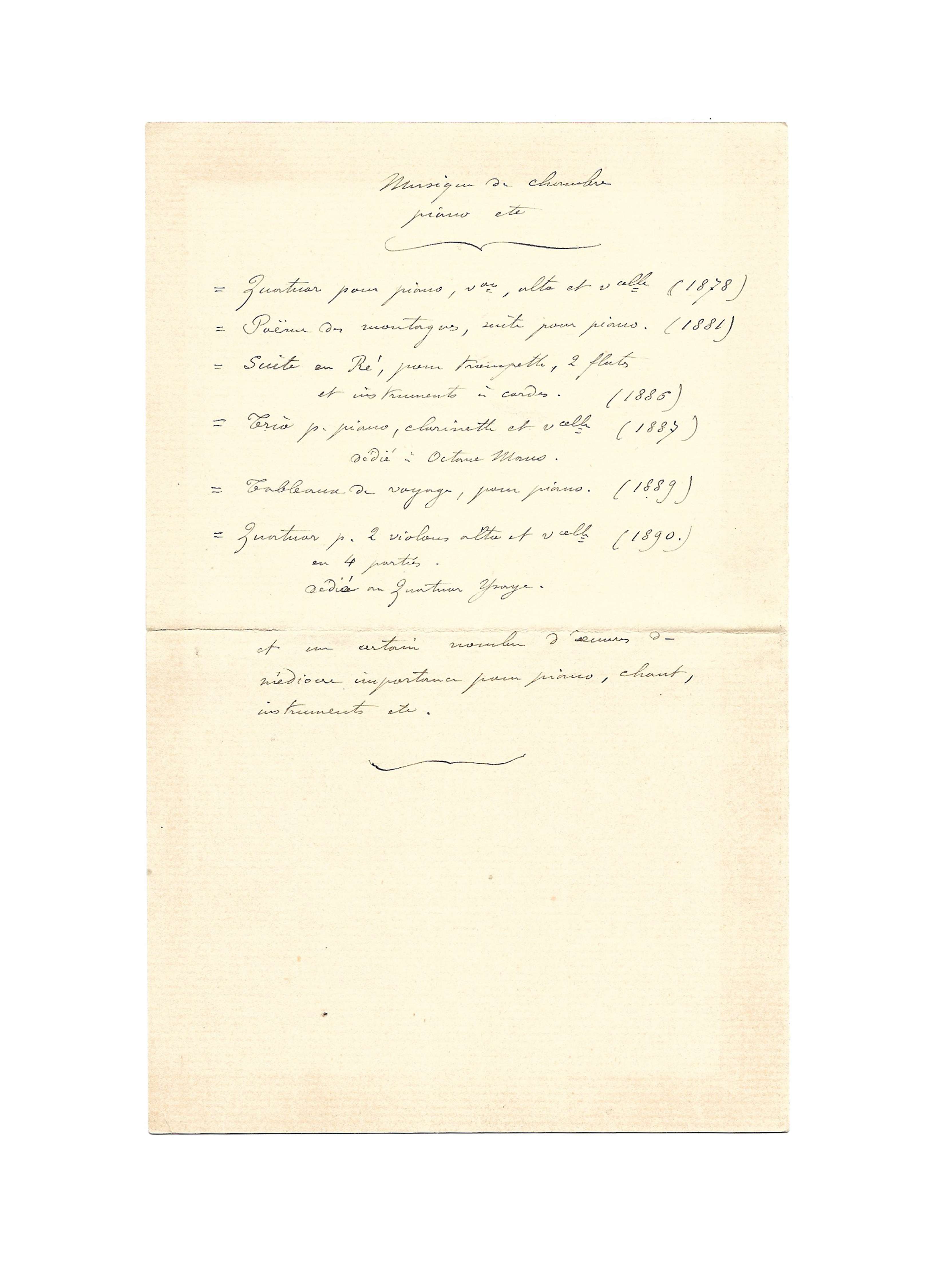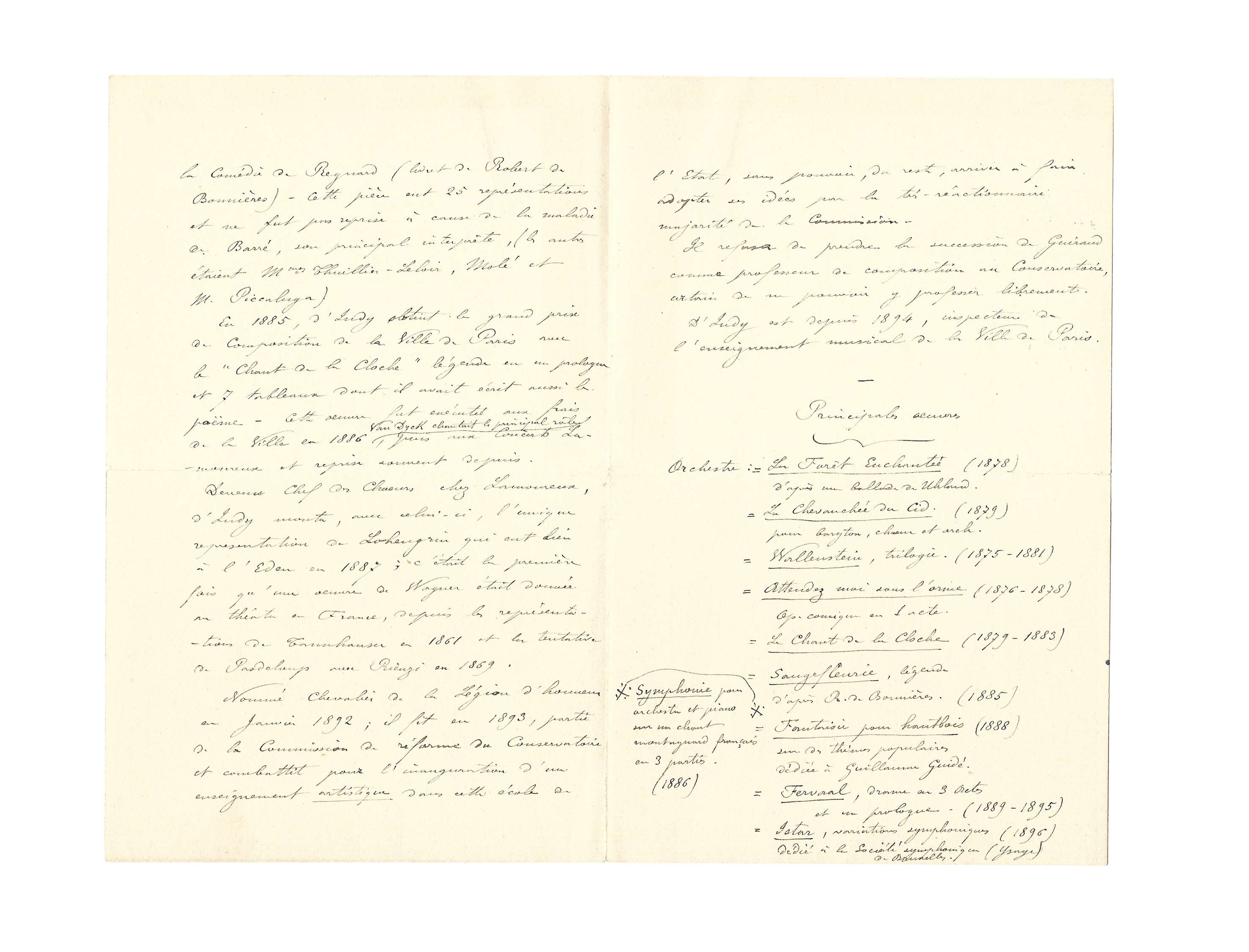 Vincent d’Indy attaches his Curriculum Vitae, signed in the header, showing all his main works.