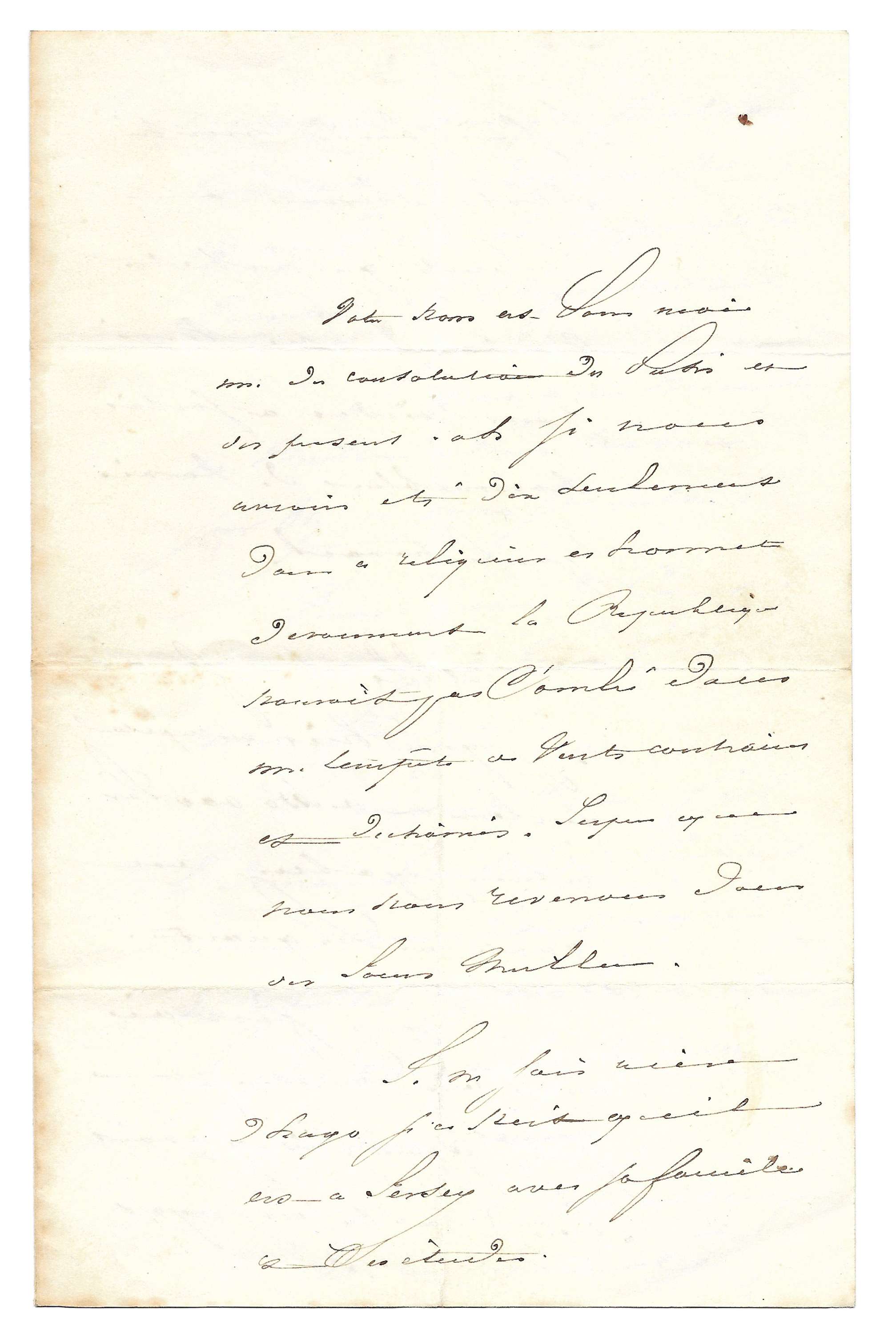 “Votre nom est pour moi une des consolations du passé et du présent. Ah si nous avions été dix seulement dans un religieux et honnête dévouement la République n’aurait pas sombré dans une tempête de vents contraires et déchaînés. J’espère que nous nous reverrons dans des jours meilleurs.