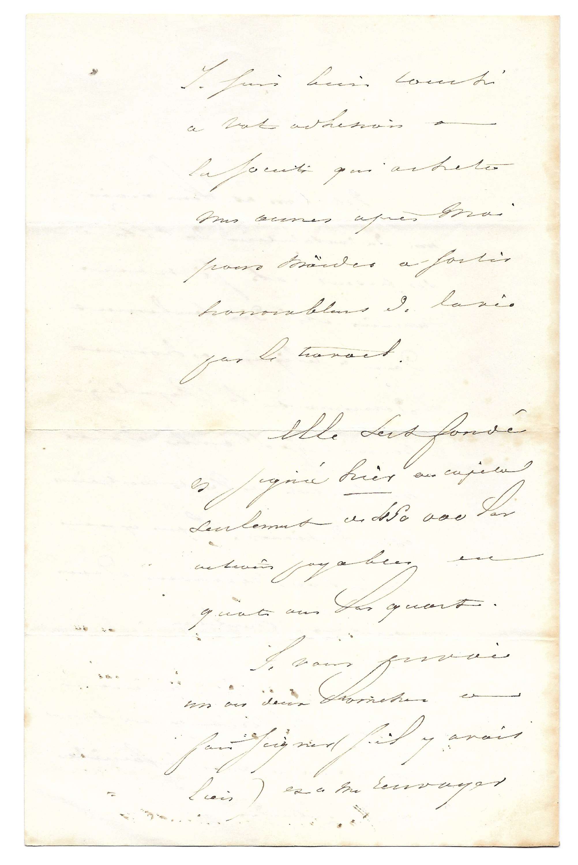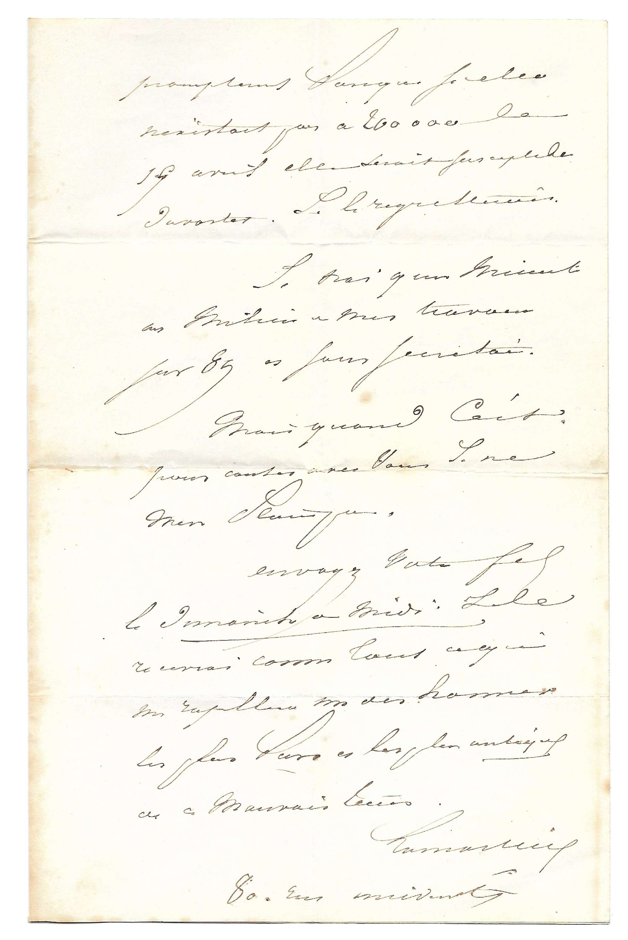 Je suis bien touché a votre adhésion à la société qui achète mes œuvres après moi pour m’aider a sortir honorablement de la vie par le travail. Elle s’est fondée et signée hier au capital seulement de 450 000 par actions payables en quarts par quarts. […] Je n’ai qu’une Minute au milieu de mes travaux sur 89 et sous secrétaire. […] Envoyez votre fils Le dimanche à midi. Je le recevrai comme tout ce qui me rappelle un des hommes les plus pur et les plus antiques de ces mauvais tems.