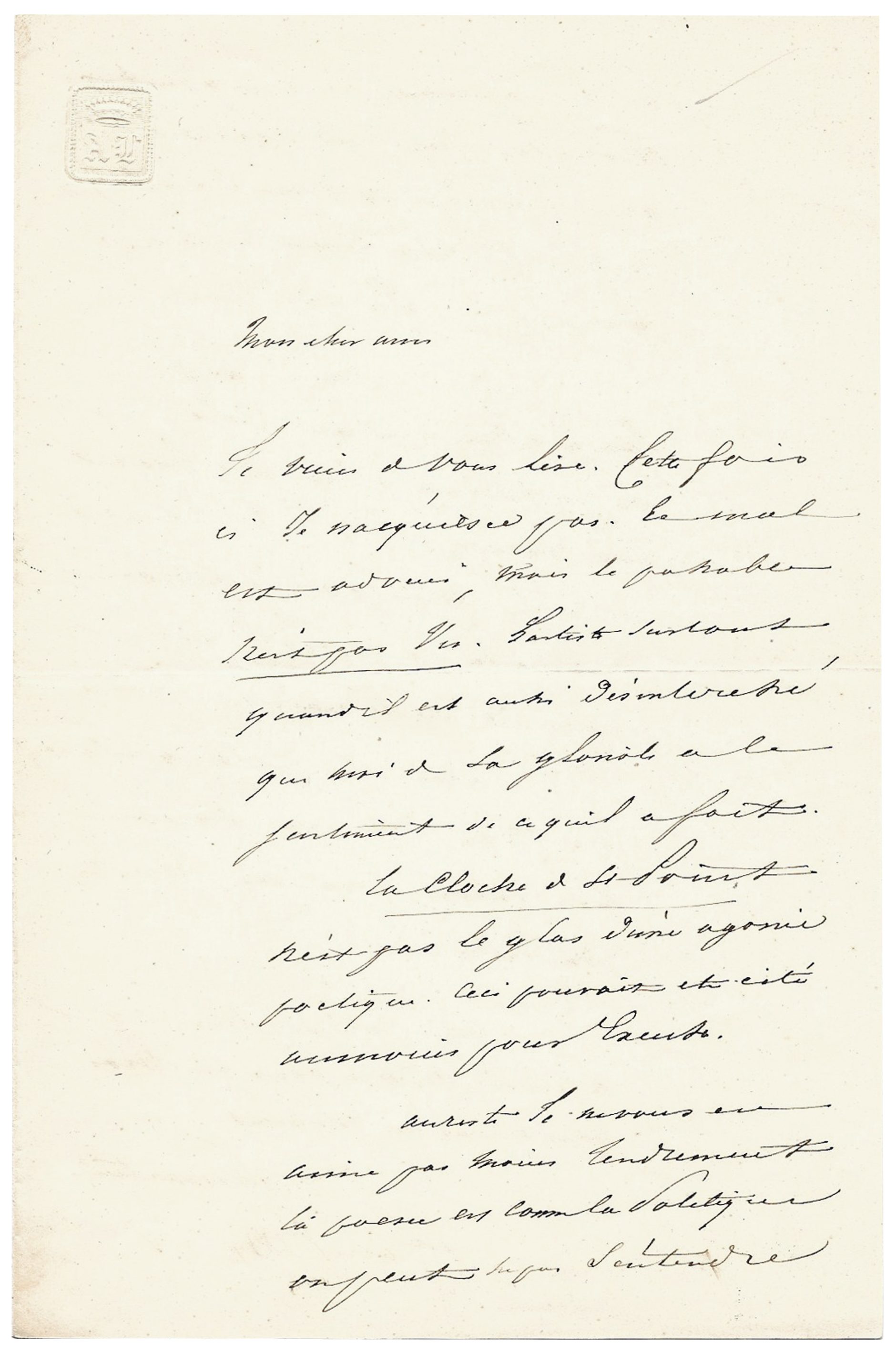 Je viens de vous lire. Cette fois-ci je n’acquiesce pas. Le mal est adouci, mais le passable n’est pas vu. L’artiste, surtout quand il est aussi désintéressé que moi de sa gloriole, a le sentiment de ce qu’il a fait. La Cloche de St-Point n’est pas le glas d’une agonie poétique. Ceci pouvait être cité au moins pour excuse.