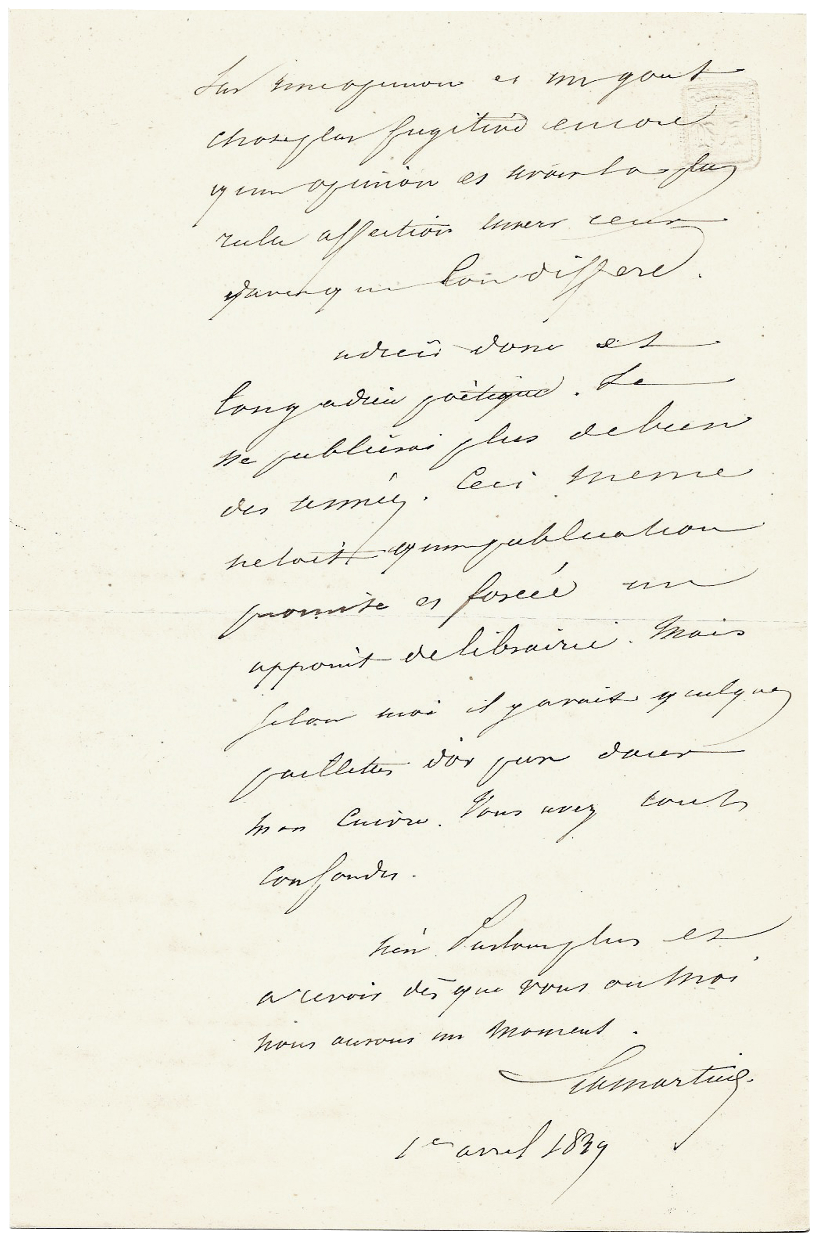 An unpublished letter marking the end of Lamartine’s great Romantic output