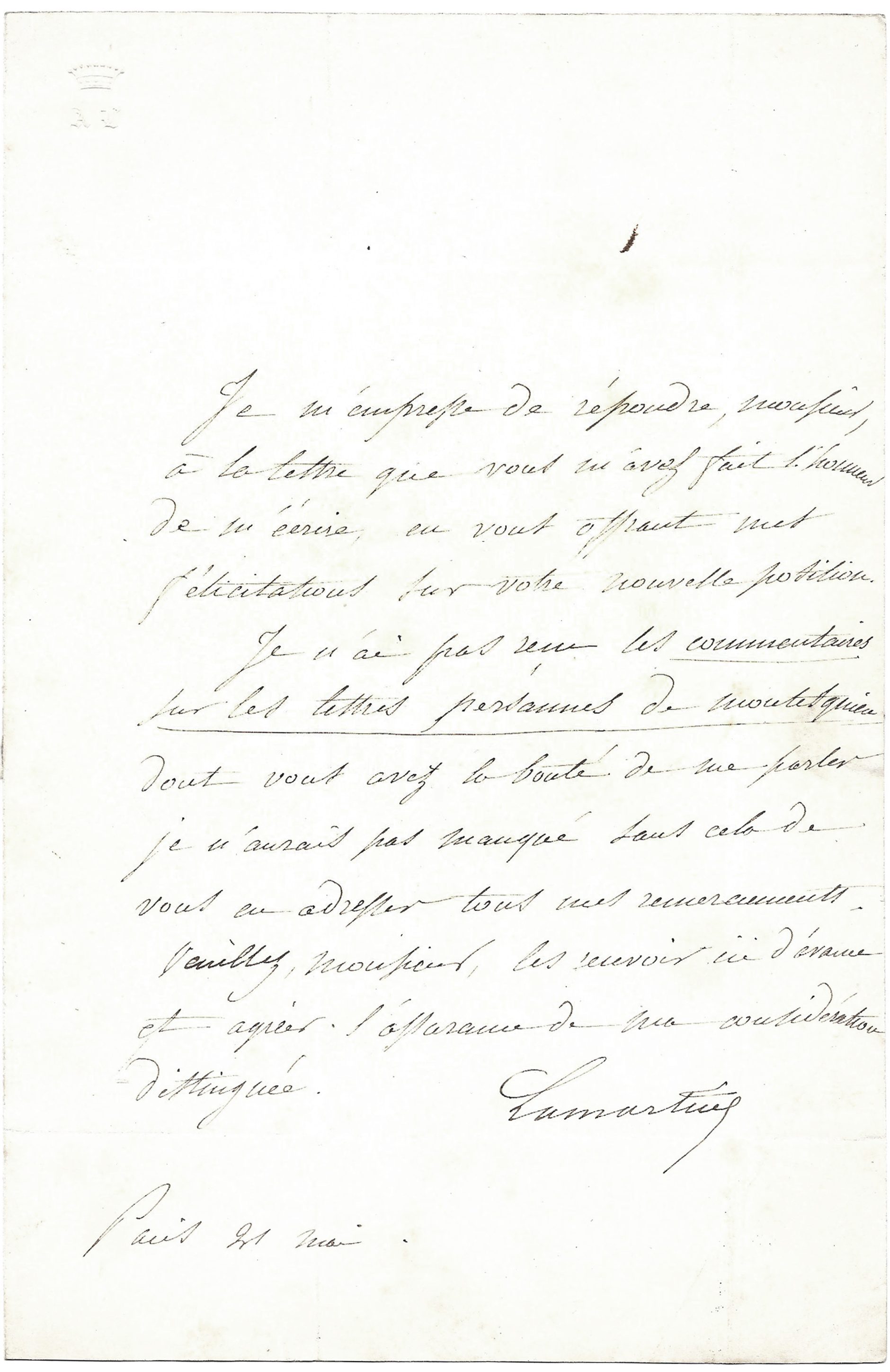Lamartine asked his correspondent for a study of Montesquieu’s Persian Letters, which the latter had promised him