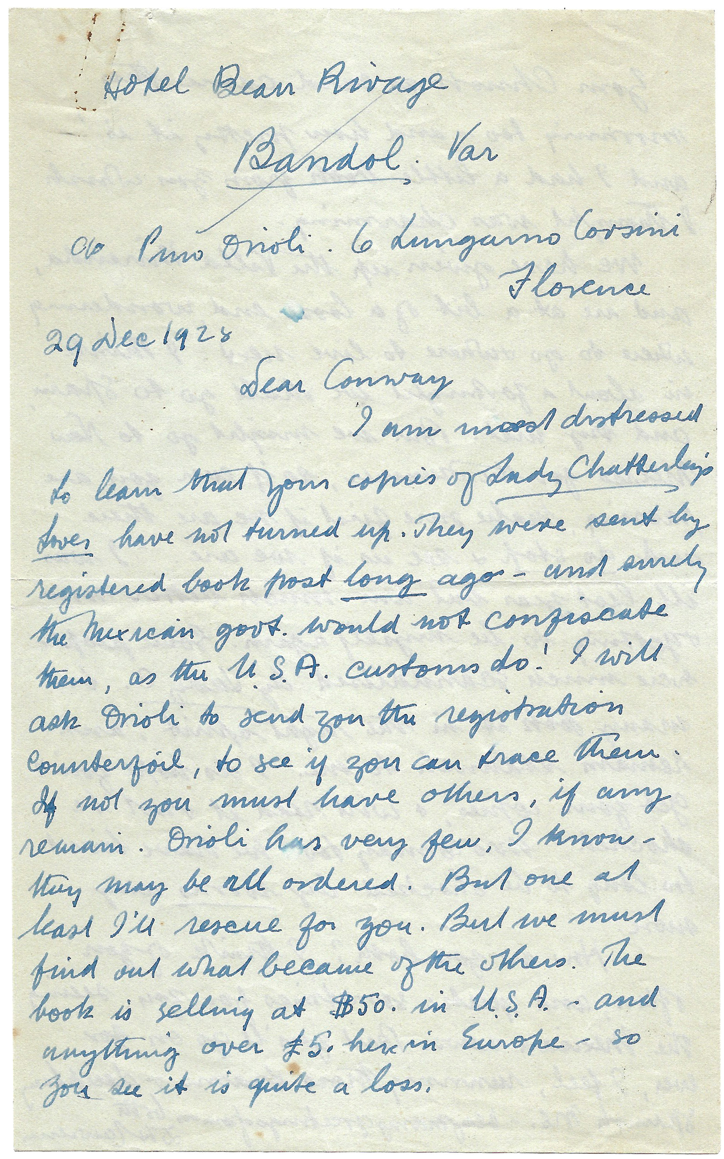 I am most distressed to learn that your copies of Lady Chatterley’s Lover have not turned up. They were sent by registered book post long ago – and surely the Mexican govt. would not confiscate them, as the U.S.A. customs do! I will ask Orioli to send you the registration counterfoil, to see if you can trace them. If not you must have others, if any remain. Orioli has very few, I know – they may be all ordered. But one at least I’ll rescue for you. But we must find out what became of the others. The book is selling at $50. in USA- and anything over £5. here in Europe – so you see it is quite a loss.