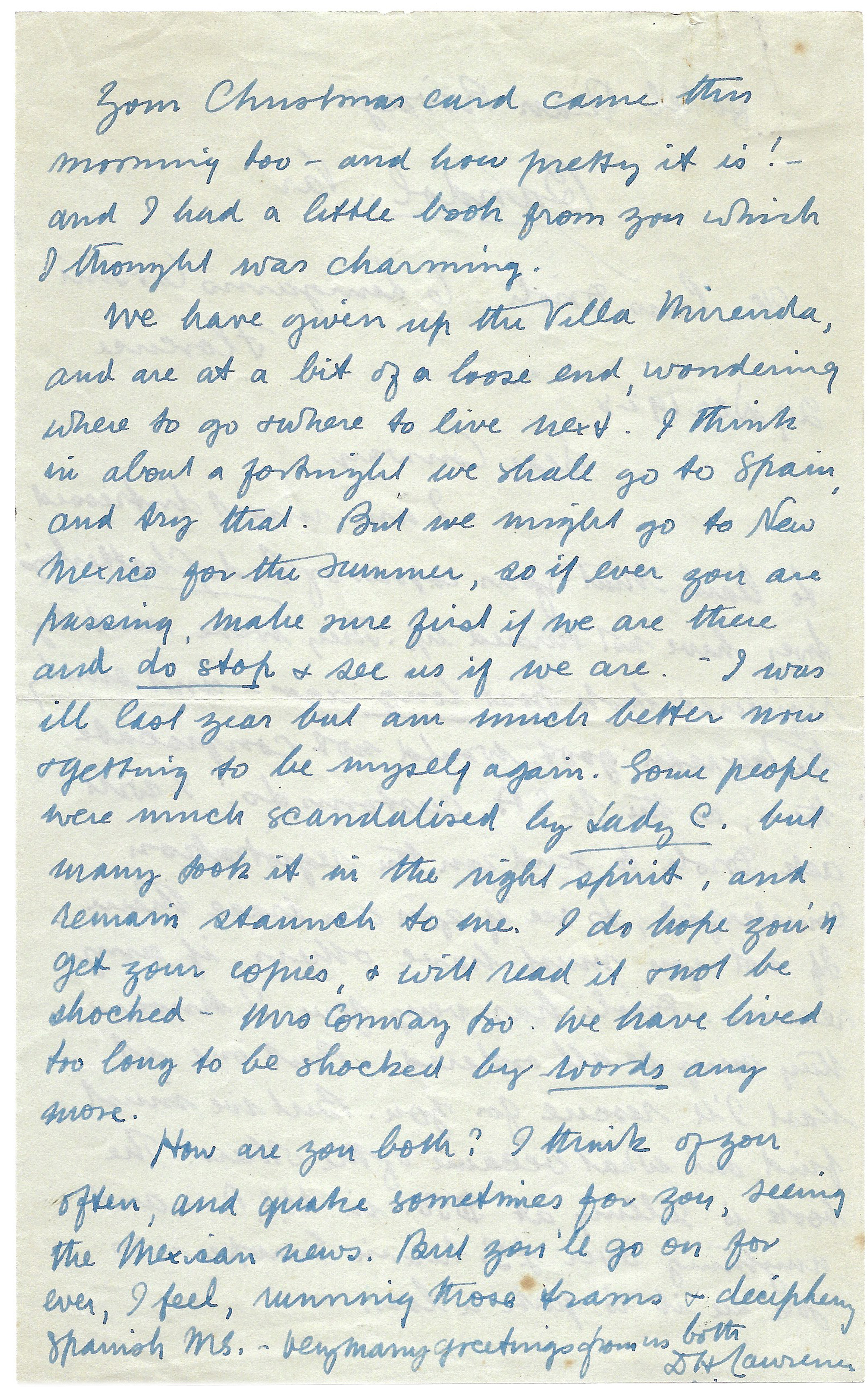 We have given up the Villa Mirenda, and are at a bit of loose end, wondering where to go and where to live next. I think in about a fortnight we shall go to Spain, and try that. But we might go to New Mexico for the summer, so if ever you are passing, make sure first if we are there and do stop and see us if we are. – I was ill last year but I am much better now and getting to be myself again. Some people were much scandalized by Lady C. but many took it in the right spirit, and remain staunch to me. I do hope you’ll get your copies, and will read it and not be shocked – Mrs Conway too. We have lived too long to be shocked by words any more.