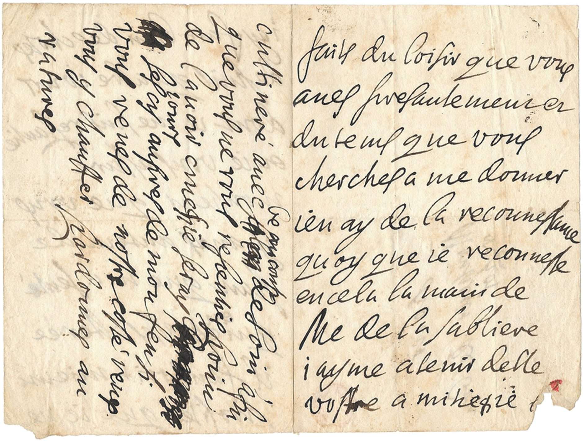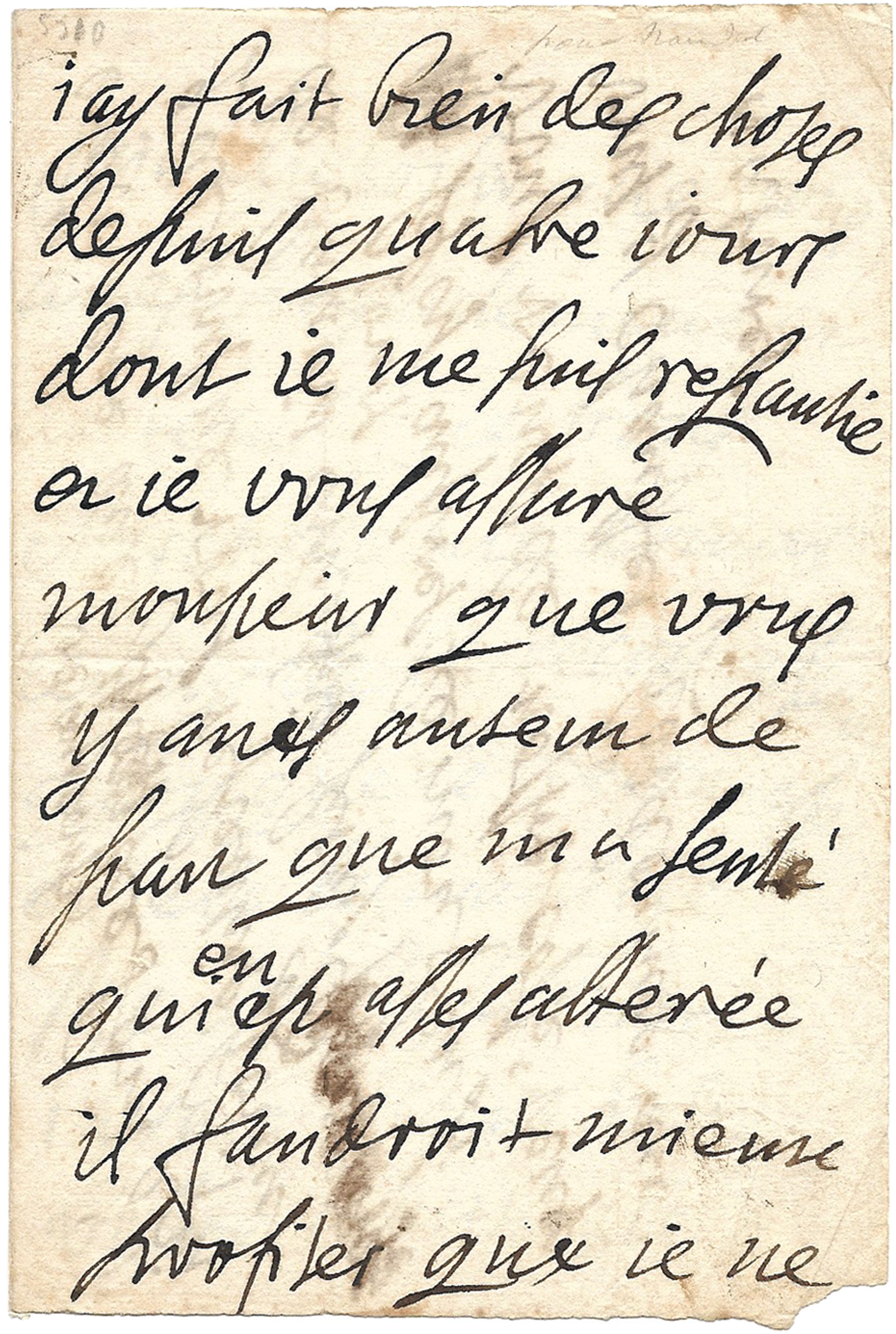 « J’ay fait bien des choses depuis quatre jours dont je me suis repantie et je vous assure monsieur que vous y avez autem de part que ma senté qui en est assez alterée.