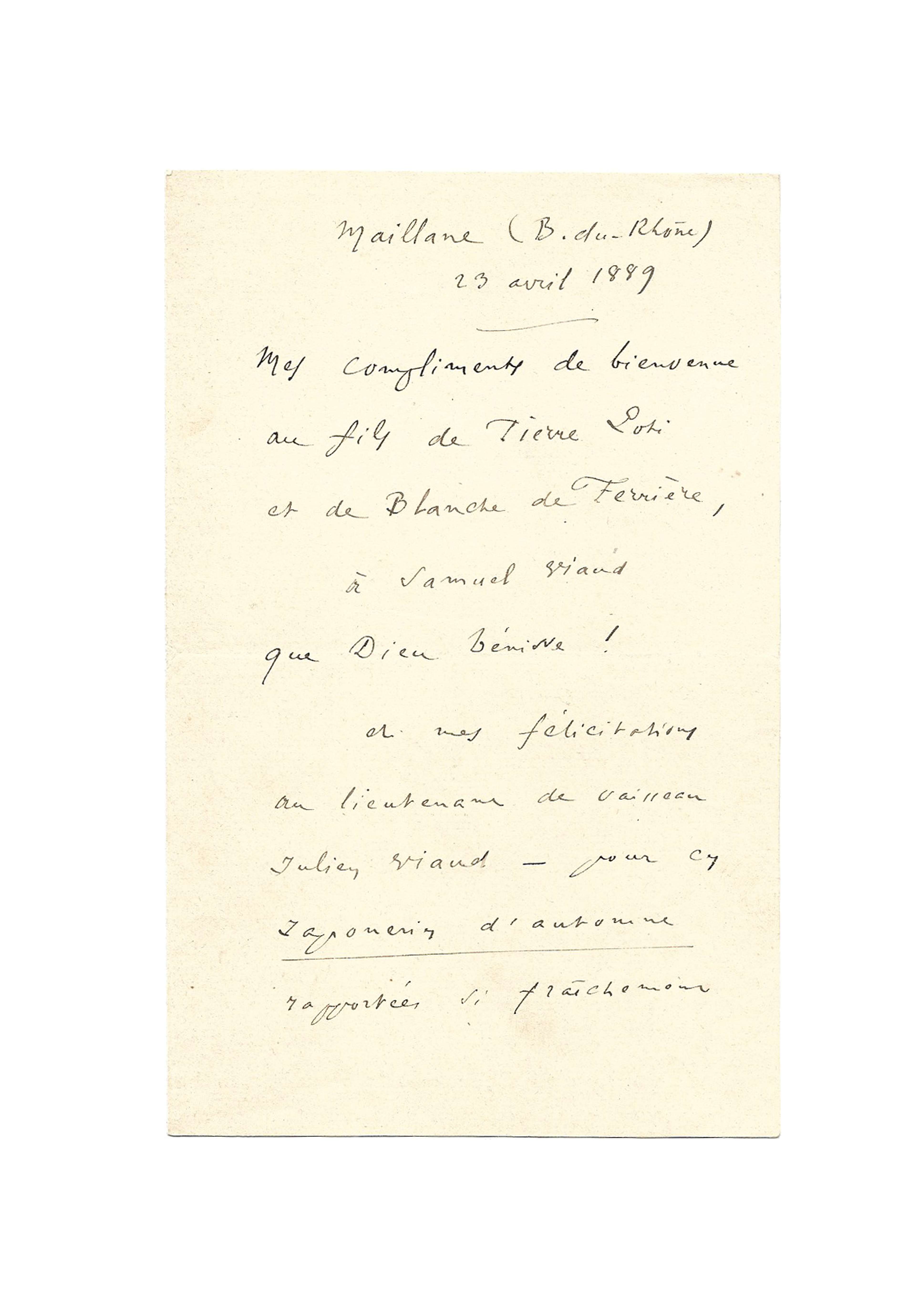 Mistral compliments Pierre Loti and his wife Blanche Ferrière for the birth of their son Samuel