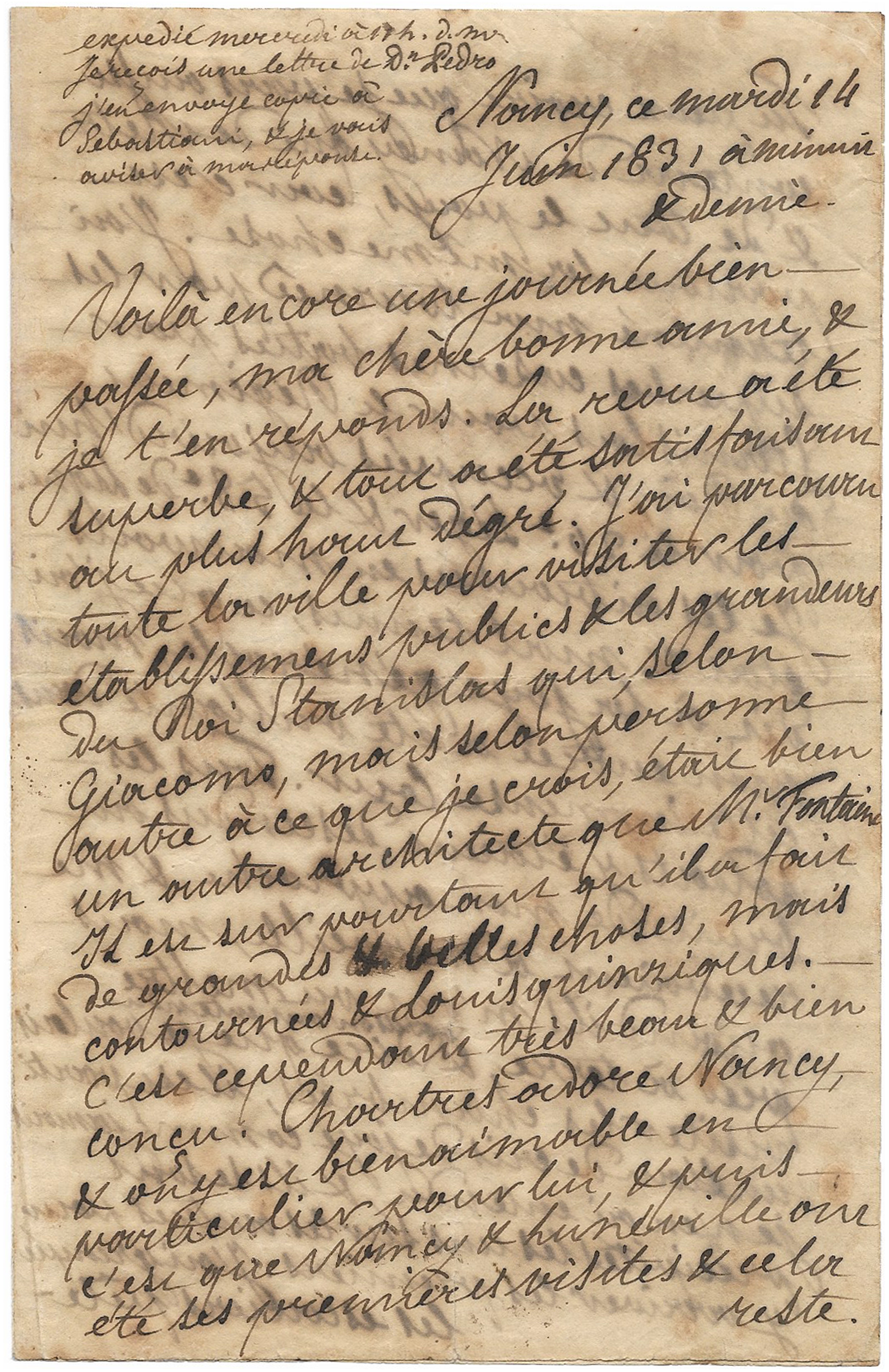 « Voilà encore une journée bien passé, ma chère bonne amie, je t’en réponds. La revue a été superbe […] J’ai parcouru toute la ville pour visiter les établissements publics et les grandeurs du Roi Stanislas [Leszczyński, père de la reine Marie Leszczyńska] qui, selon Giacomo, mais selon personne autre à ce que je crois, était bien un autre architecte que Mr [Pierre] Fontaine. Il est sûr pourtant qu’il a fait de grandes et belles choses, mais contournées et Louis-quinziques [sic].