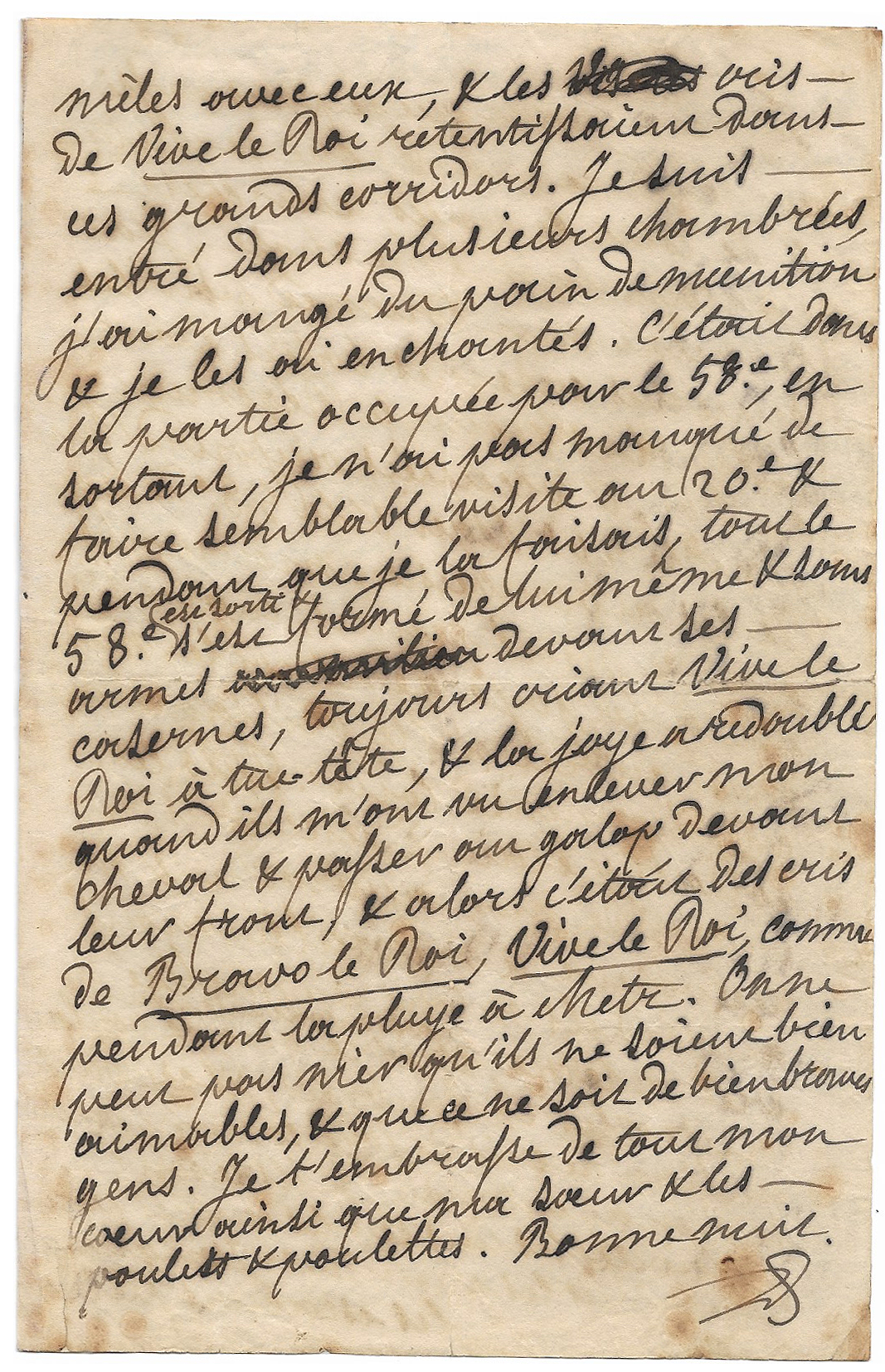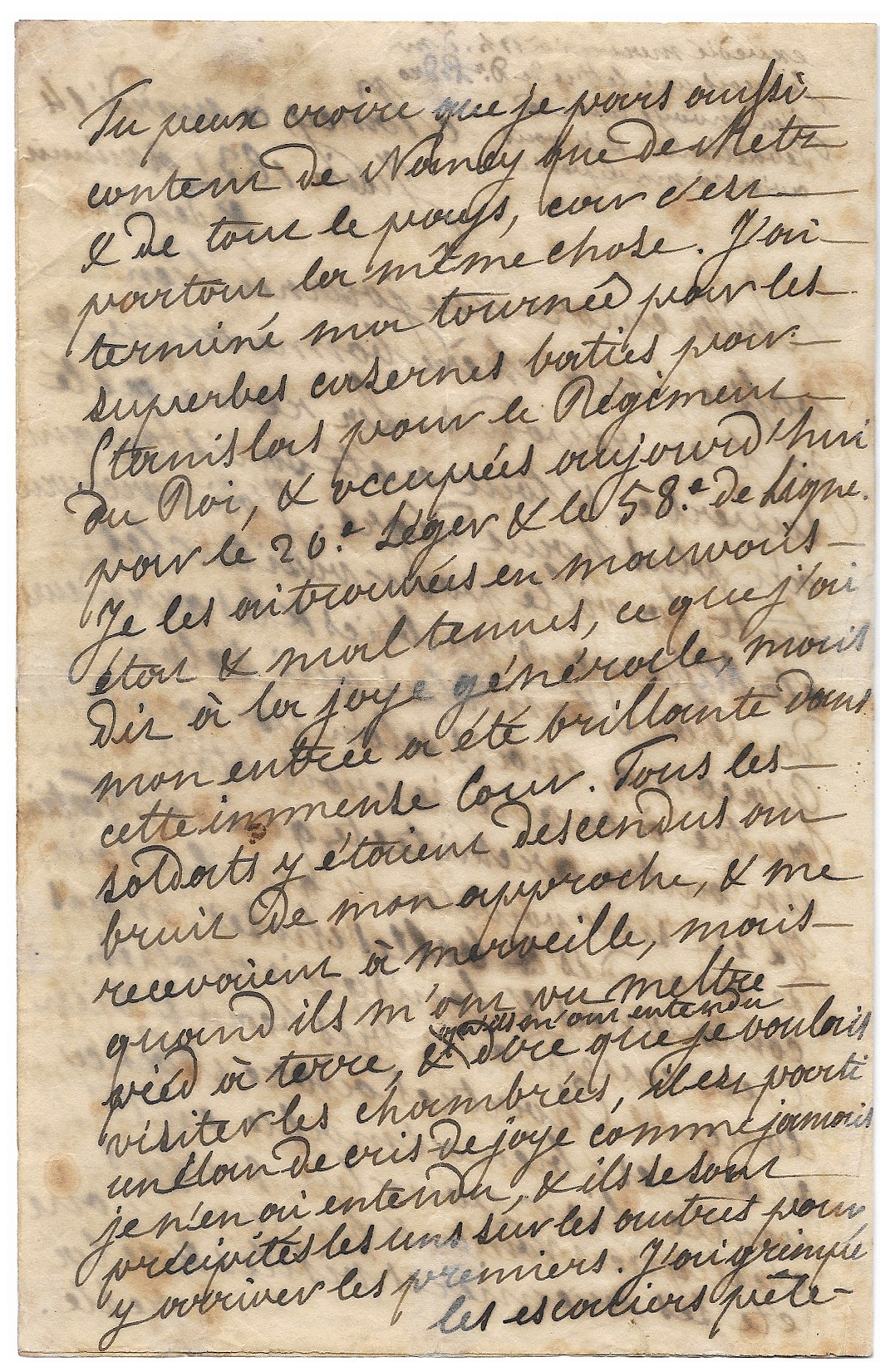 Tu peux croire que je pars aussi content de Nancy que de Metz et de tout le pays, car c’est partout la même chose. J’ai terminé ma tournée pour les superbes casernes bâties pour Stanislas pour le Régiment du Roi, et occupées aujourd’hui pour le 26e léger et le 58e de ligne. Je les ai trouvées en mauvais état et mal tenues, ce que j’ai dit à la joye générale, mais mon entrée à été brillante dans cette immense cour. Tous les soldats y étaient descendus au bruit de mon approche, et me recevaient à merveille, mais quand ils m’ont vu mettre pied à terre, et qu’ils m’ont entendu dire que je voulais visiter les chambrées, il est parti un élan de cris de joye comme jamais je n’en ai entendu, et ils se sont précipités les uns sur les autres pour y arriver les premiers. J’ai grimpé les escaliers pêle-mêle avec eux, et les cris de Vive le Roi retentissaient dans ces grands corridors. Je suis entré dans plusieurs chambrées, j’ai mangé du pain de munition et je les ai enchantés. C’était dans la partie occupée pour le 58e, en sortant, je n’ai pas manqué de faire semblable visite au 20e et pendant que je la faisais, tout le 58e est sorti et s’est formé de lui-même et sorti les armes devant ses casernes, toujours criant Vive le Roi à tût-tête, et la joy a redoublé quand ils m’ont vu emmener mon cheval et passer au galop devant leur front et alors c’était des cris de Bravo le Roi, Vive le Roi, comme pendant la pluye à Metz. On ne peut pas nier qu’ils ne soient bien aimables, et que ce ne soit de bien braves gens. Je t’embrasse de tout mon cœur ainsi que ma sœur [Adélaïde d’Orléans] et les poulets et poulettes [ses enfants]. LP. »