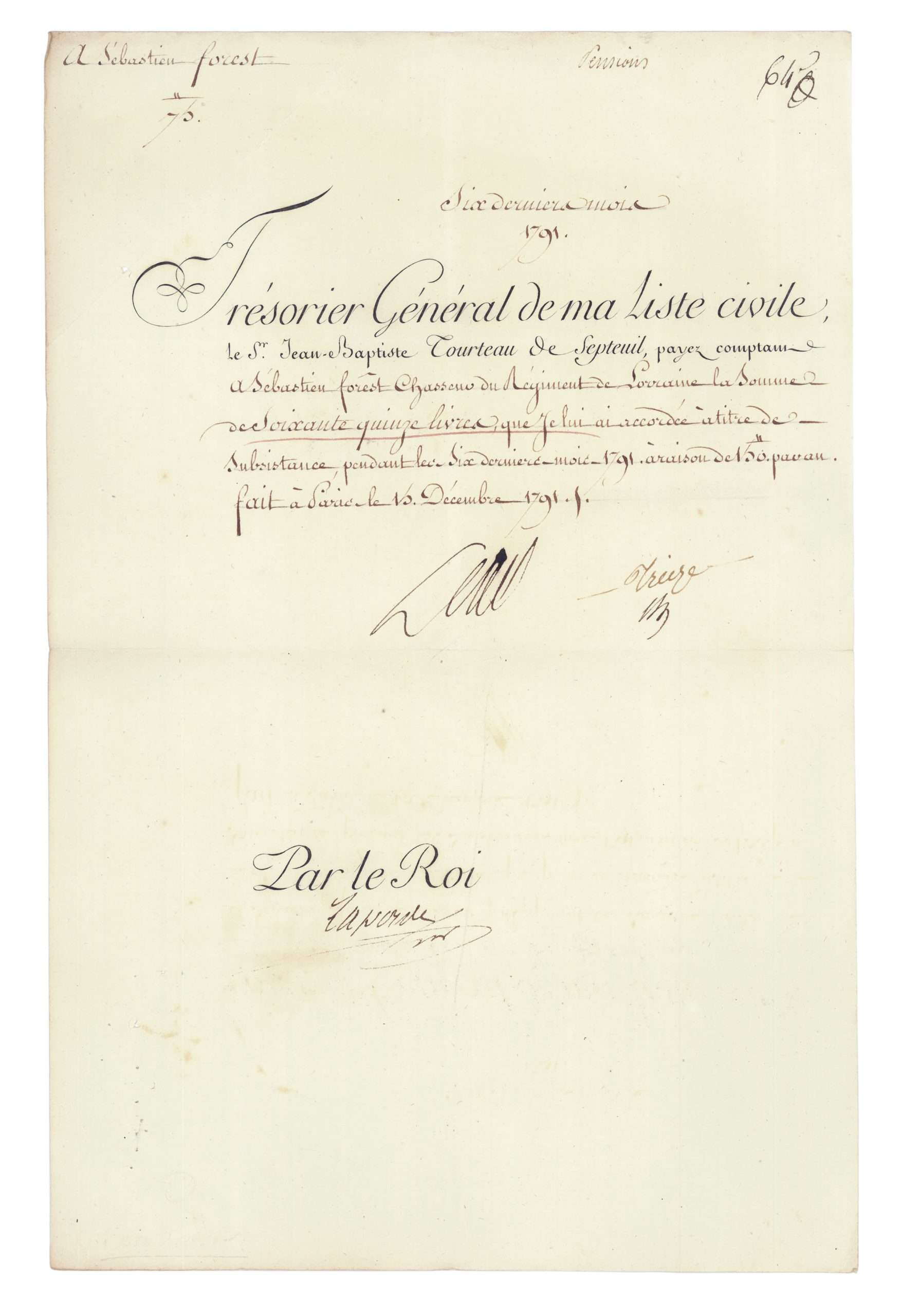 ” Trésorier Général de ma Liste civile, m Sr. Jean-Baptiste Tourteau de Septeuil, payez comptant à Sébastien Forest chasseur du Régiment de Lorraine la somme de soixante quinze livres que je lui ai accordée à titre de subsistance, pendant les six derniers mois de 1791. À raison de 140 livres par an.