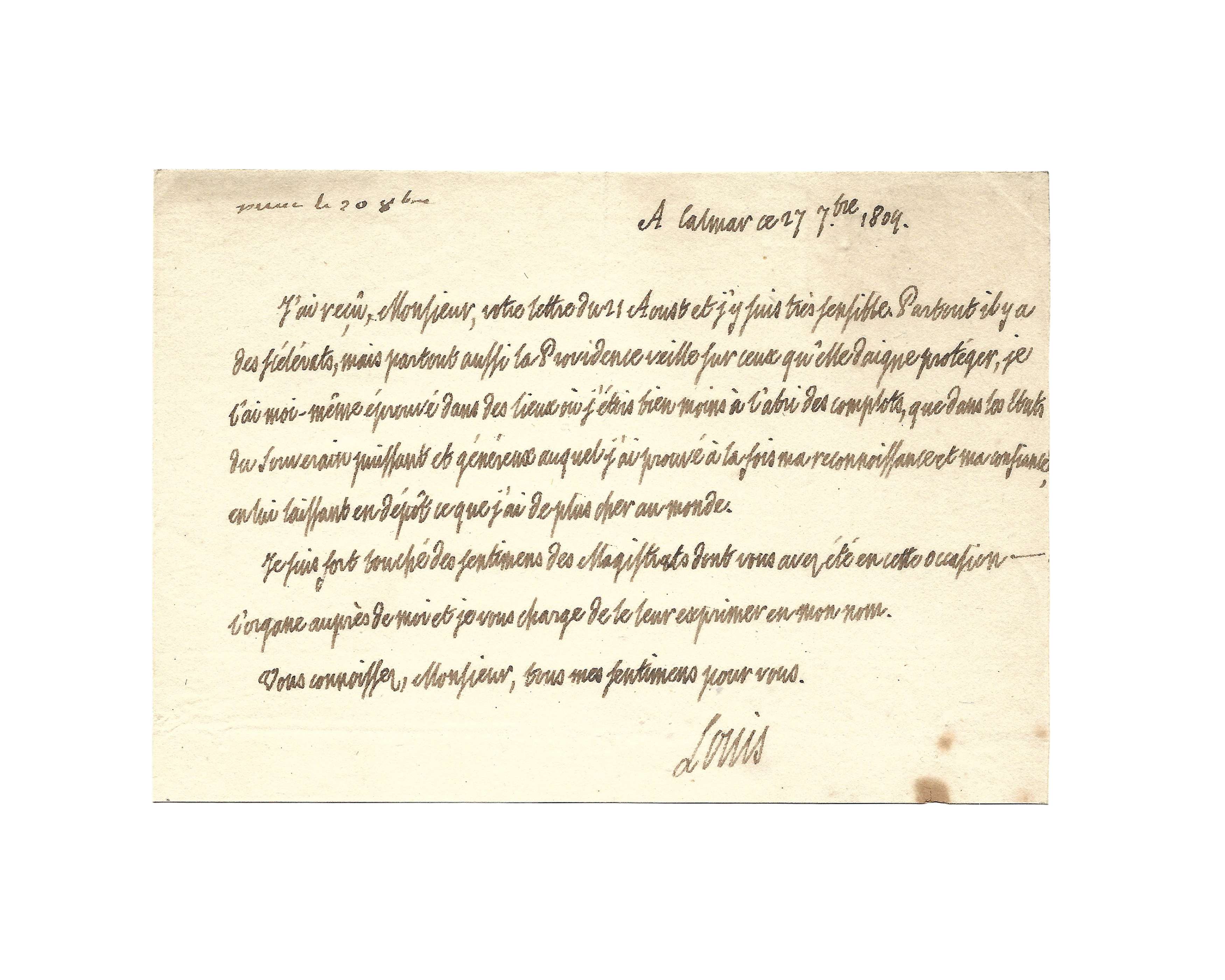 “J’ai reçu, Monsieur, votre lettre du 21 Aoust et j’y suis très sensible. Partout il y a des scélérats, mais partout aussi la Providence veille sur ceux qu’elle daigne protéger, je l’ai moi-même éprouvé dans des lieux où j’étais bien moins à l’abri des complots, que dans les Etats du souverain puissant et généreux auquel j’ai prouvé à la fois ma reconoissance et ma confiance, en lui laissant en dépôt ce que j’ai de plus cher au monde.