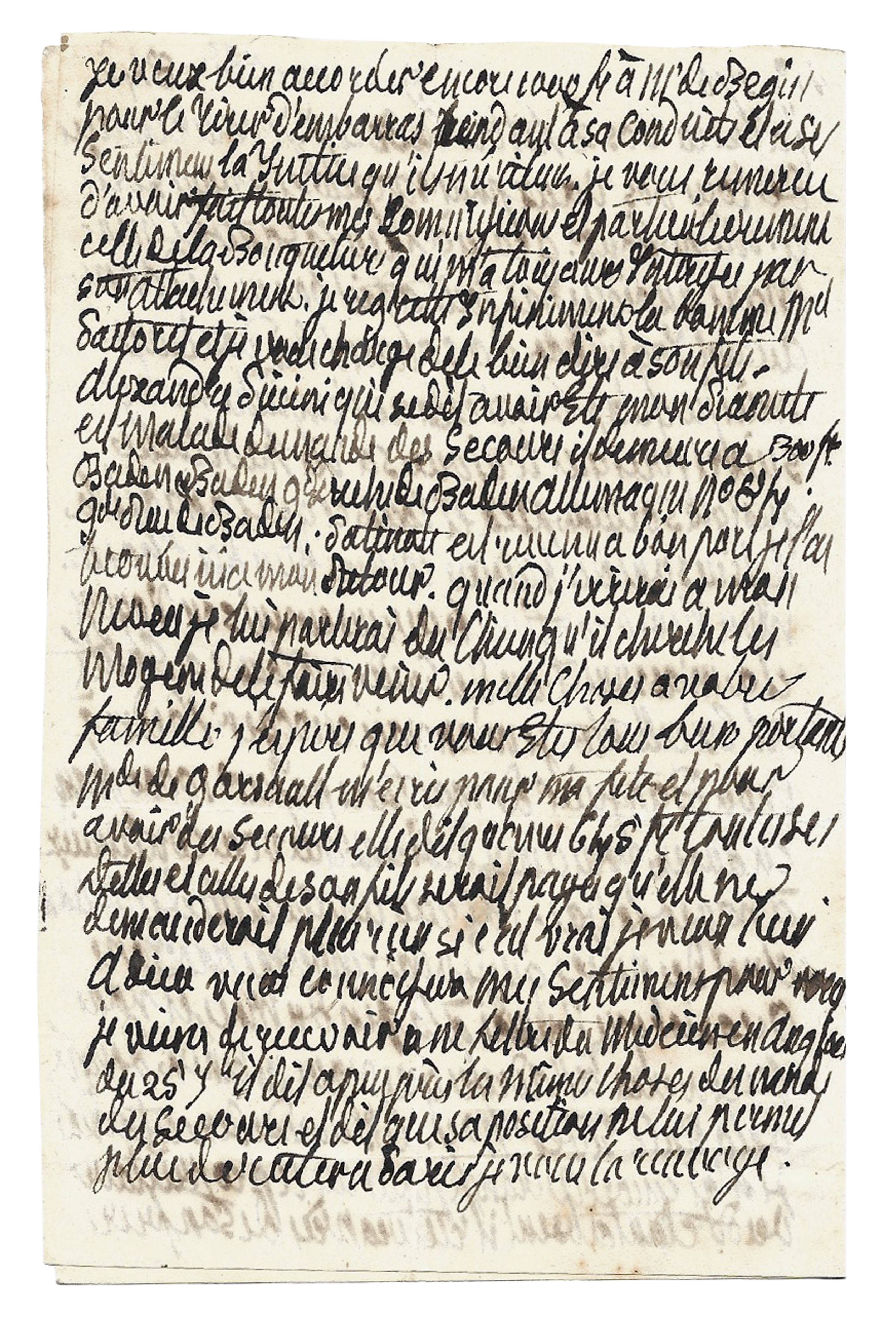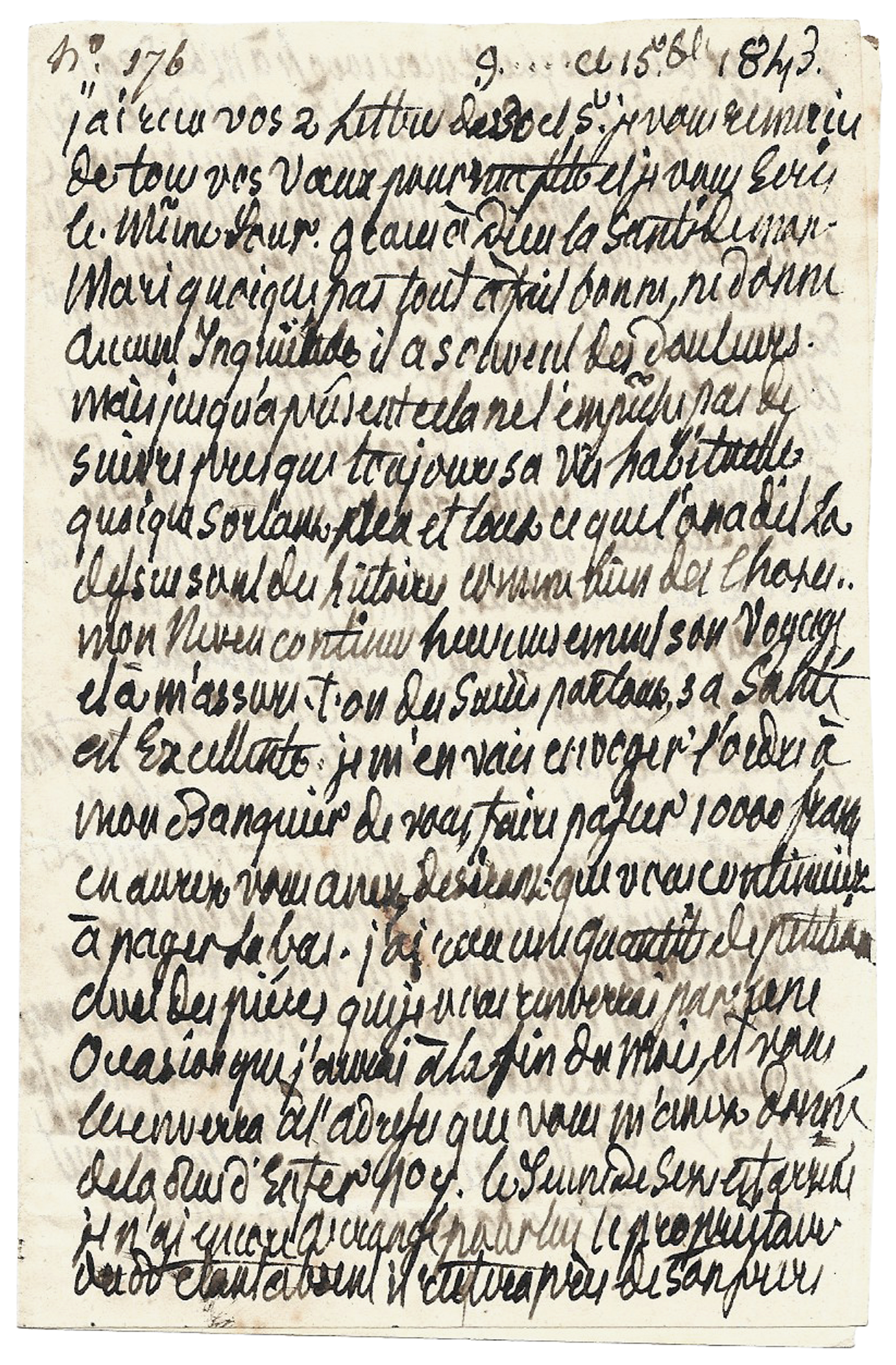 « J’ai reçu vos 2 lettres des 3 oct. et 5 oct. Je vous remercie de tous vos vœux pour ma petite [sans doute Louise d’Artois, petite fille de Charles X, née un 21 septembre], et je vous écris le même jour. […] Mon neveu [le comte d’Artois] continue heureusement son voyage… sa santé est excellente. Je m’en vais envoyer l’ordre à mon banquier de vous faire payer 10000 francs […] Je veux bien accorder encore 1000 fr à de Bouille pour le tirer d’embarras portant à sa condition… Je vous remercie d’avoir fait toutes mes commissions…[…] Mille choses à votre famille, j’espère que vous êtes tous bien portants… »