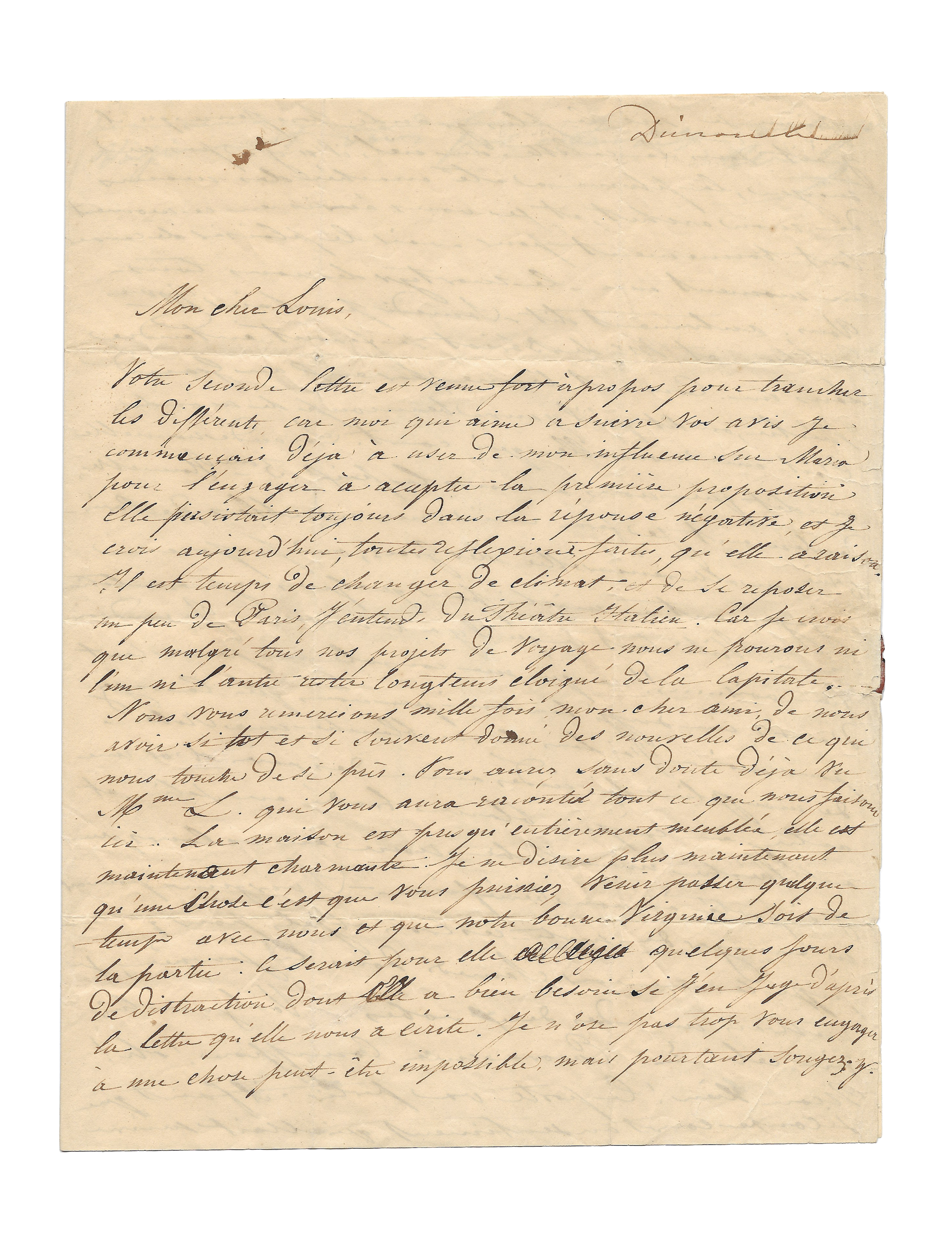 Louis Viardot, the recipient of this missive, was a well-known figure of the Romantic period, particularly as a translator. After Maria’s death, he married his sister Pauline Garcia.