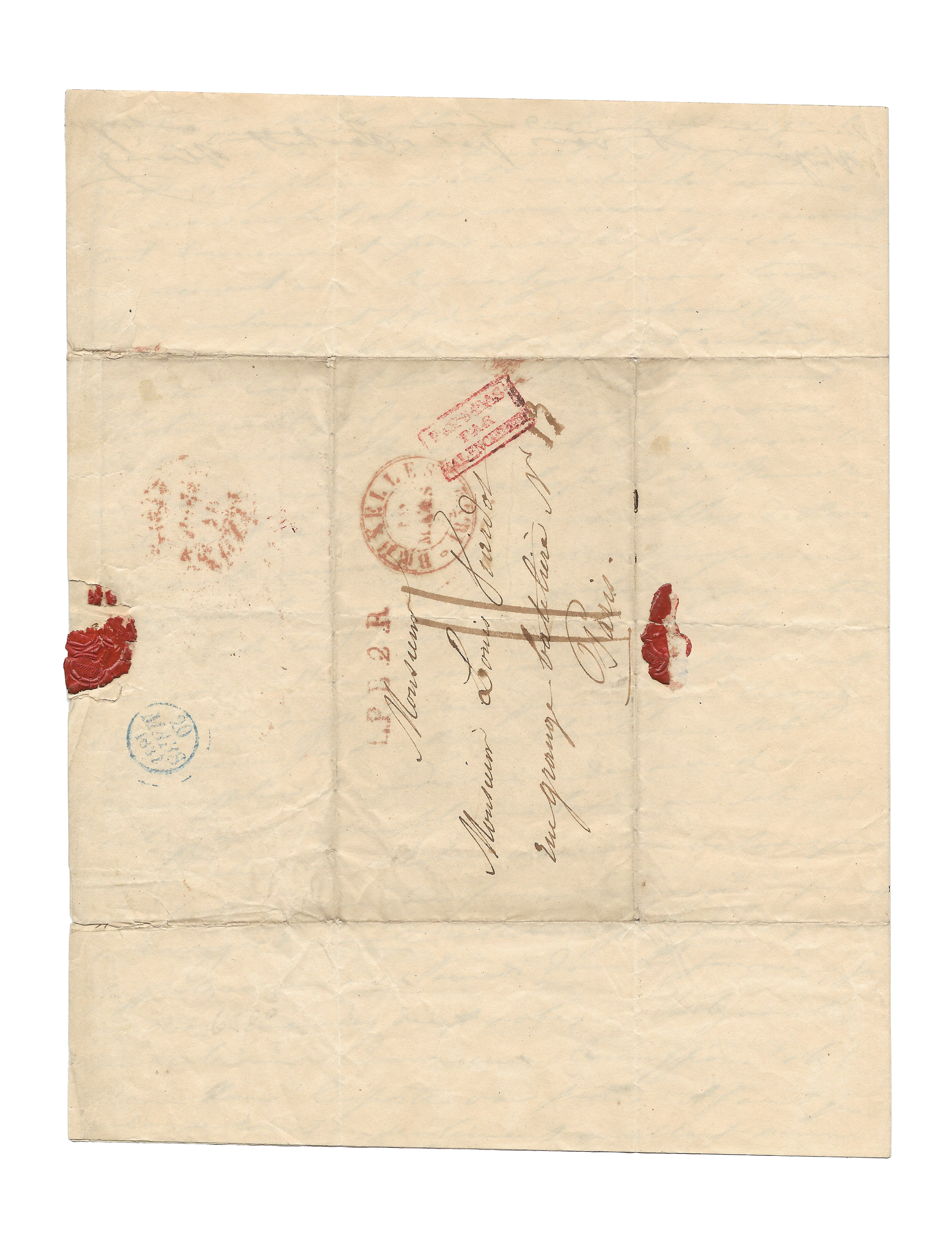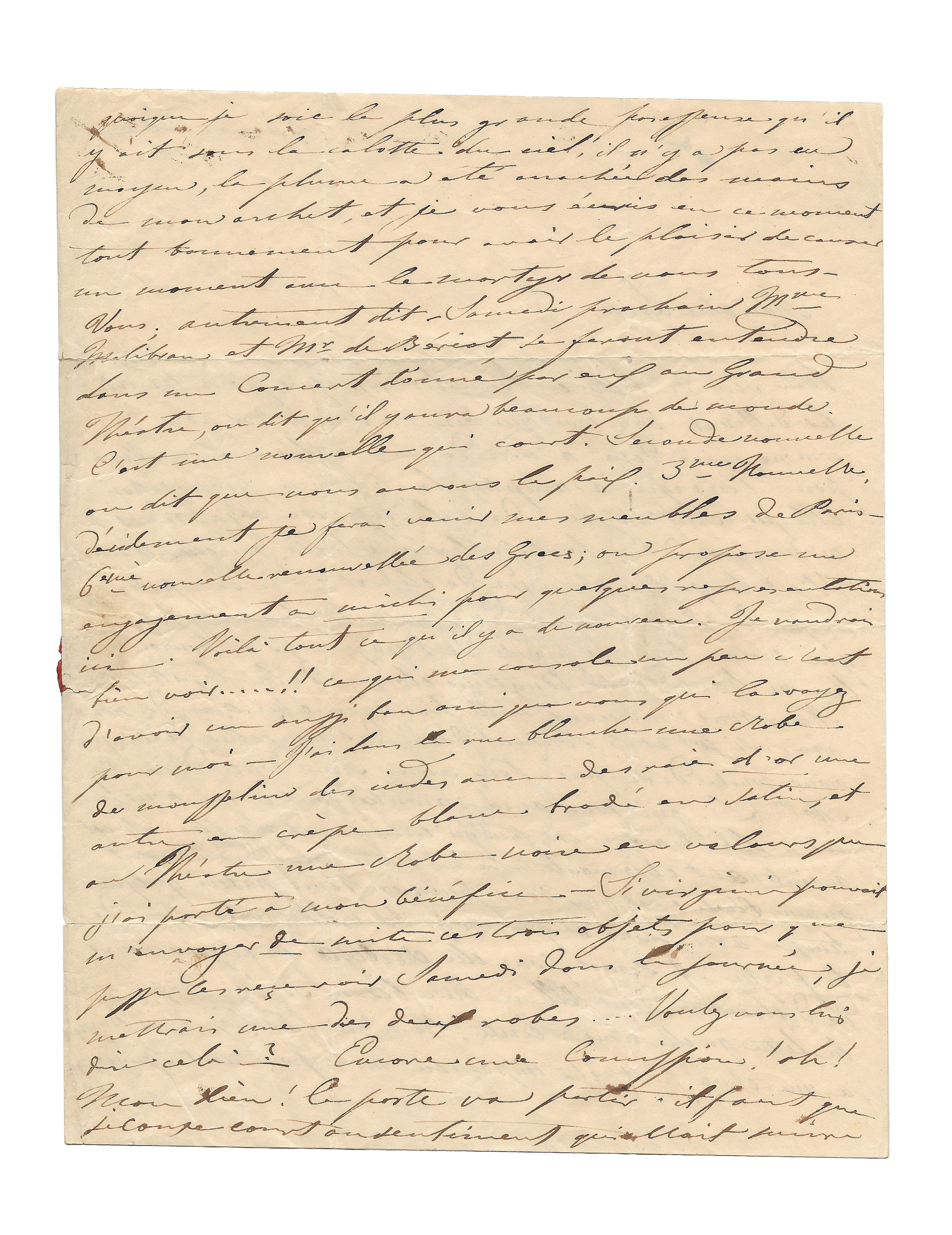 quoi que je soie la plus grande paresseuse qu’il y ait sous la calotte du ciel, il n’y a pas eu moyen, la plus a été arrachée des mains de mon archet, et je vous écris en ce moment tout bonnement pour avoir le plaisir de causer un moment avec le martyr de nous tous – Vous ; autrement dit – Samedi prochain Mme Malibran et Mr de Bériot se feront entendre dans un Concert donné par aux au Grand Théâtre, on dit qu’il y aura beaucoup de monde. C’est une nouvelle qui court. Seconde nouvelle on dit que nous aurons la paix. 3me nouvelle, décidément je ferai venir mes meubles de Paris – 6eme nouvelle renouvellée des Grecs [traité de Constantinople qui met fin à la guerre d’indépendance grecque], on propose un engagement au [mot illisible] pour quelques représentations ici. Voilà tout ce qu’il y a de nouveau. Je voudrais bien voir… !! ce qui me console un peu c’est d’avoir un aussi bon ami que vous qui la voyez pour moi – J’ai dans la rue blanche une robe de mousseline des indes avec des raies d’or, un autre en crèpe blanc brodé en satin, et au Théâtre une robe noire en velours que j’ai porté à mon bénéfice – Si Virginie pouvait m’envoyer de suite ces trois objets pour que je puisse les reçevoir Samedi dans la journée, je mettrais une des deux robes… Voulez vous lui dire celà ? – Encore une commission ! ah ! Mon dieu ! la poste va partir. il faut que je coupe court au sentiment qui allait suivre ma recommandation – Je vous embrasse Virginie et vous par ricochet. Maria. »