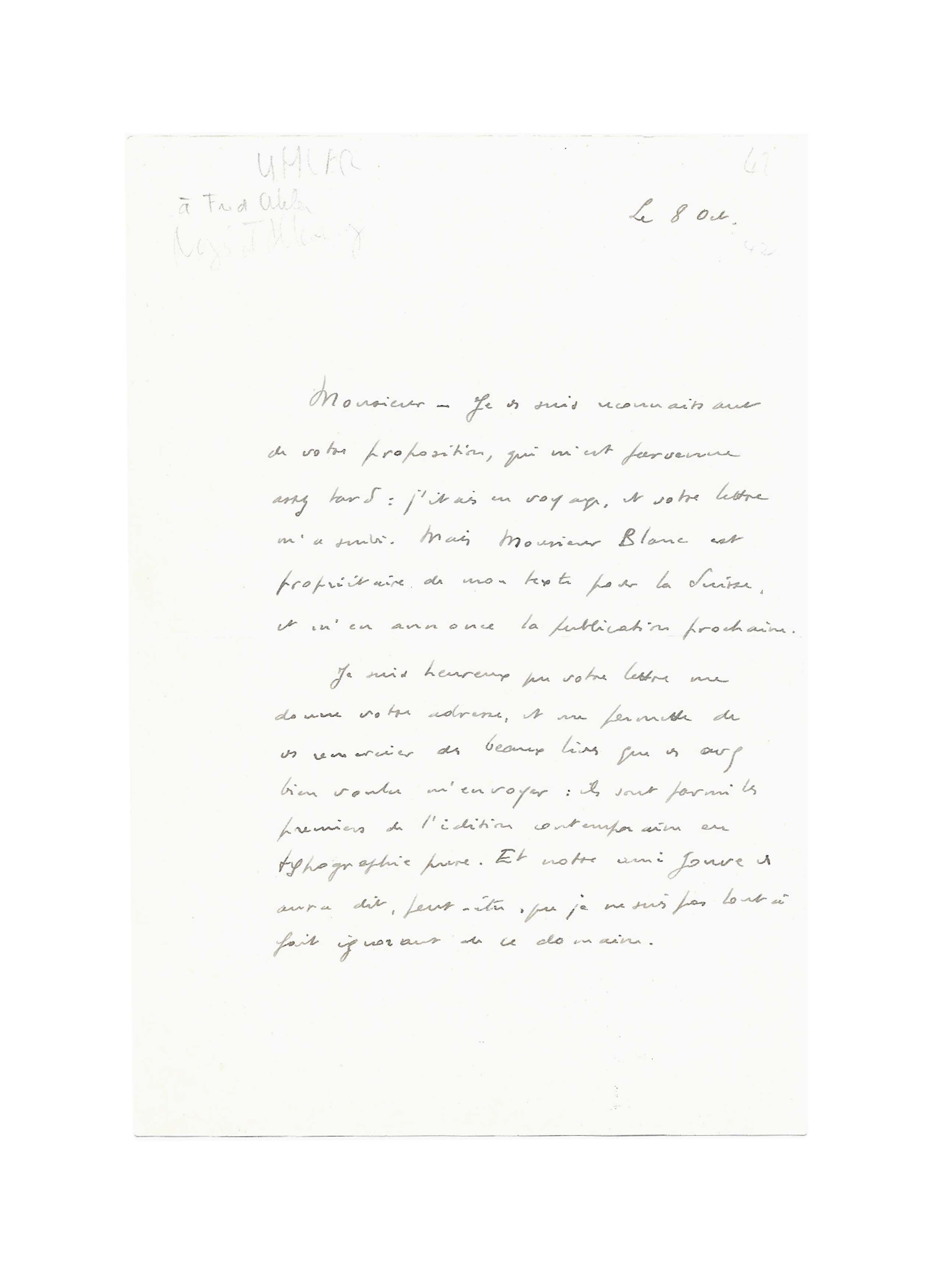 “Monsieur – Je v[ous]s suis reconnaissant de votre proposition, qui m’est parvenue assez tard : J’étais en voyage, et votre lettre m’a suivi. Mais Monsieur Blanc [aux éditions du Haut-Pays à Lausanne] est propriétaire de mon texte pour la Suisse, et m’en annonce la publication prochaine.