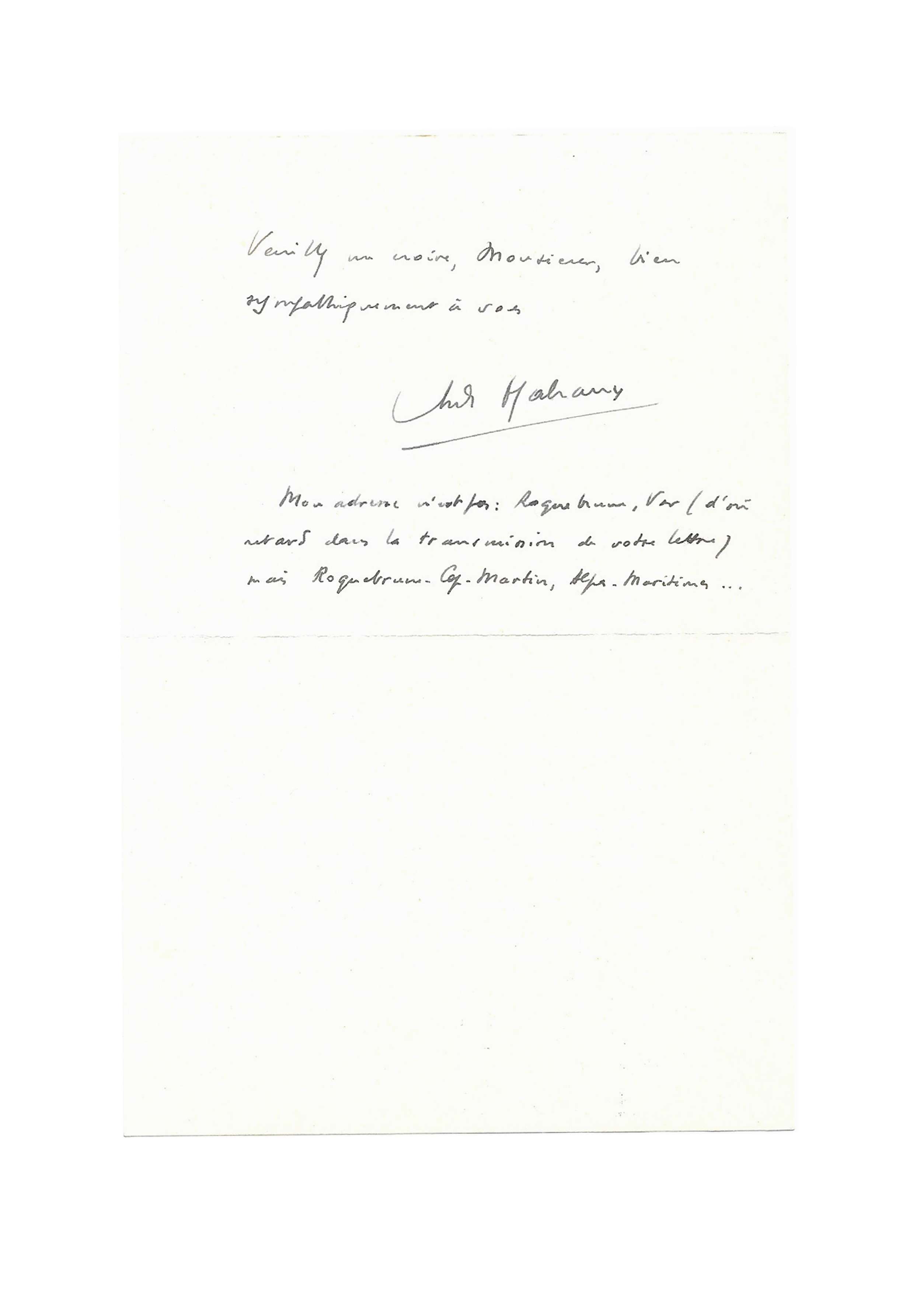 Mon adresse n’est pas : Roquebrune, Var (d’où retard dans la transmission de votre lettre), mais Roquebrune-Cap-Martin, Alpes Maritimes…”