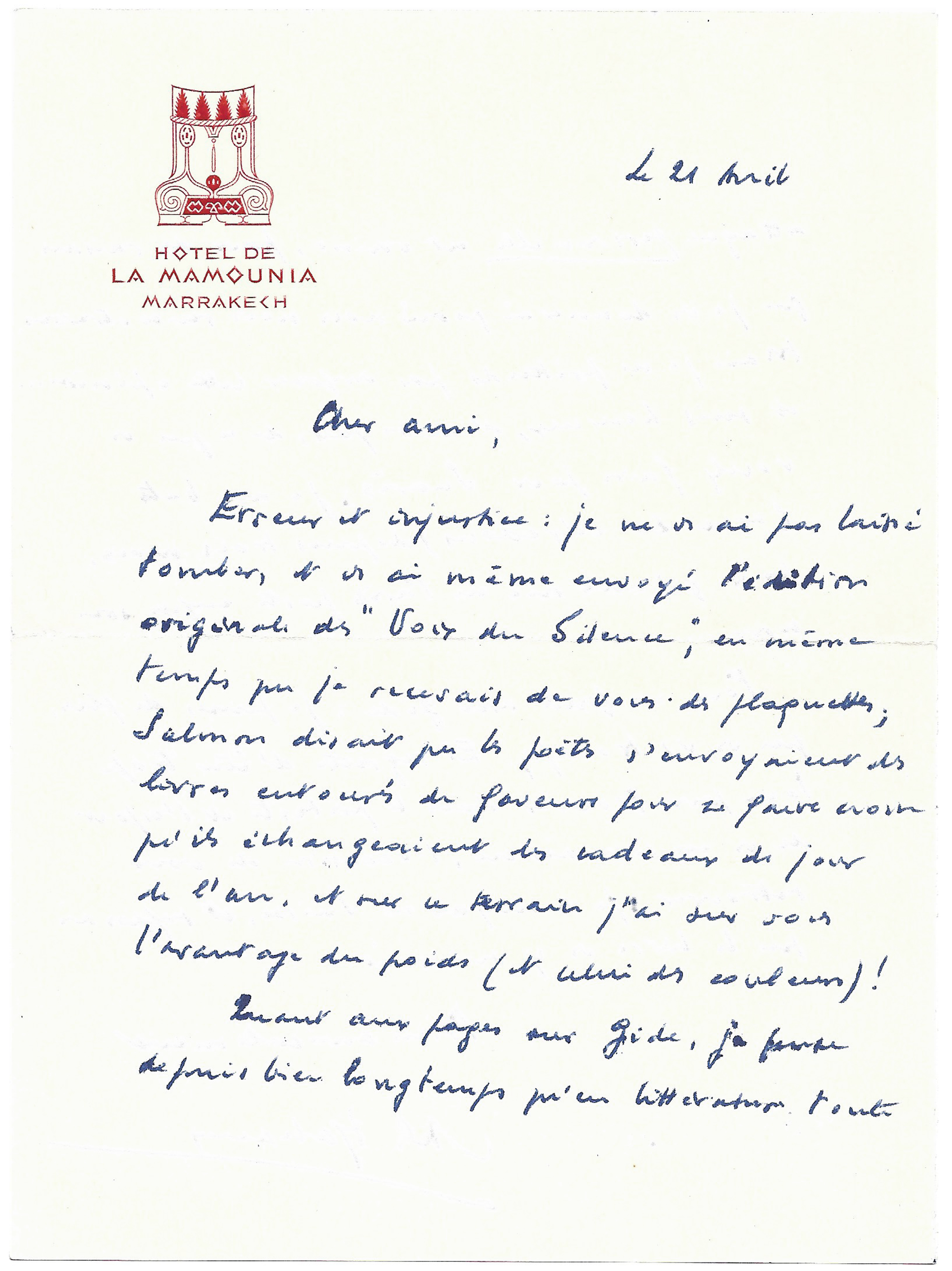 Erreur et injustice : je ne vous ai pas laissé tomber, et vous ai même envoyé l’édition originale des « Voix du Silence », en même temps que je recevais de vous des plaquettes ; [André] Salmon disait que les poètes s’envoyaient des livres entourés de faveurs pour se faire croire qu’ils échangeaient des cadeaux du jour de l’an. Et sur ce terrain j’ai sur vous l’avantage du poids (et celui des valeurs) !
