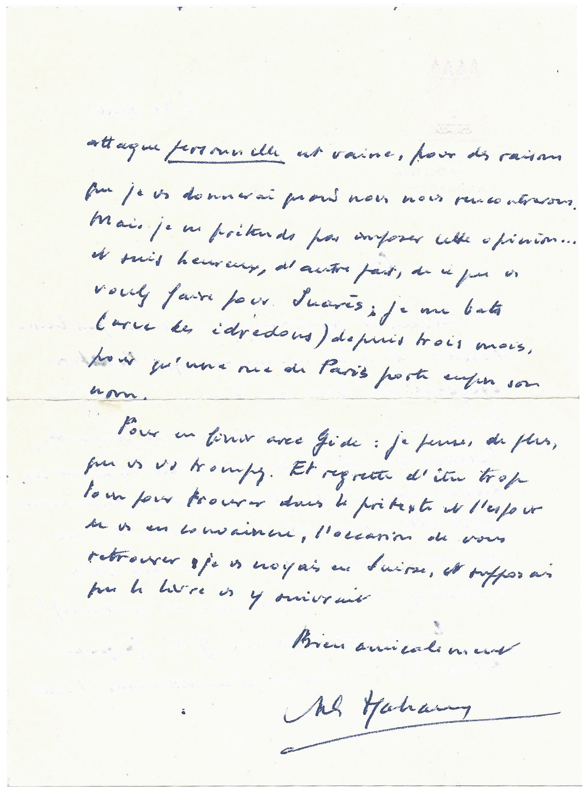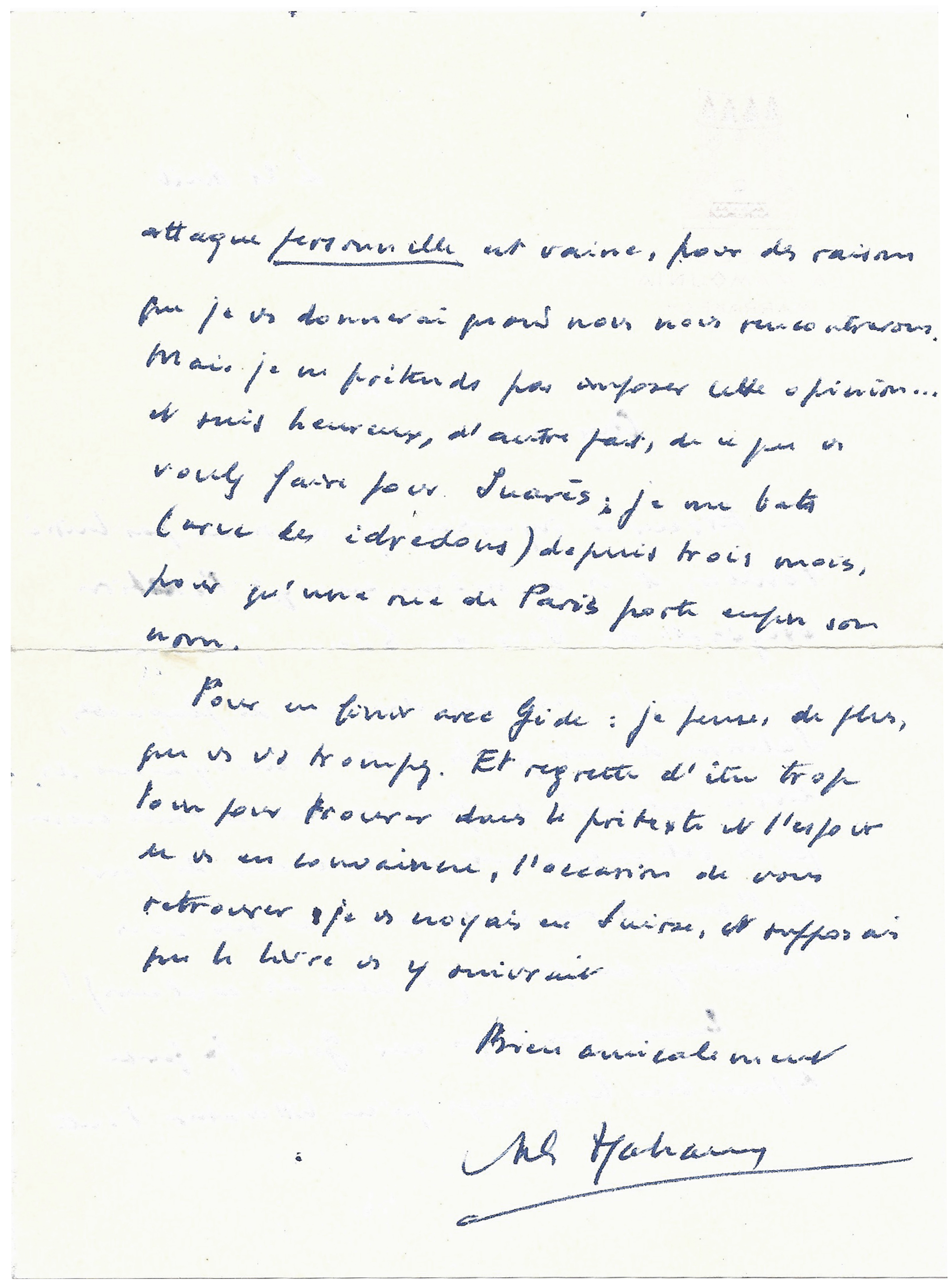 Quant aux pages sur [André] Gide, je pense depuis bien longtemps qu’en littérature toute attaque personnelle est vaine, pour des raisons que je vous donnerai quand nous nous rencontrerons. Mais je ne prétends pas imposer cette opinion… et suis très heureux, d’autre part, de ce que vous voulez faire pour Suarès ; je me bats (avec des édredons) depuis trois mois, pour qu’une rue de Paris porte enfin son nom.