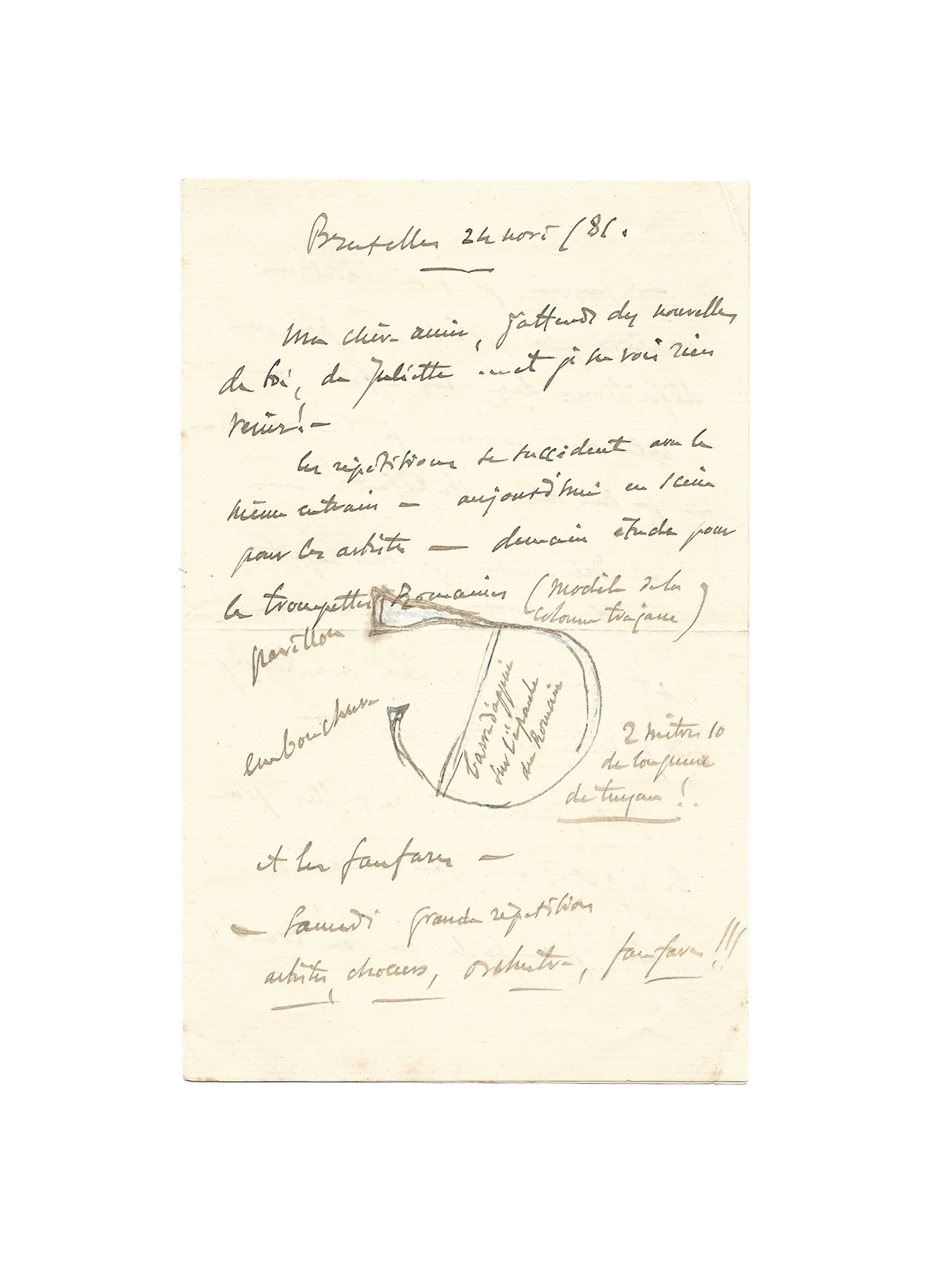The letter is enriched with an original drawing by Massenet, showing a Roman trumpet